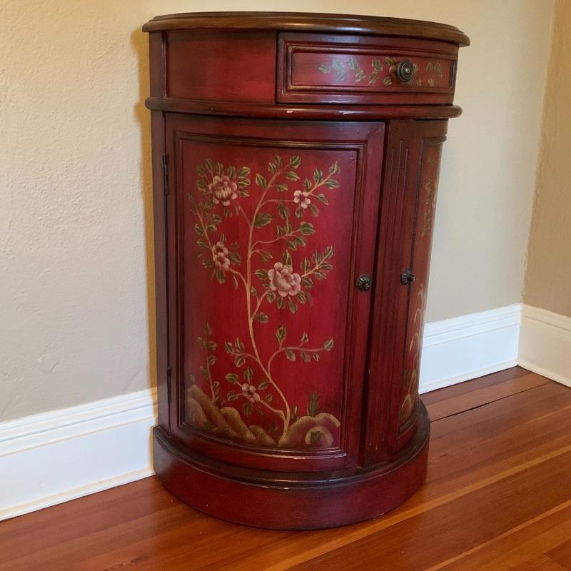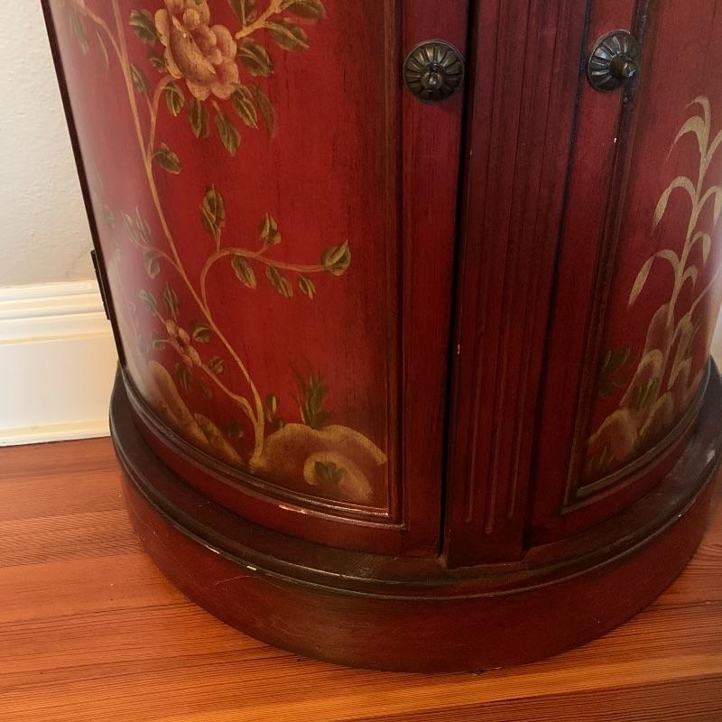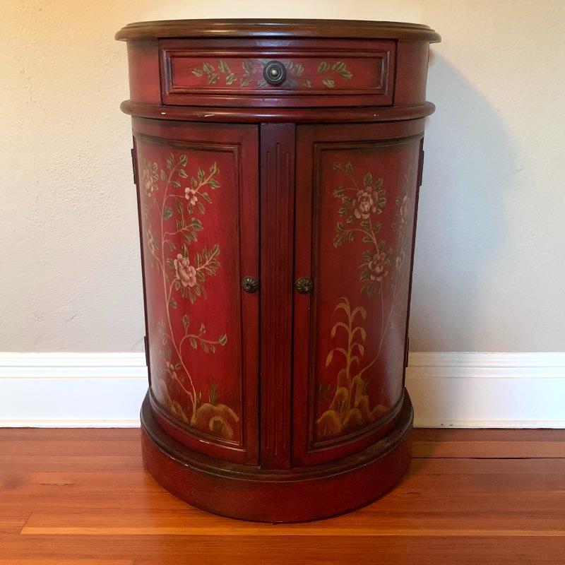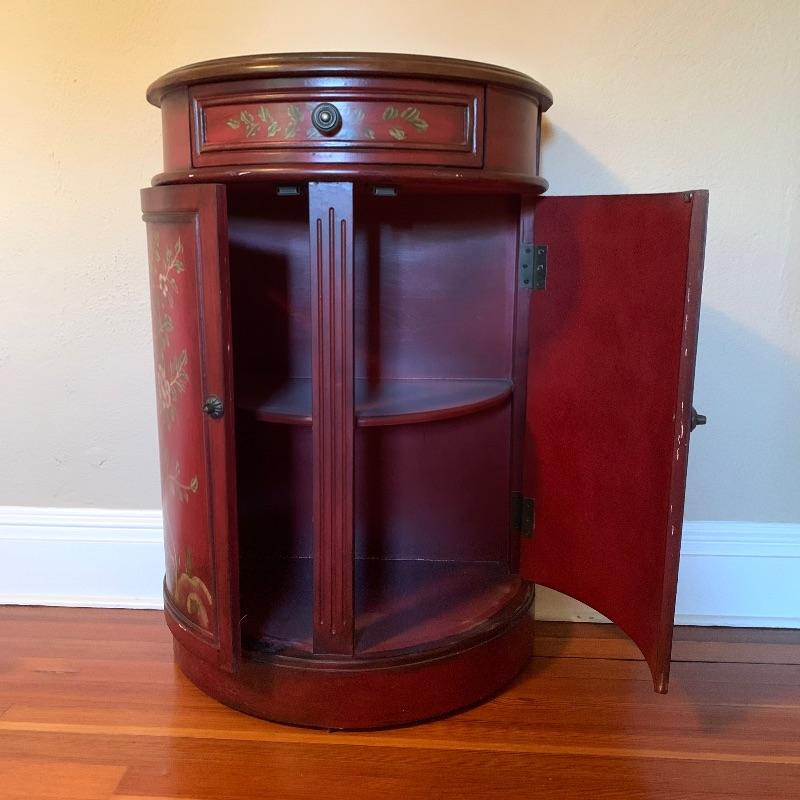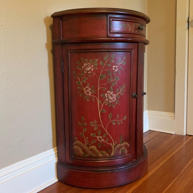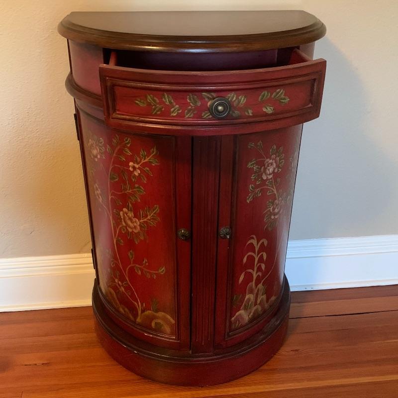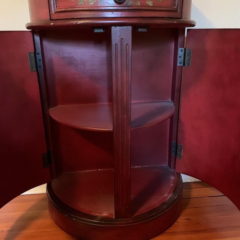 This is a pretty red cylindrical cabinet with floral decorations that appear to be hand painted. There is a drawer at the top and two cabinet doors that open to reveal a shelf inside. The handles to both doors have broken off and have been saved in the drawer. You might be able to glue them on, or you might prefer to replace the handles. The cabinet measures approximately 22.5” x 13.5” x 32.5”. Item is located on top floor of the house. Local pickup only.
