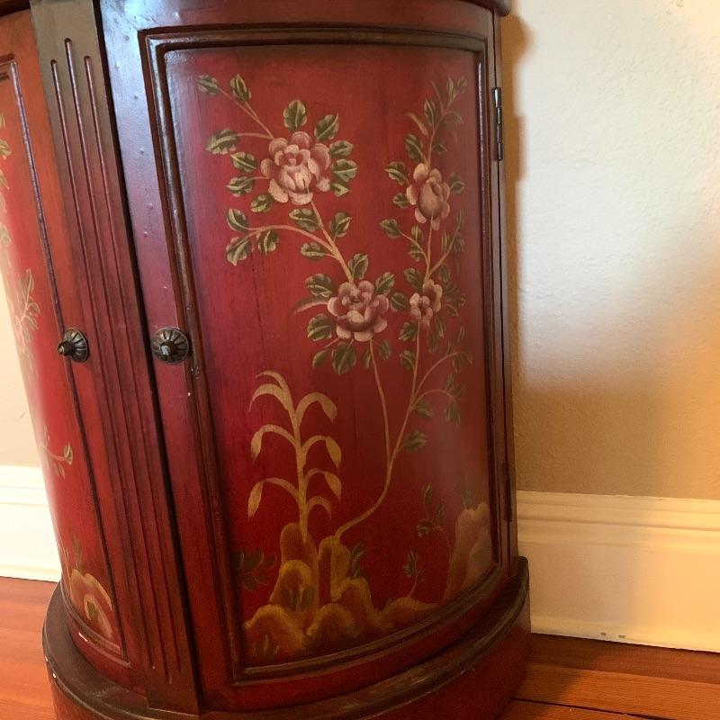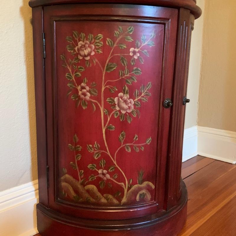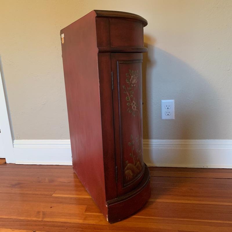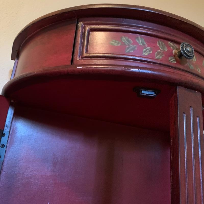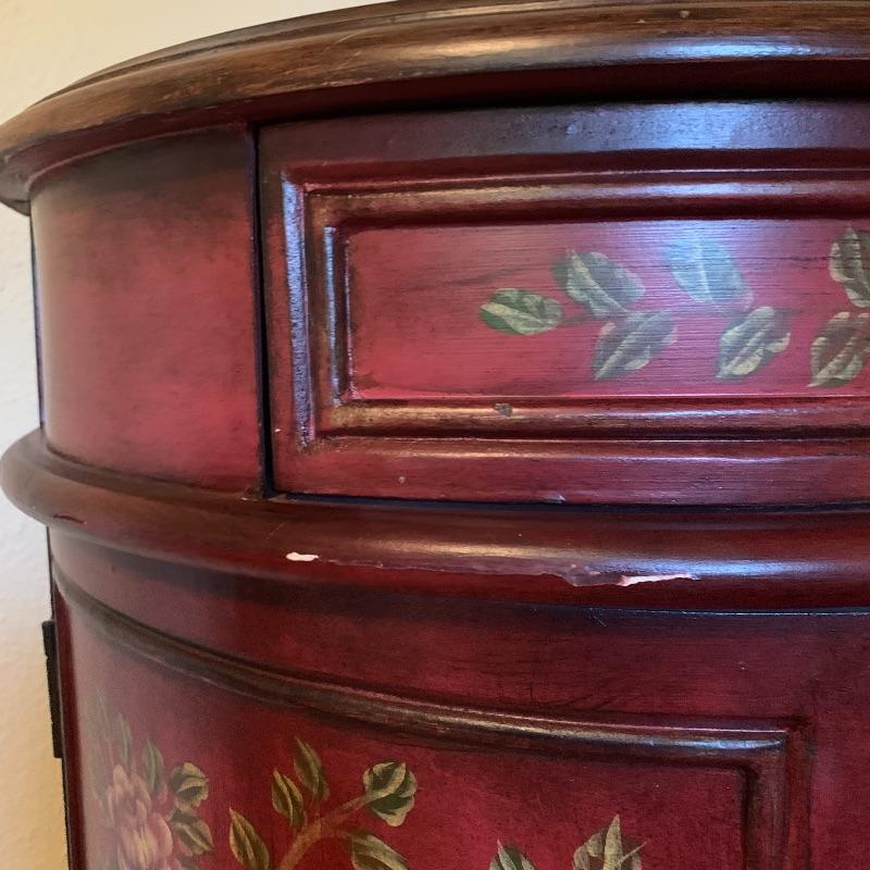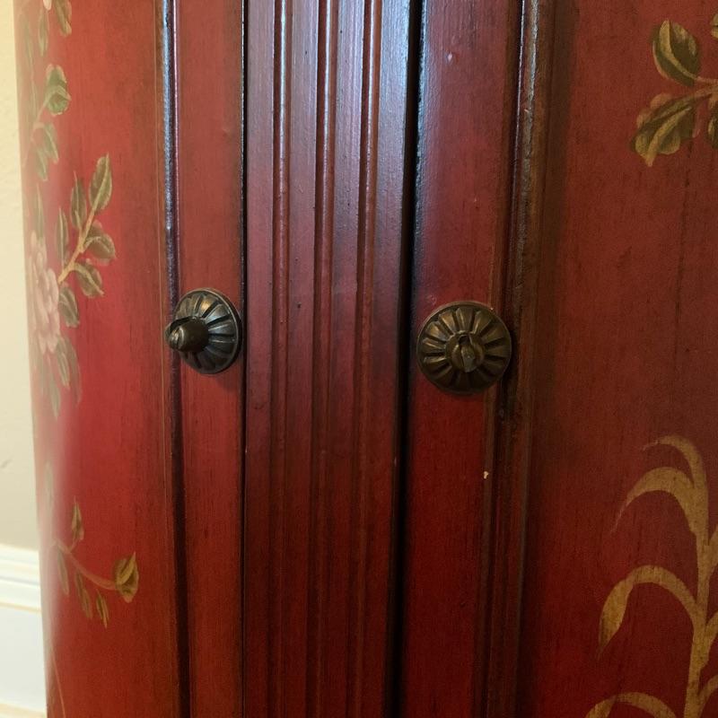 This is a pretty red cylindrical cabinet with floral decorations that appear to be hand painted. There is a drawer at the top and two cabinet doors that open to reveal a shelf inside. The handles to both doors have broken off and have been saved in the drawer. You might be able to glue them on, or you might prefer to replace the handles. The cabinet measures approximately 22.5” x 13.5” x 32.5”. Item is located on top floor of the house. Local pickup only.