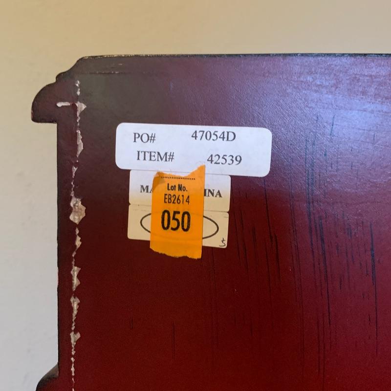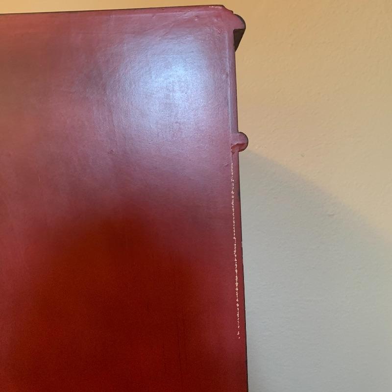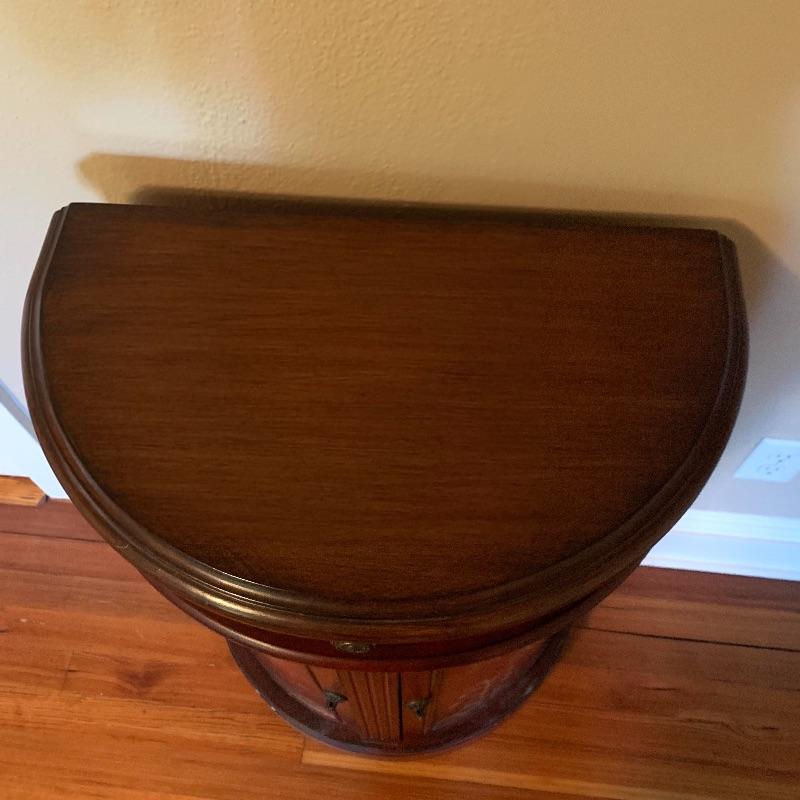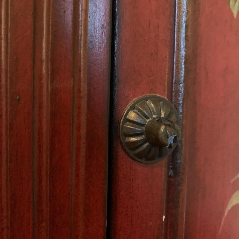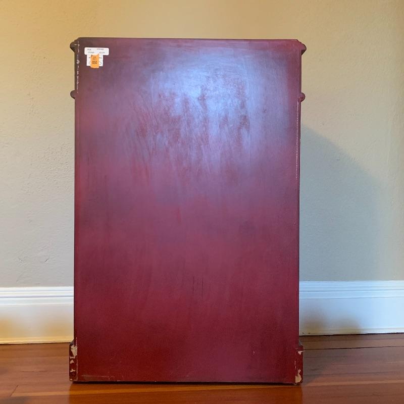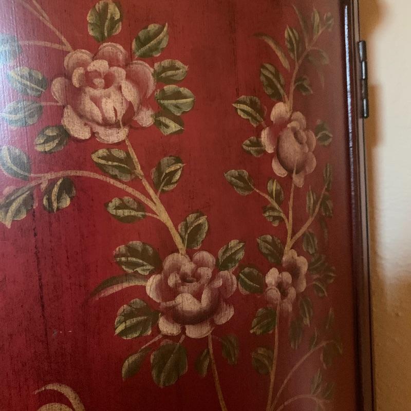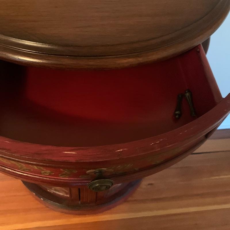 This is a pretty red cylindrical cabinet with floral decorations that appear to be hand painted. There is a drawer at the top and two cabinet doors that open to reveal a shelf inside. The handles to both doors have broken off and have been saved in the drawer. You might be able to glue them on, or you might prefer to replace the handles. The cabinet measures approximately 22.5” x 13.5” x 32.5”. Item is located on top floor of the house. Local pickup only.