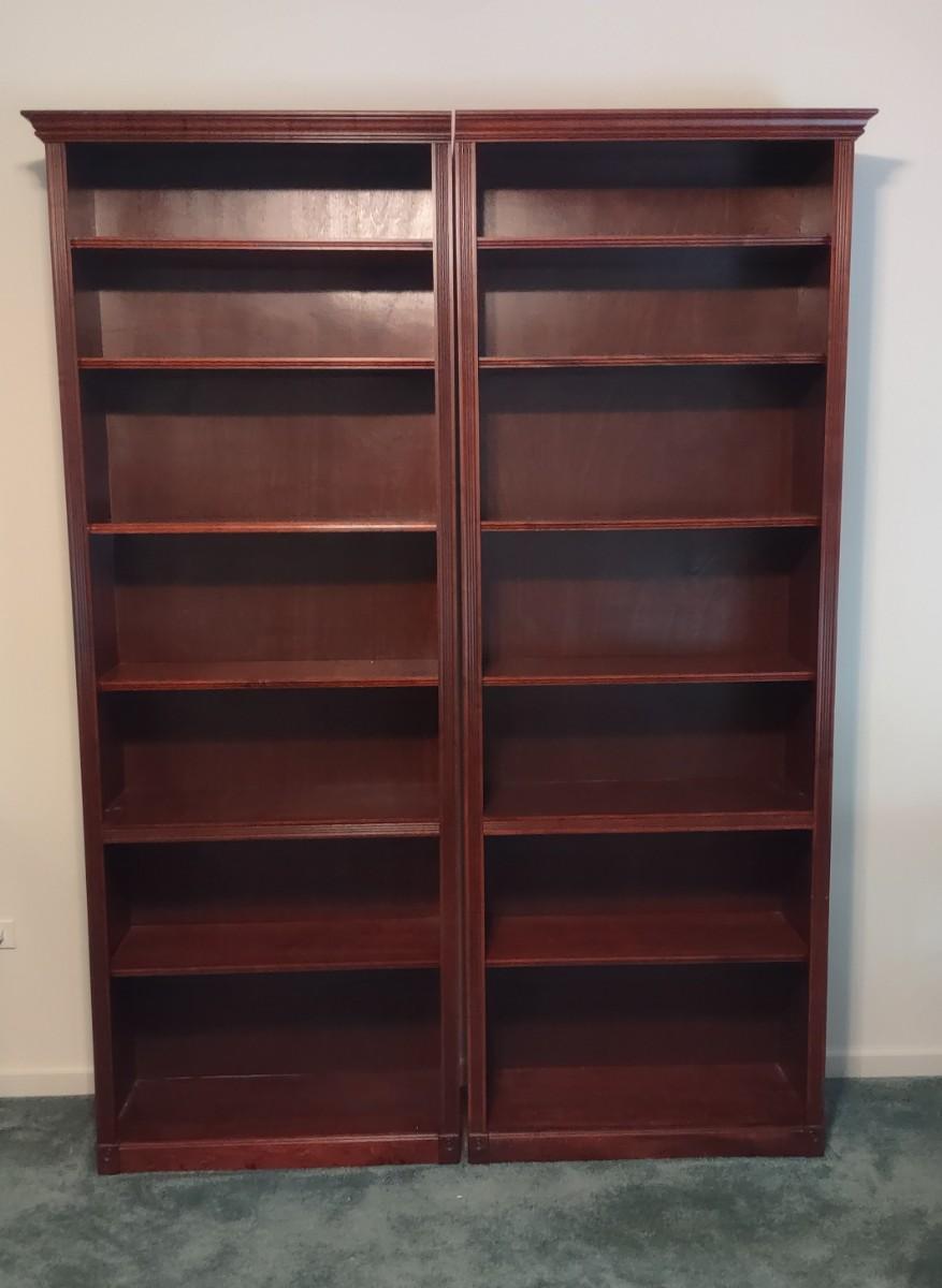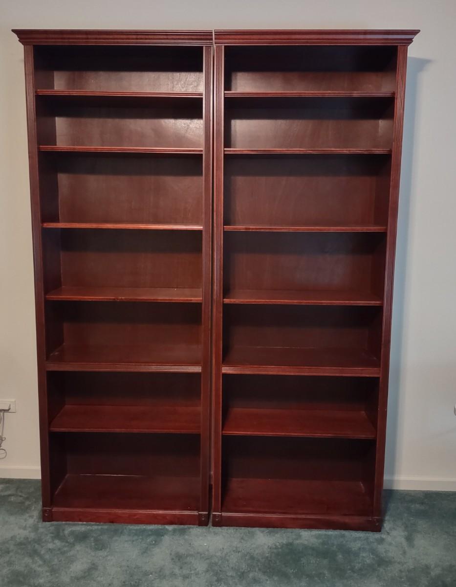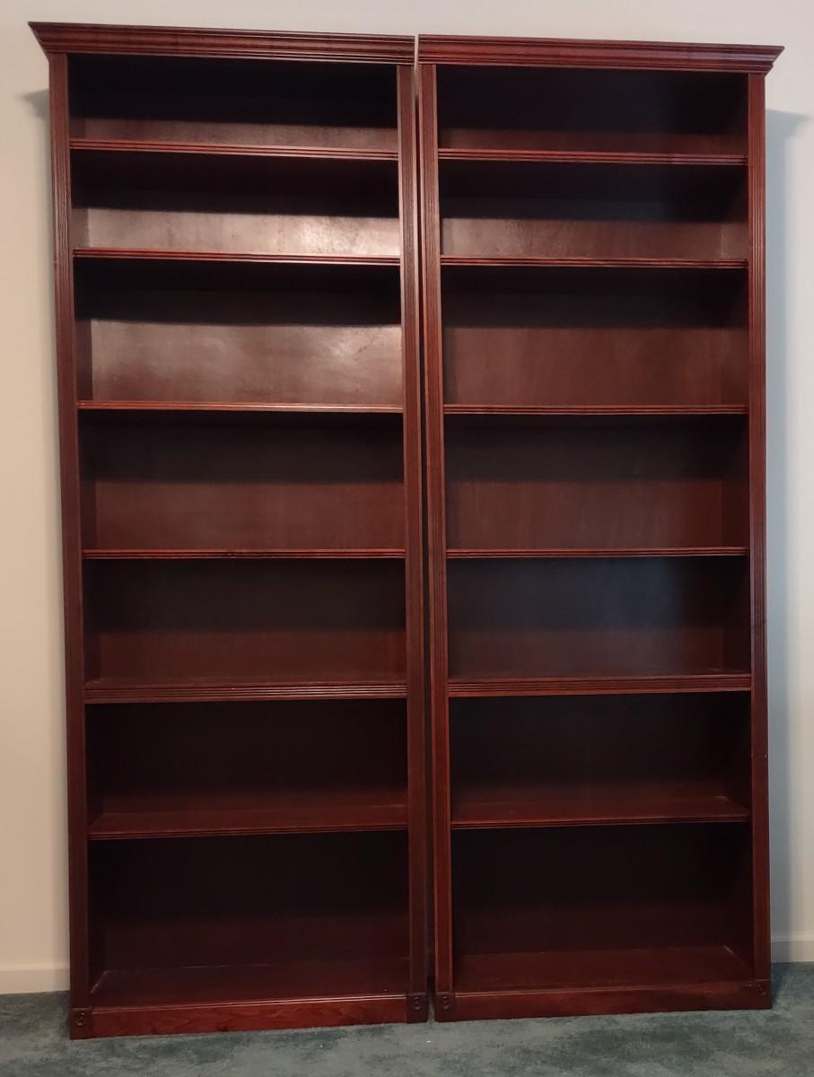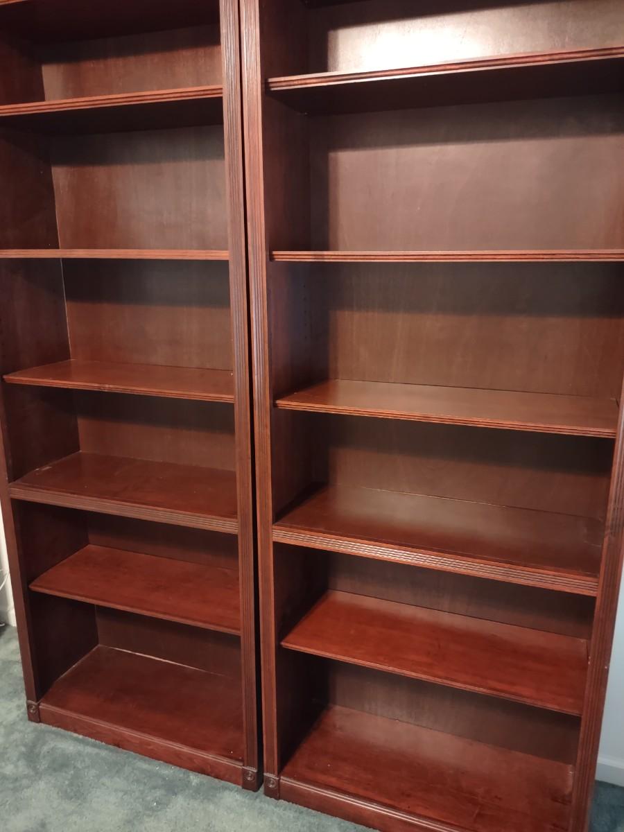 Pair Of Georgian Cherry Book Shelves 30×12×84. These are perfect for books, frames, collectibles, anywhere in the home. Not solid wood, but hard to tell. Please see all pictures as they are the best representation of the items. The pictures show condition, measurements if taken, and what is included in the lot. Due to the large amount that we photograph and the time frame, we are not always able to take measurements. All items unless noted, are pre-owned and have been used. If you purchased furniture, you must bring help. We do not allow one person to carry large furniture out on their own. Bring help, tools and a truck for the safety of our client’s homes, and your personal safety. Company policy. Thank you.