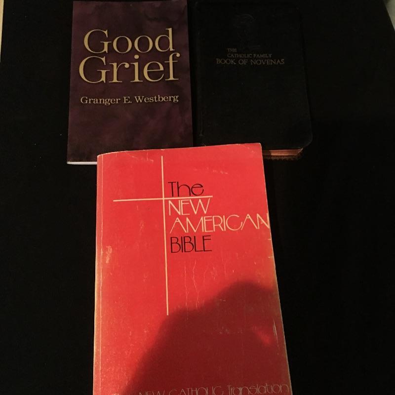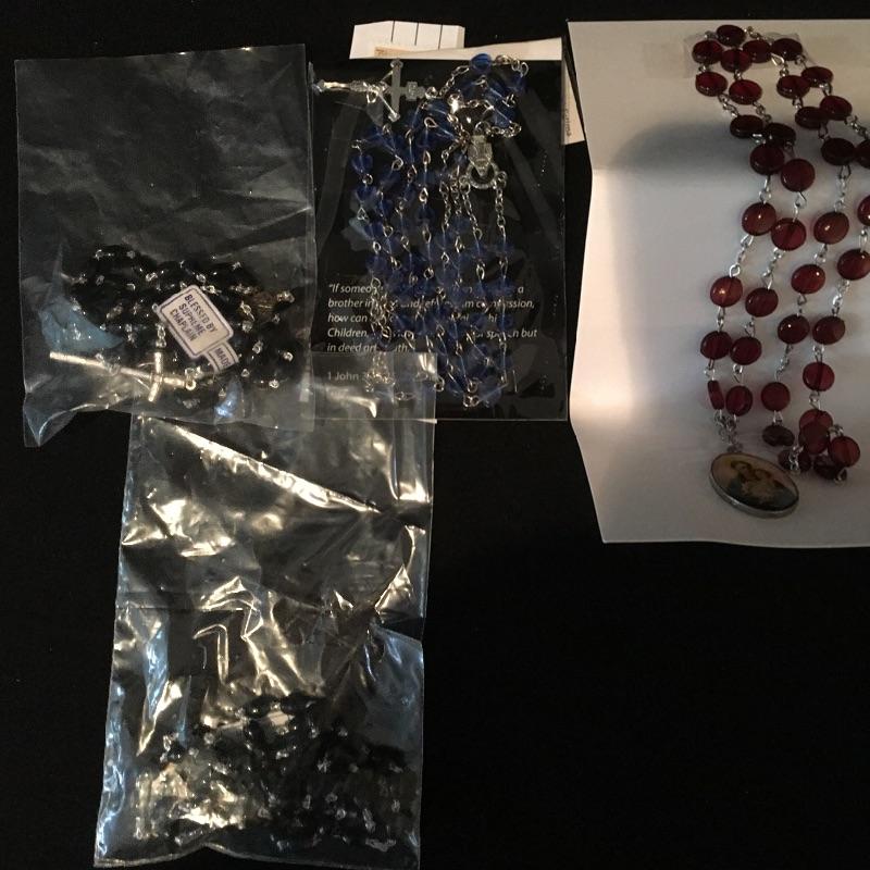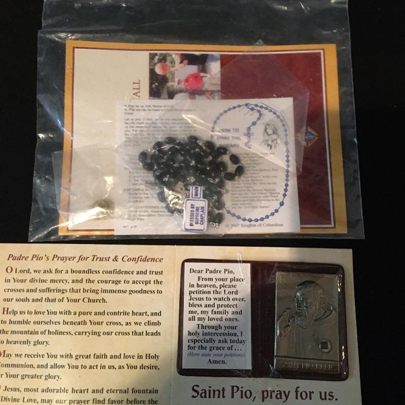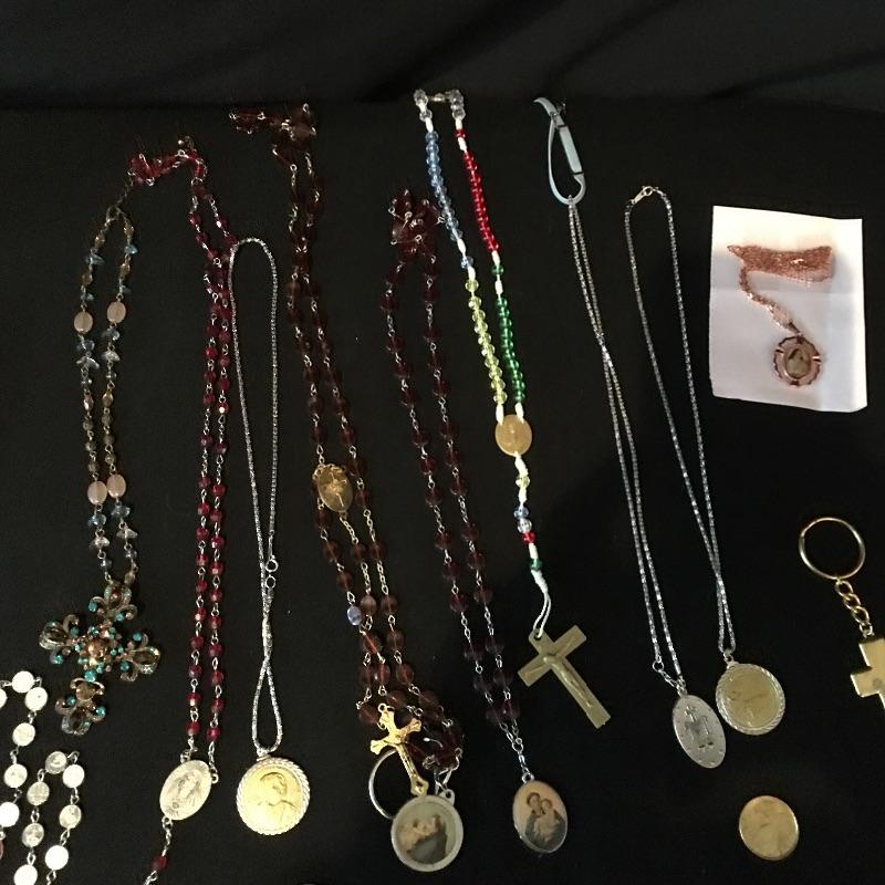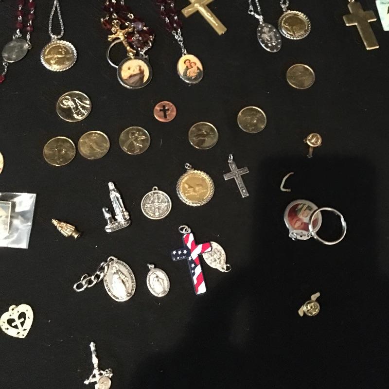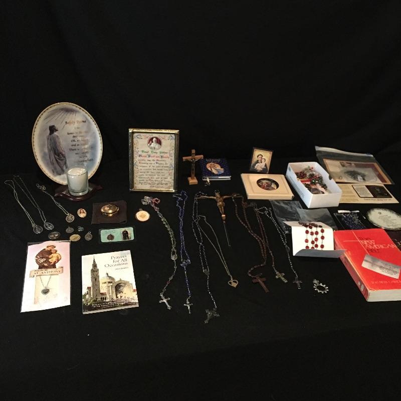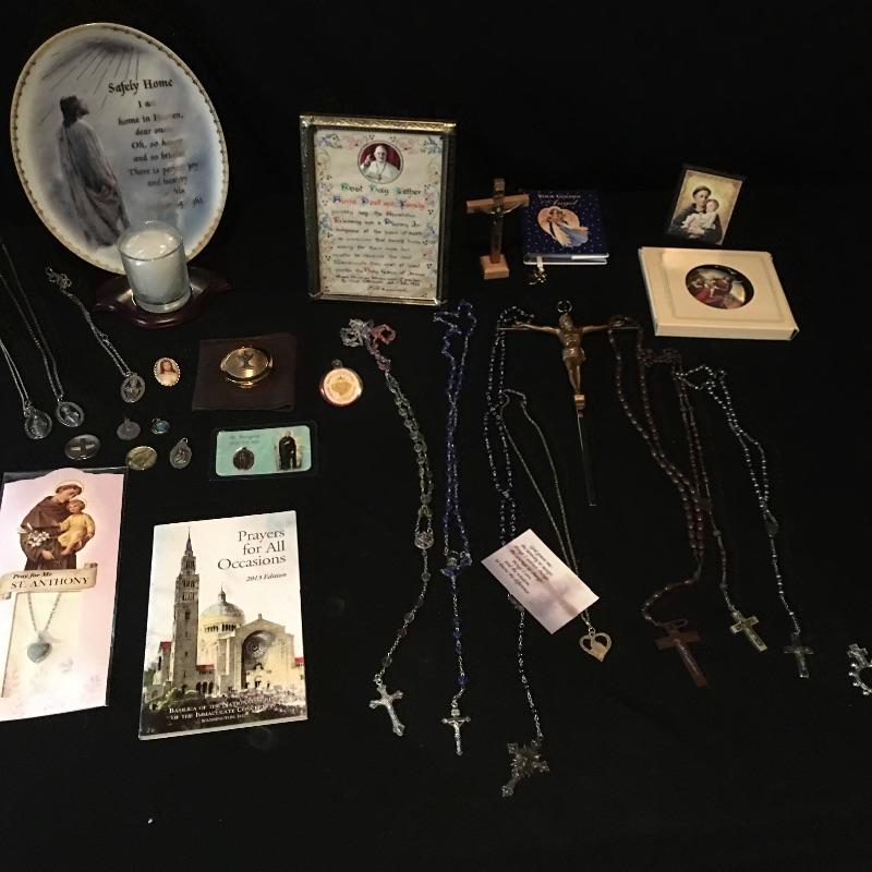 Religious array includes bible, safety home plate and candle that measures 5” x 7” x 9” , cross, a plethora of prayer beads and medals, pill box and more.