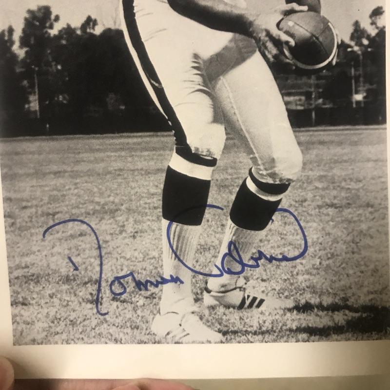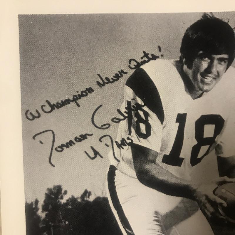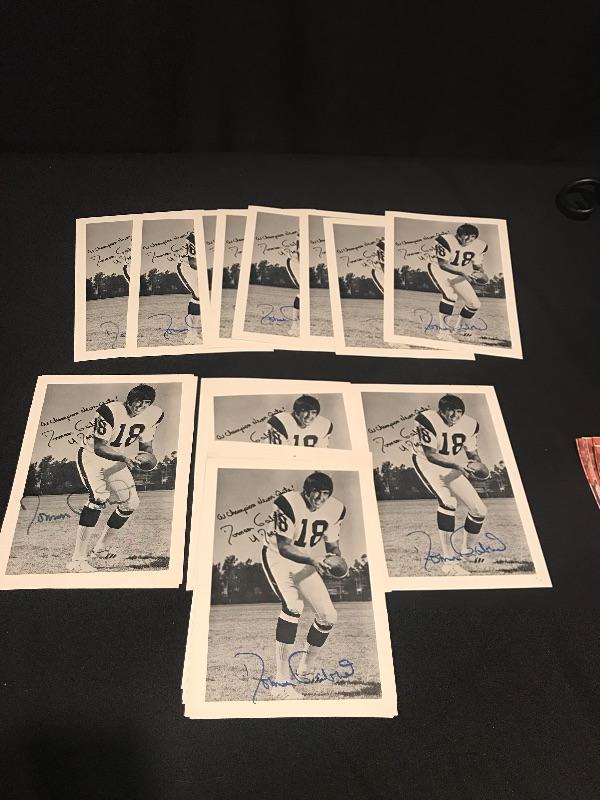 Twenty signed Roman Gabriel football photos (all appear to be unique signatures). Message on top of each photo says “A champion never quits. Roman Gabriel LA Rams” No COA. Lot also includes seven photos of him behind the counter at Burger King. Shipping available.