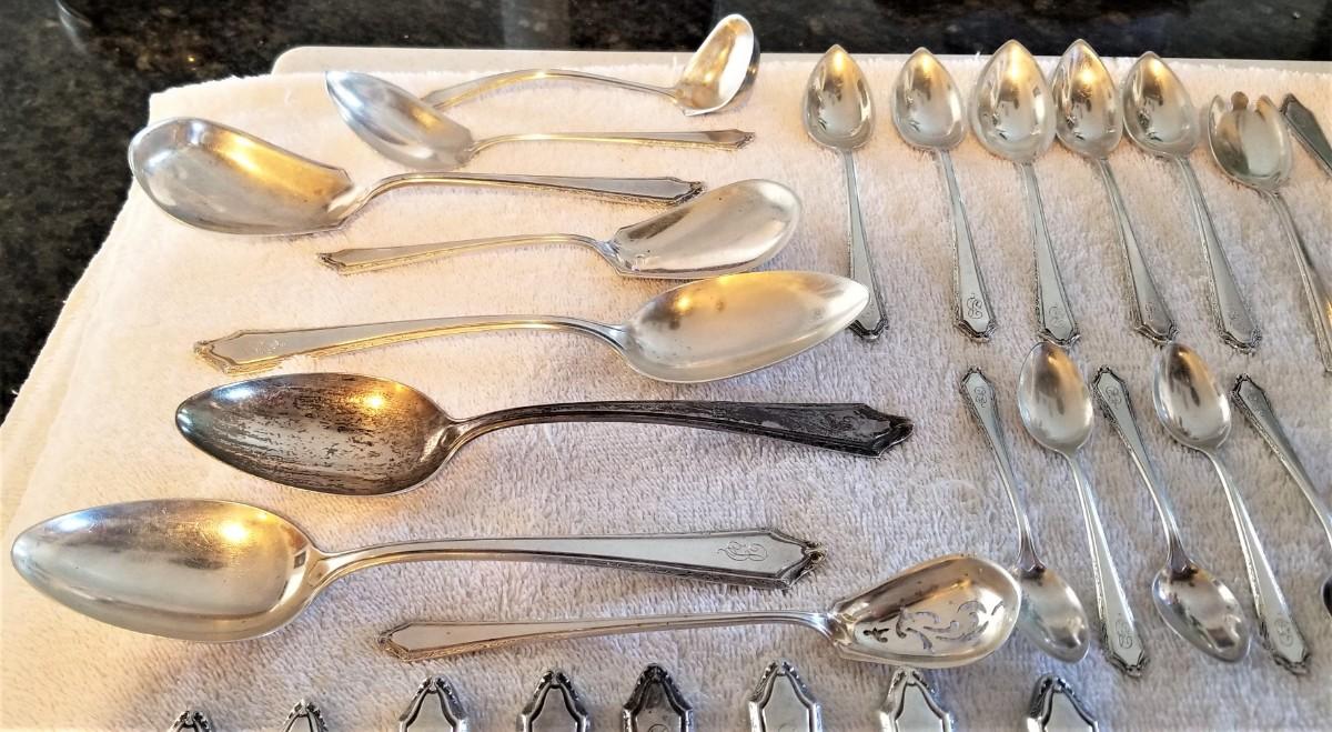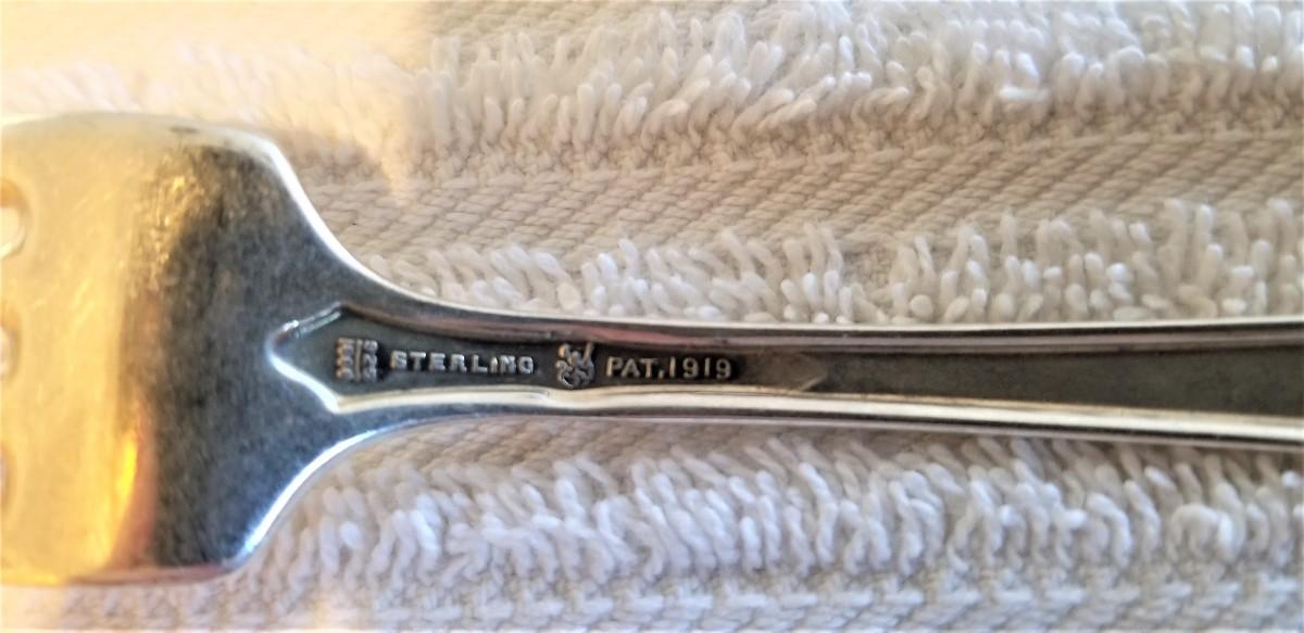 You get all you see here. The design was patented in 1919 and bears a "B" monogram. Total weight is 49.8 Troy Oz. Opening bid is just about the scrap price for this set. 8 knives, 6 forks, 8 salad forks, 8 teaspoons, 5 demitasse spoons, 7 Ice cream forks, 3 iced tea spoons, 3 serving spoons, 5 grapefruit spoons, 1 small ladle, 1 jam spoon, 1 pierced spoon, and 2 serving pieces (a larger and a smaller) that look like shovels. All in good antique condition.