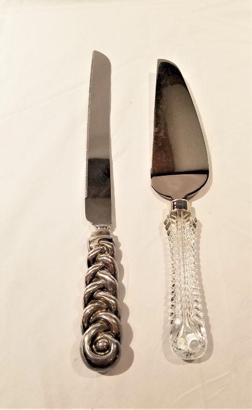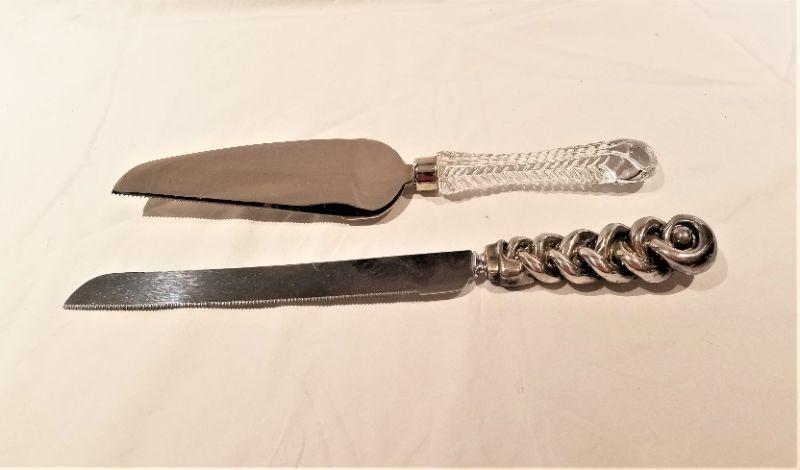 Two piece lot here - nice long cake knife with sterling silver handle (Sheffield) along with a cake server with crystal handle. Sterling piece is 12 3/4" long. Cake server is 11 1/4" long. Price is for the pair.