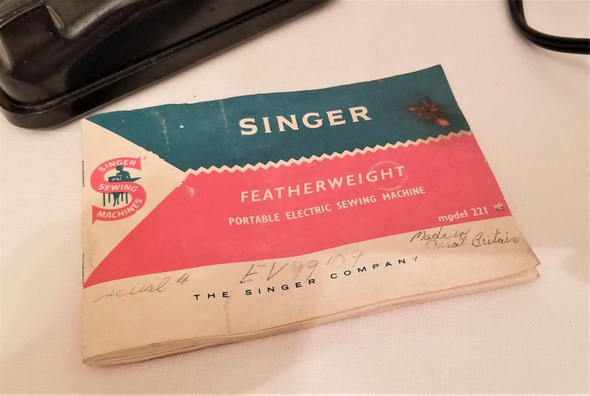 You don't see many of these in white - vintage Singer Featherweight, Model 221, Sewing Machine with book. Working condition. Made in 1964 - no case.