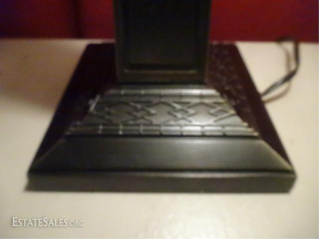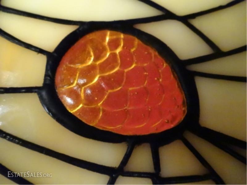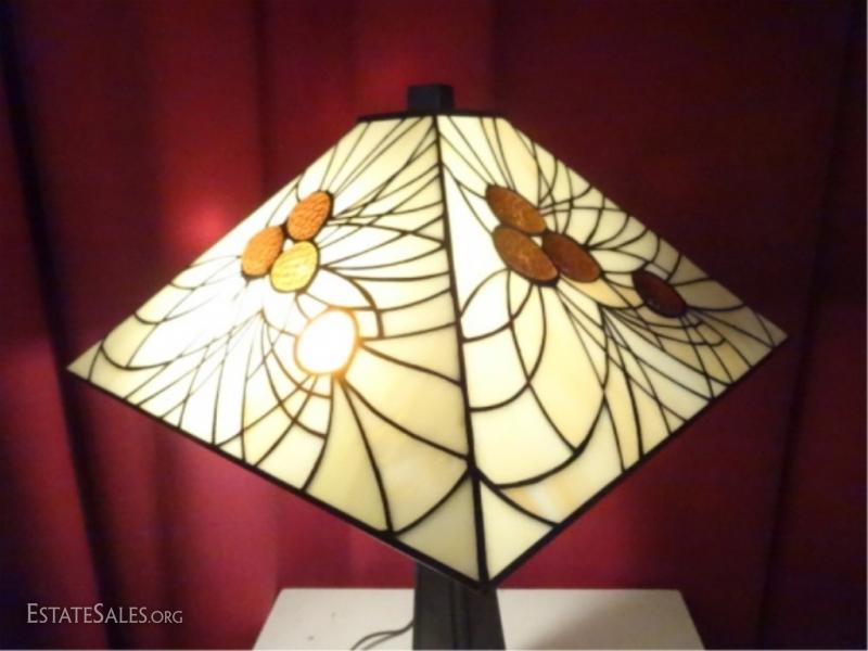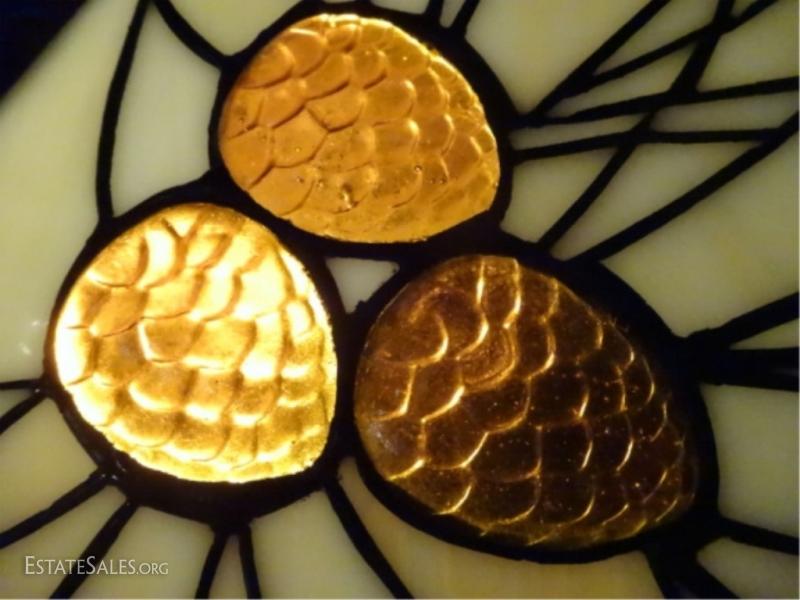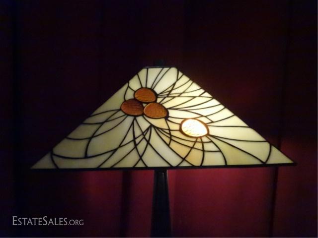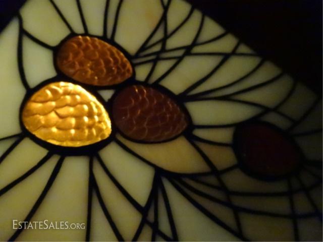 LOT 116: TIFFANY STYLE LEADED GLASS TABLE LAMP BY SPLENDOUR LIGHTING, ARTS AND CRAFTS STYLE, SQUARE SHADE WITH GOLD PINE CONES, EXCELLENT NEW CONDITION WITH BOX, 23"H X 16"W, SKU773.53