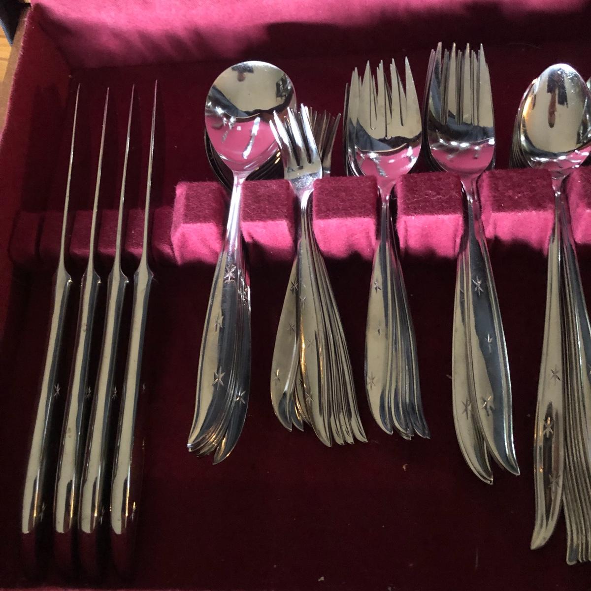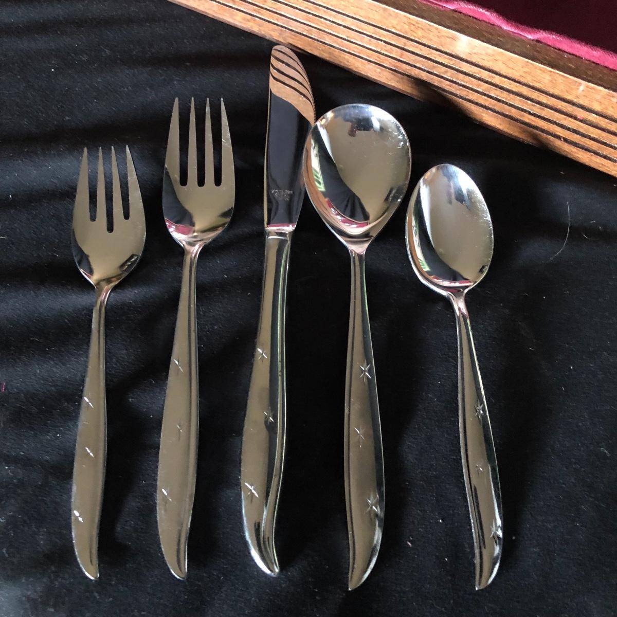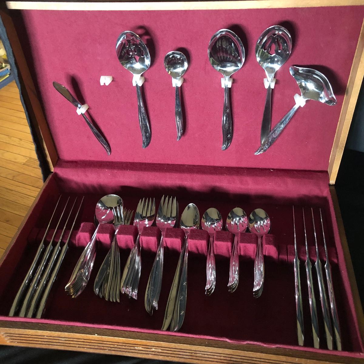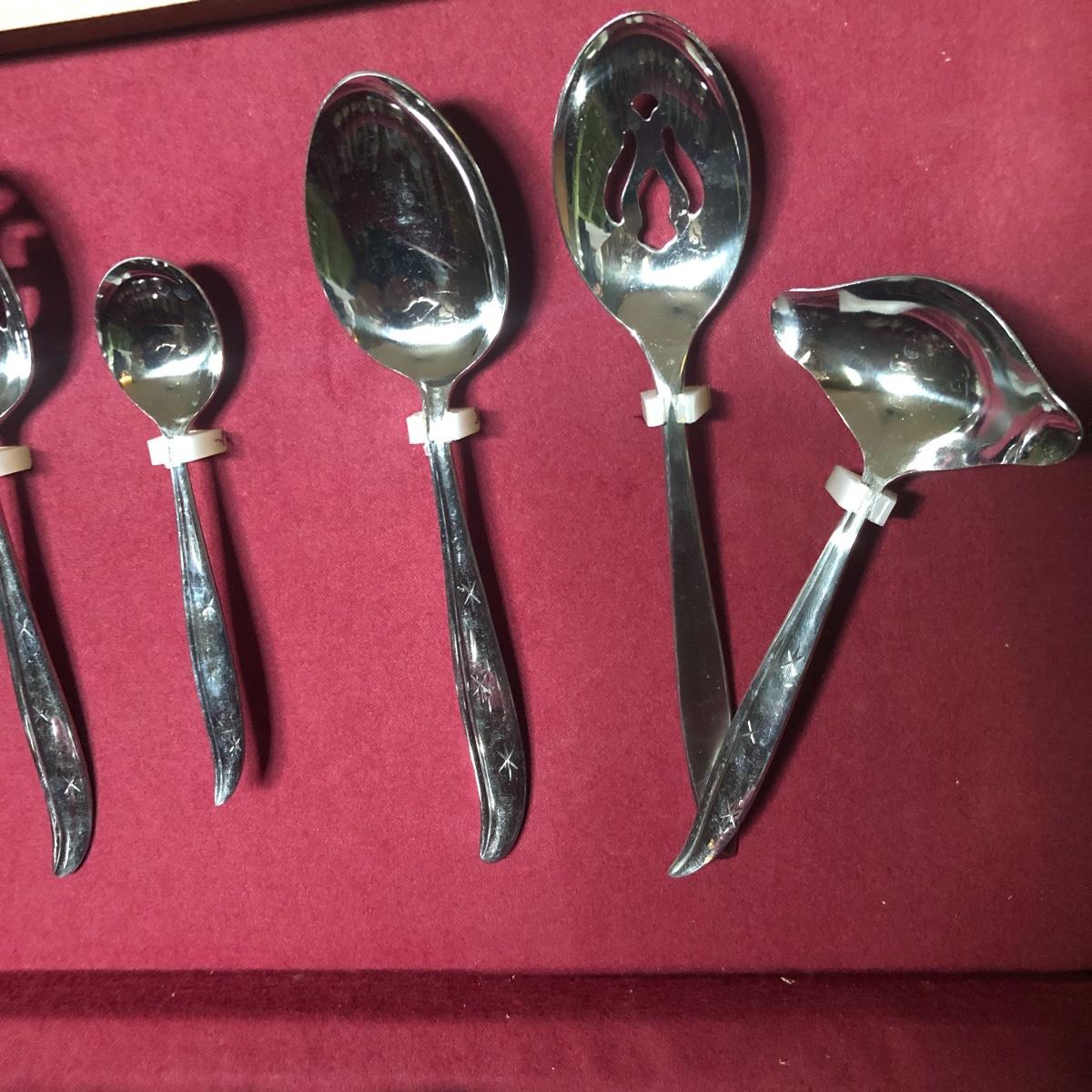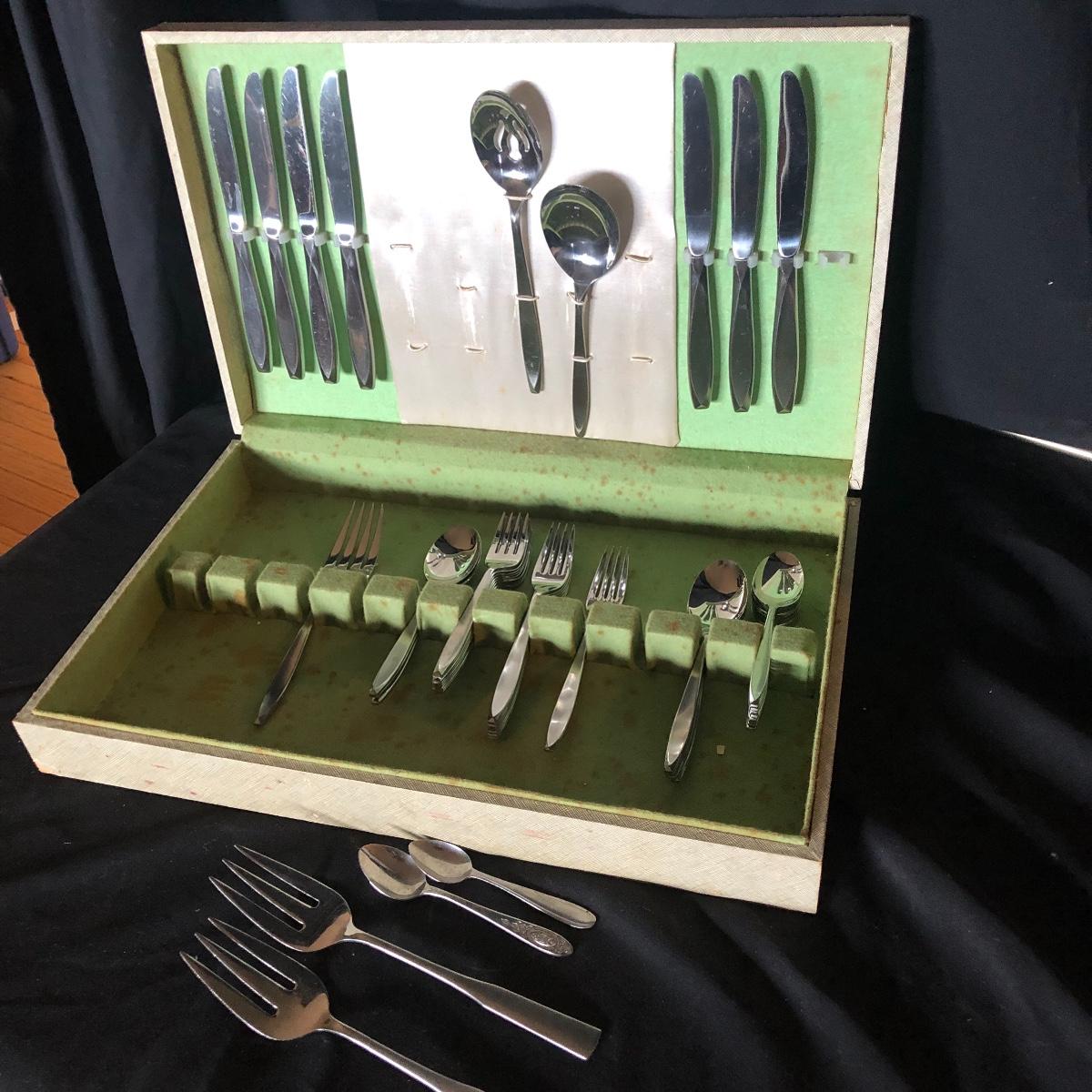 Compliment your serving ware with these sets. The red case is wooden with red felt lining and has eight knives, eight large soup spoons, sixteen spoons, three serving spoons, a ladle, eight dinner forks, eight salad forks, eight shrimp forks, a butter knife and eight ice tea spoons. Note the pretty stars engraved on the handle. This set is made in Japan. Next the green lined case offers seven knives, two serving spoons, eight dinner spoons, seven soup spoons, seven dinner forks and eight salad forks. There are a couple of spoons and serving forks added. The second set is marked Inisco stainless ware. Local pick up only.
