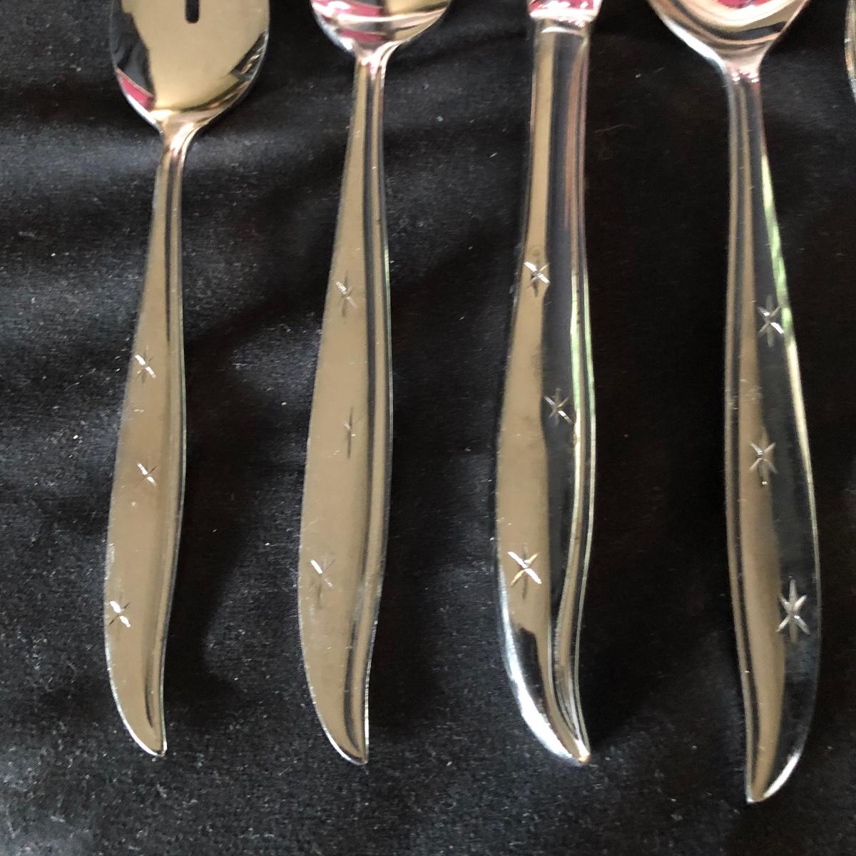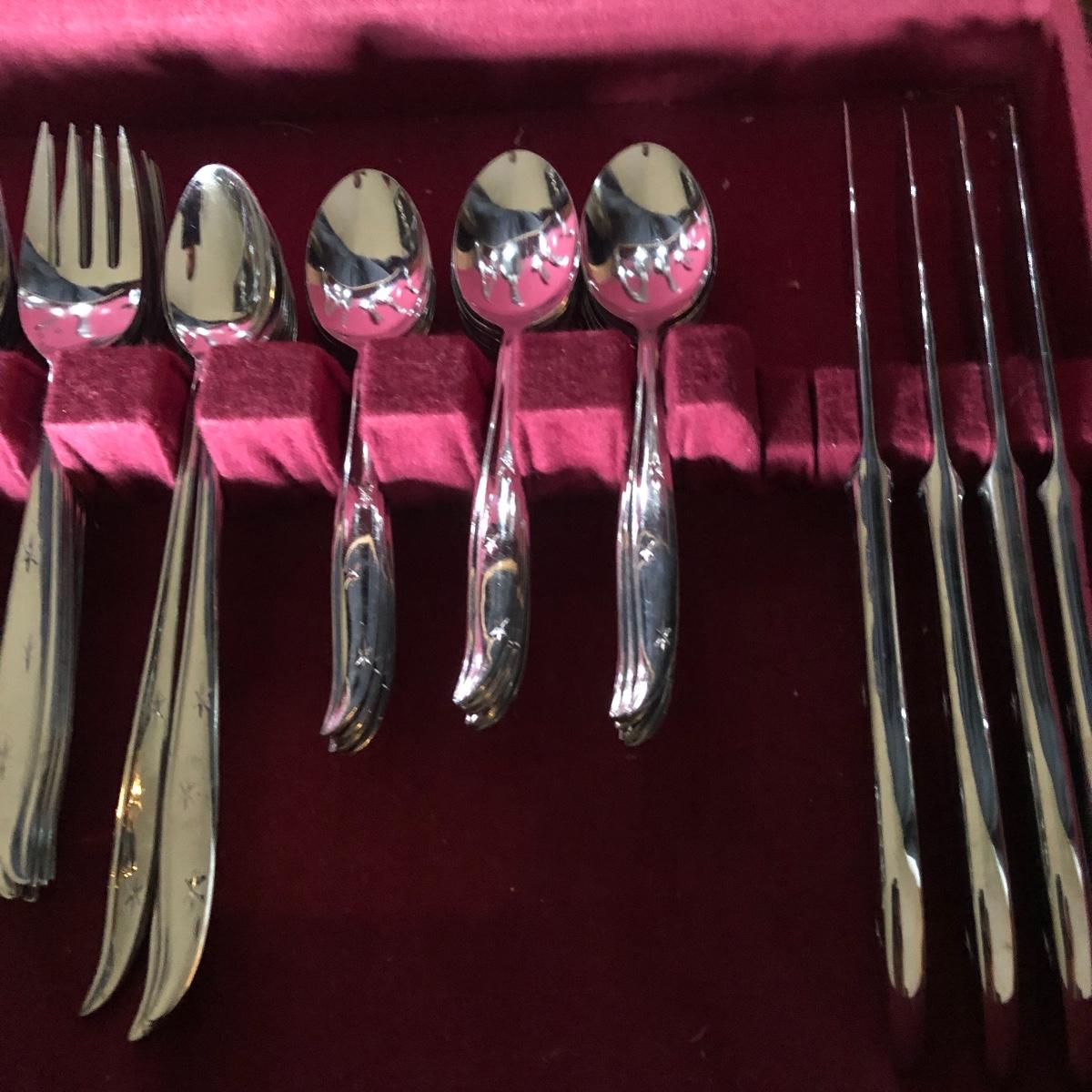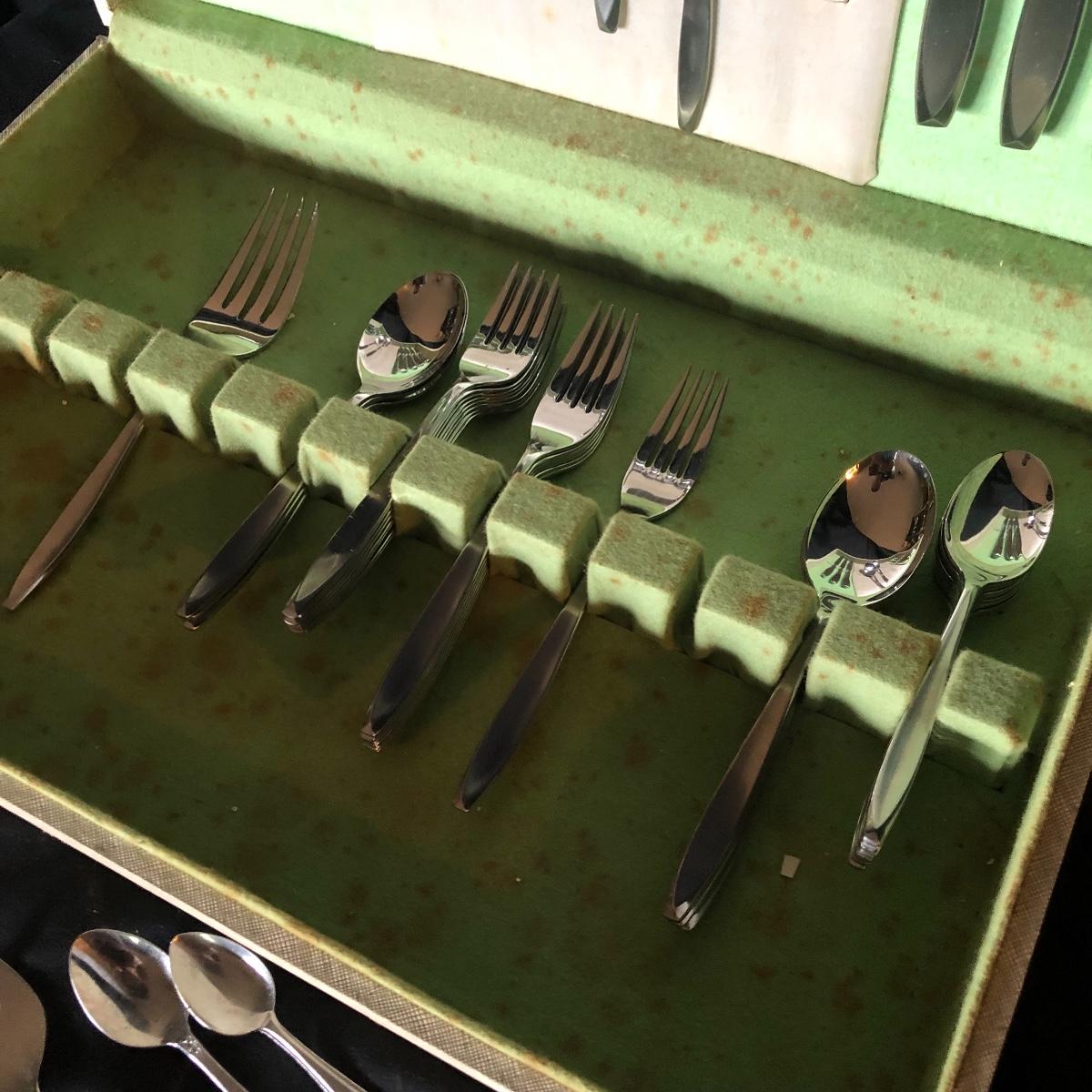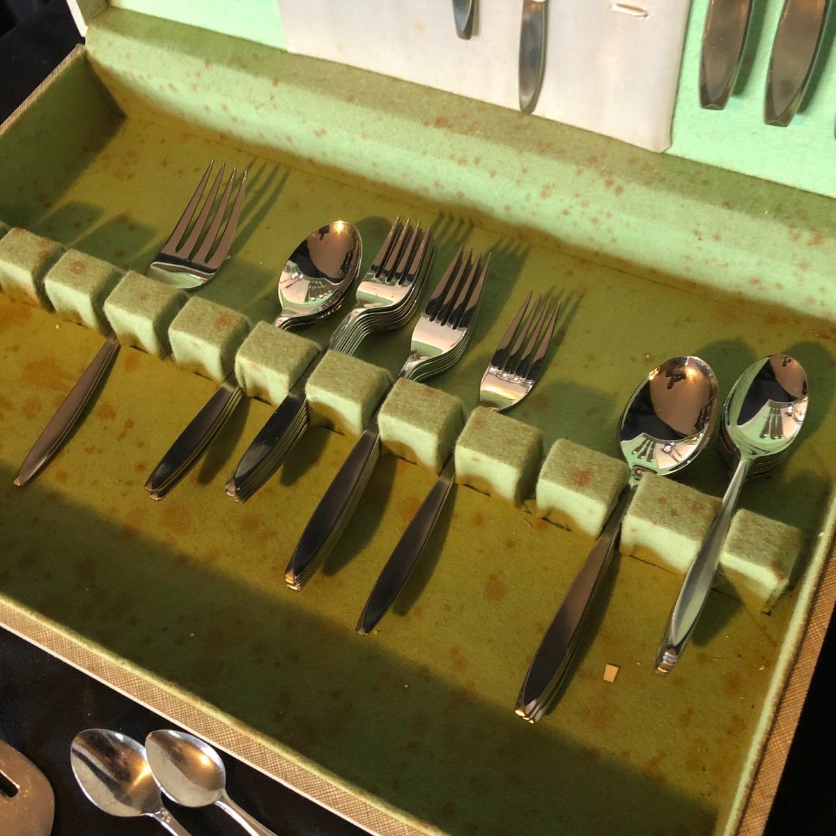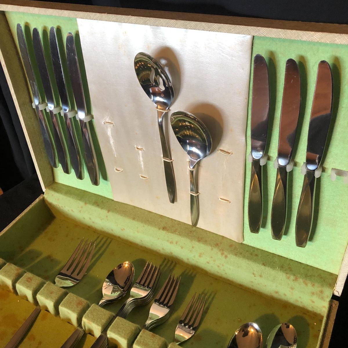 Compliment your serving ware with these sets. The red case is wooden with red felt lining and has eight knives, eight large soup spoons, sixteen spoons, three serving spoons, a ladle, eight dinner forks, eight salad forks, eight shrimp forks, a butter knife and eight ice tea spoons. Note the pretty stars engraved on the handle. This set is made in Japan. Next the green lined case offers seven knives, two serving spoons, eight dinner spoons, seven soup spoons, seven dinner forks and eight salad forks. There are a couple of spoons and serving forks added. The second set is marked Inisco stainless ware. Local pick up only.