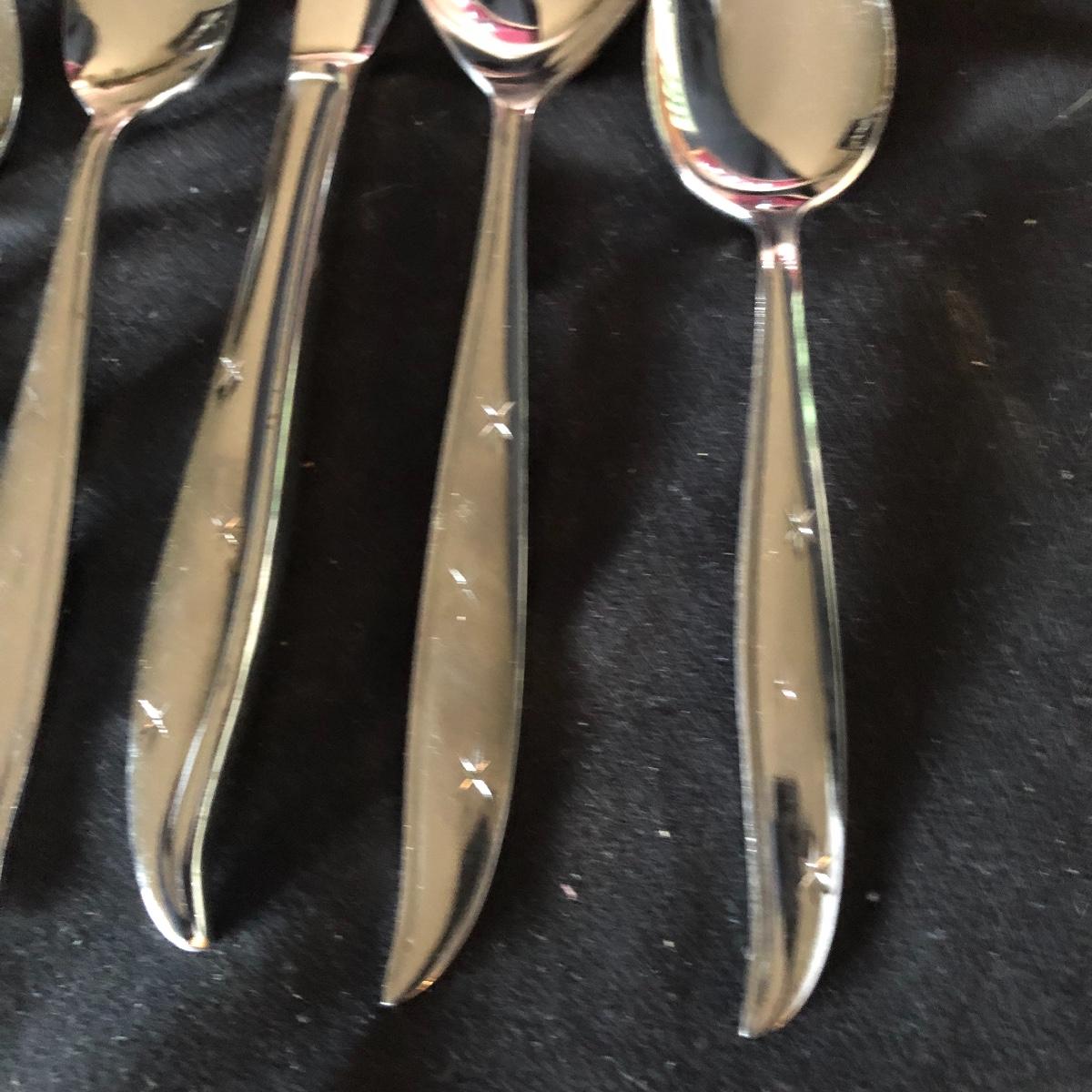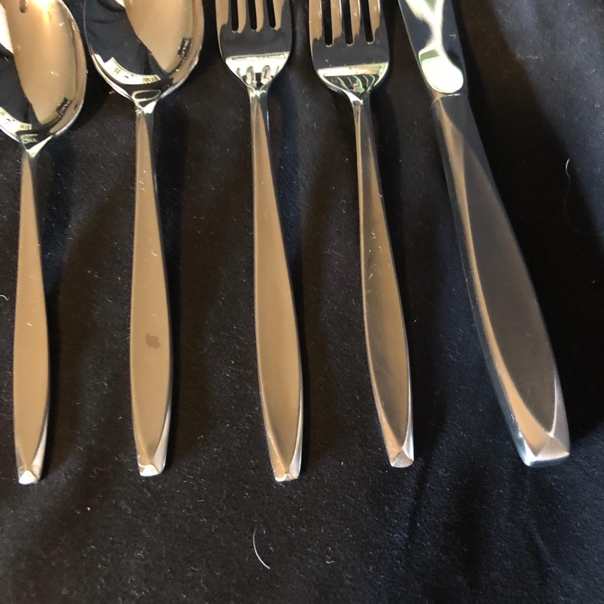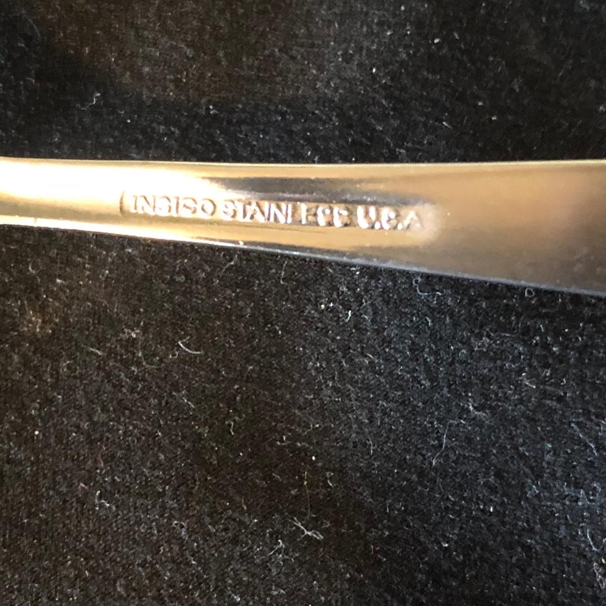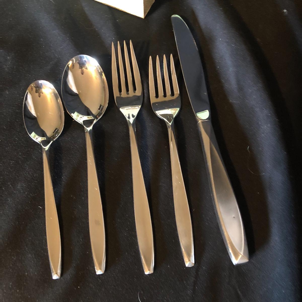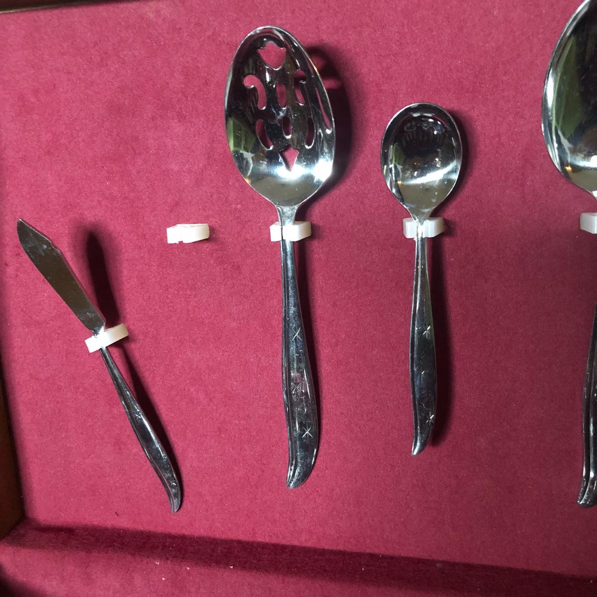 Compliment your serving ware with these sets. The red case is wooden with red felt lining and has eight knives, eight large soup spoons, sixteen spoons, three serving spoons, a ladle, eight dinner forks, eight salad forks, eight shrimp forks, a butter knife and eight ice tea spoons. Note the pretty stars engraved on the handle. This set is made in Japan. Next the green lined case offers seven knives, two serving spoons, eight dinner spoons, seven soup spoons, seven dinner forks and eight salad forks. There are a couple of spoons and serving forks added. The second set is marked Inisco stainless ware. Local pick up only.