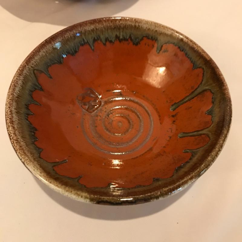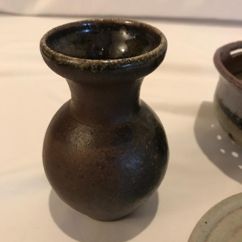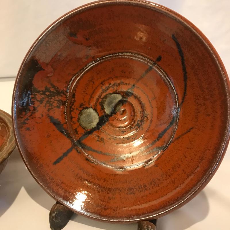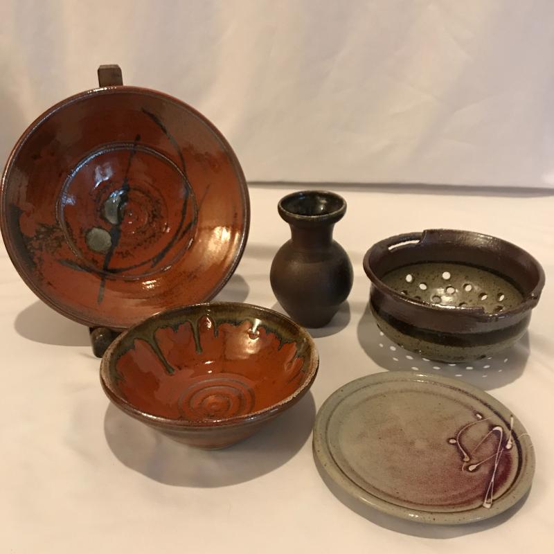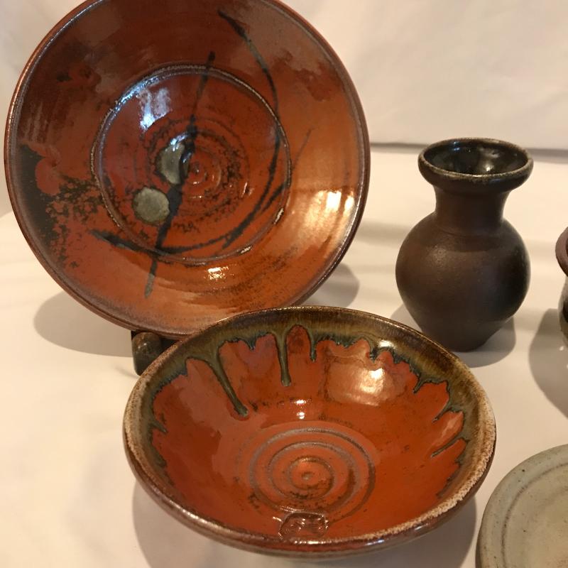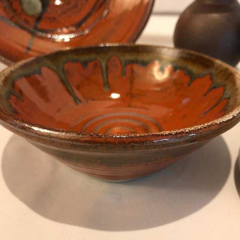 Two beautiful burnt orange glazed pieces. Largest bowl is 9”d x 2.5”h. One strainer bowl (6”d) and a glazed plate. One small bud vase that is 5”h. Shipping or local pick up in Asheville.