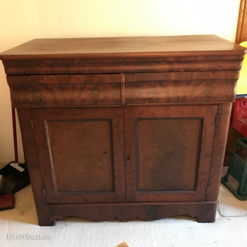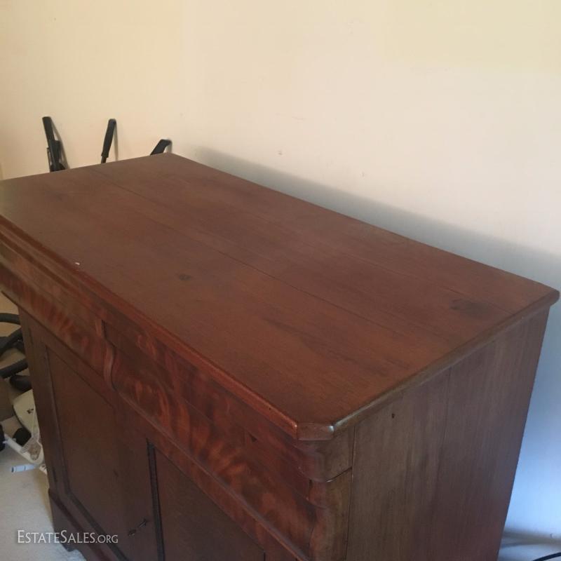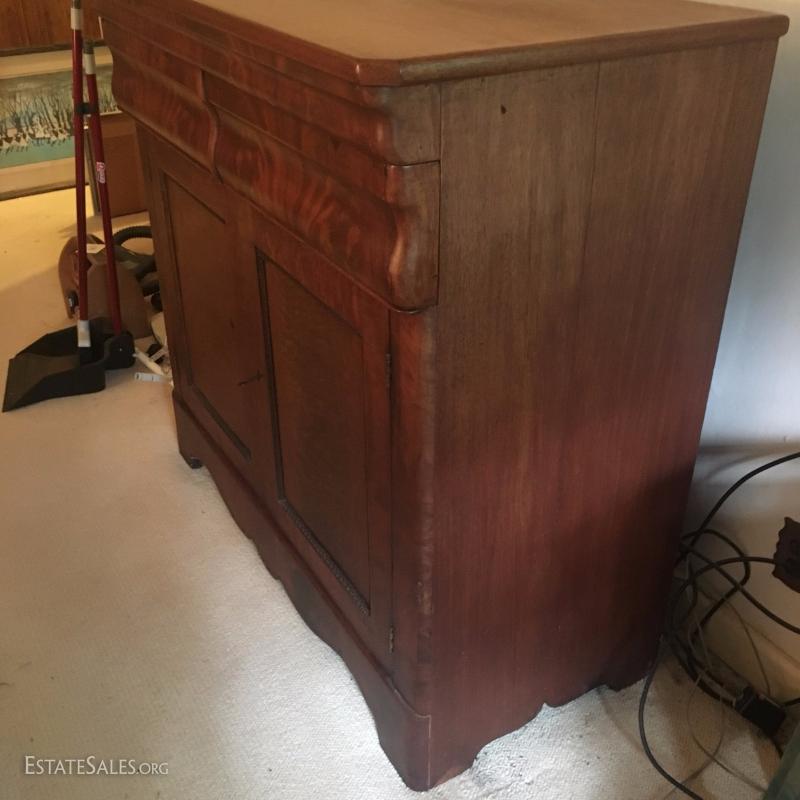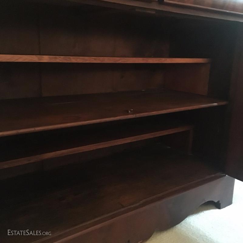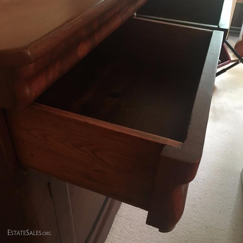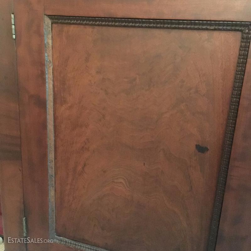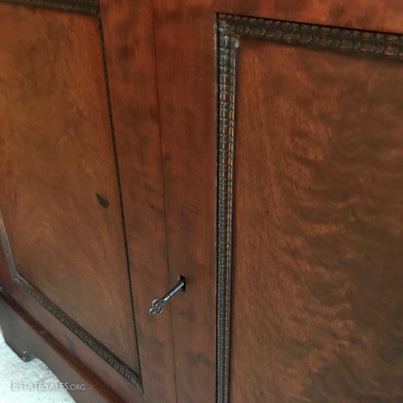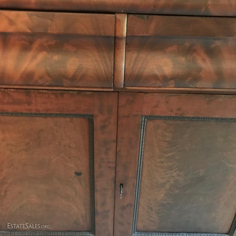 Gorgeous cabinet with beautiful mahogany wood detail. Two ogee drawers and shelves below. Includes key for door. See photos. 45"l x 21.5"w x 43"h.
