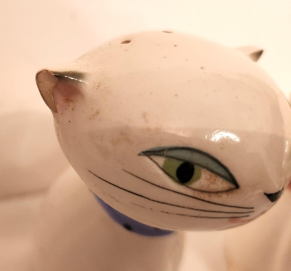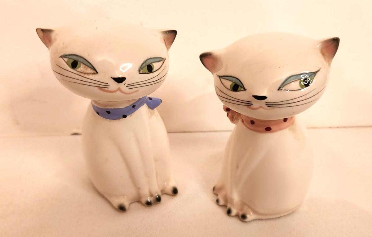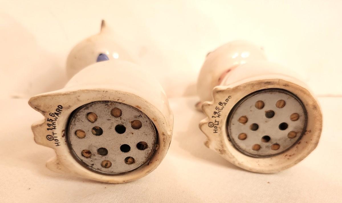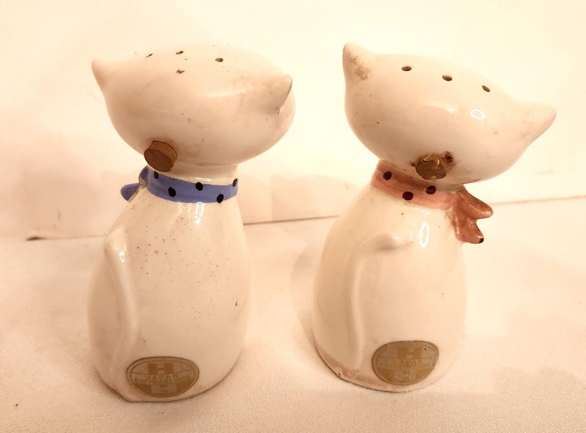 Great pair of vintage Holt Howard (both have labels) Kitty Kat Salt/Pepper shapers - cork stoppers, each 4.5" tall. One has a very small chip to one ear. Note: These have "Meowers" in the bottom - they are present but don't work. Scarce in any condition.