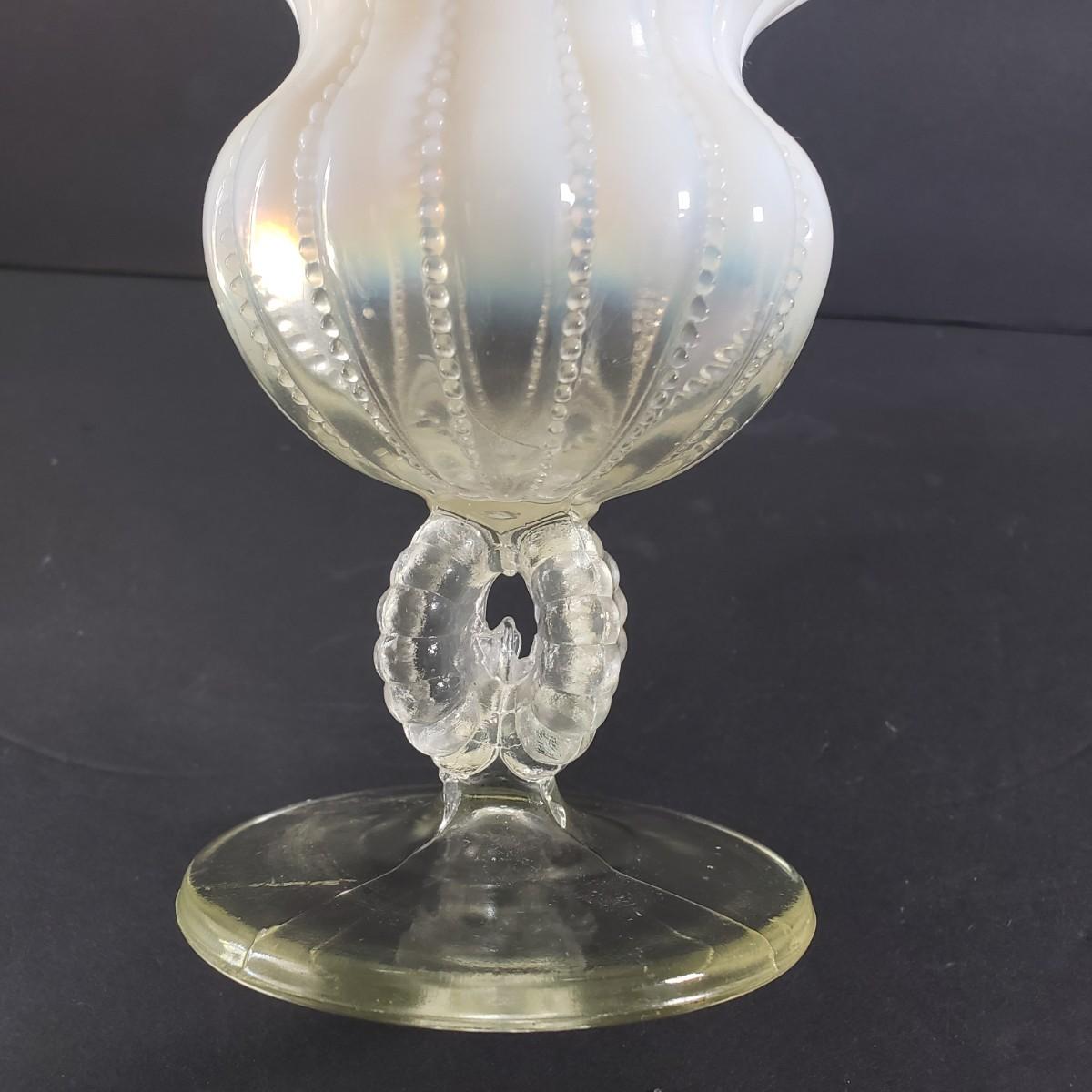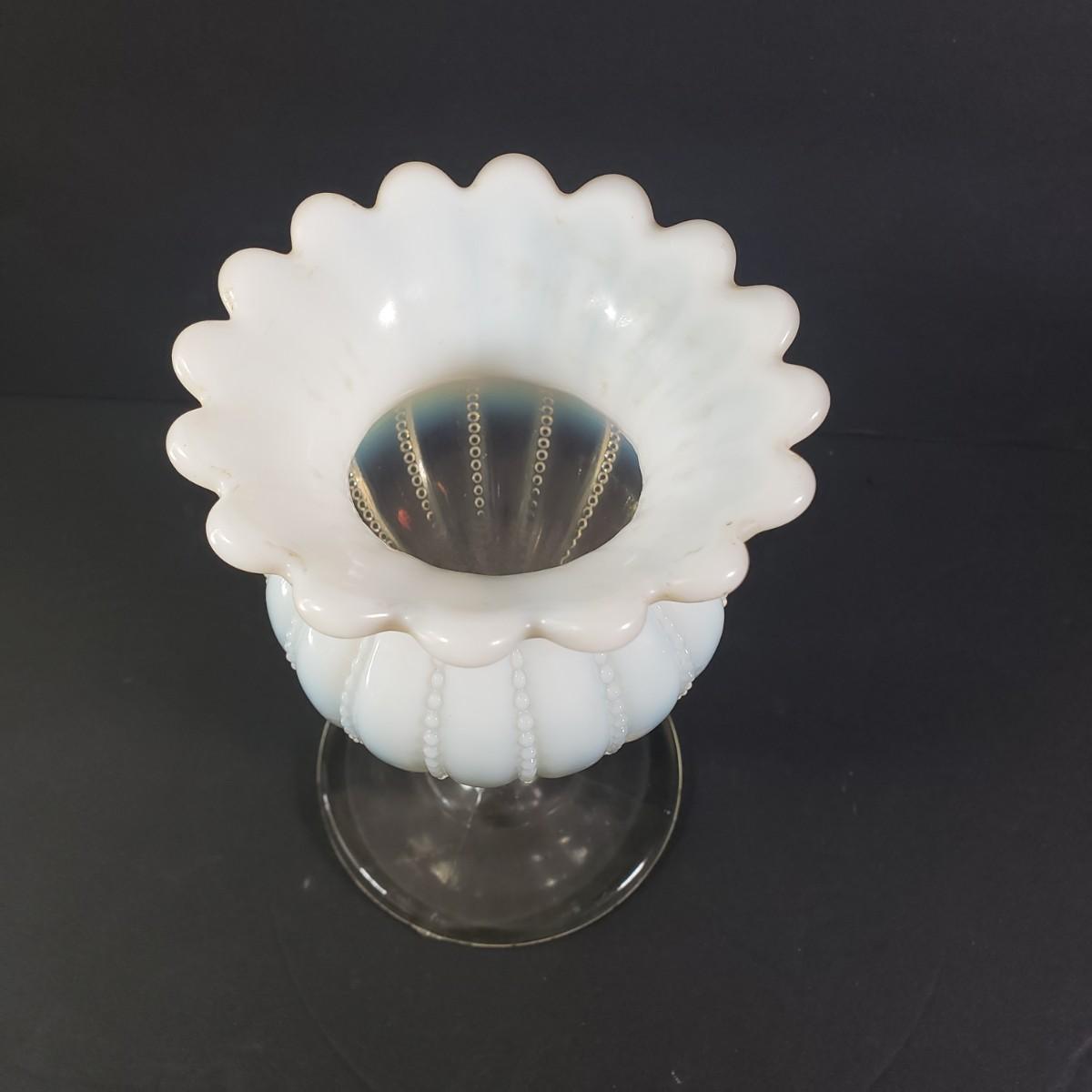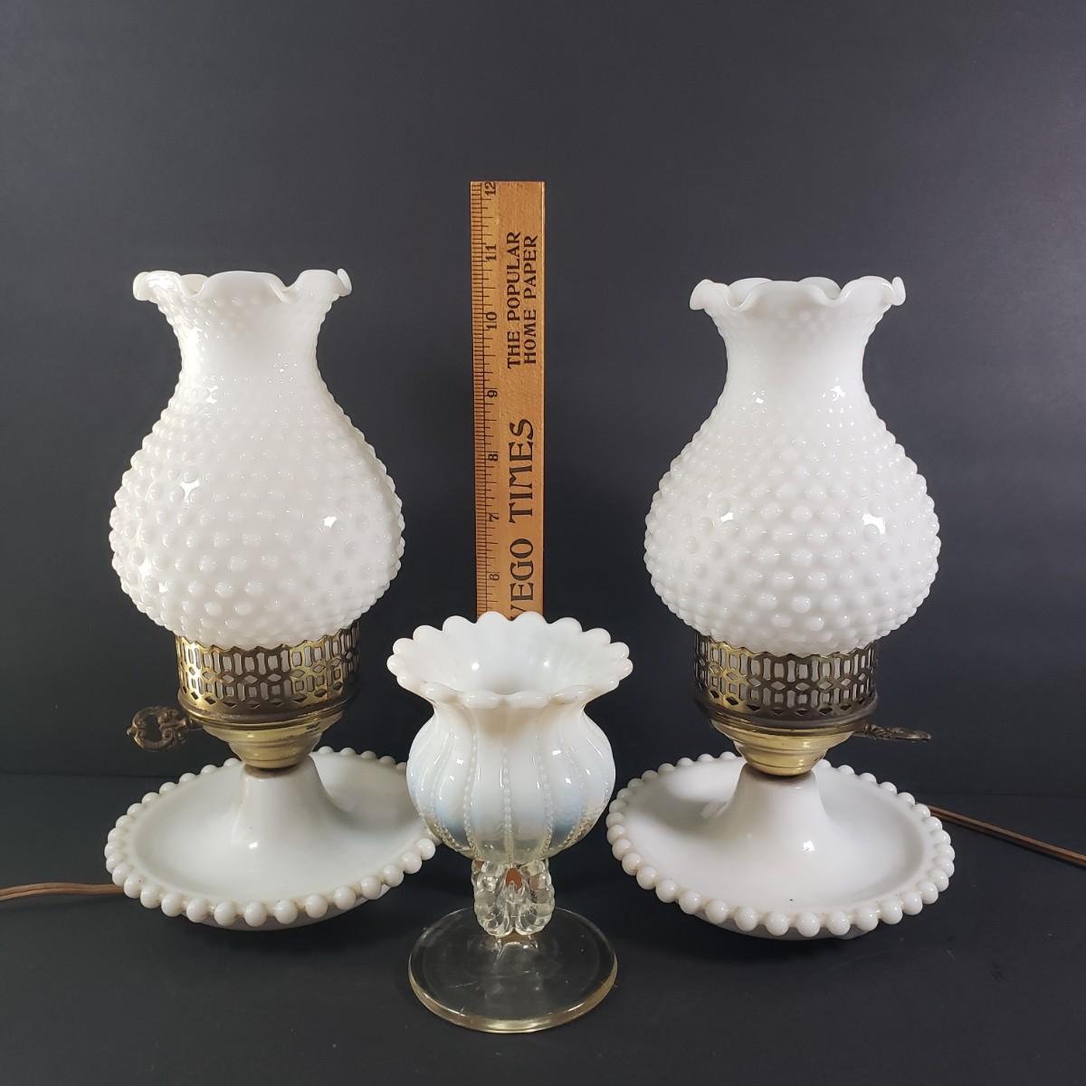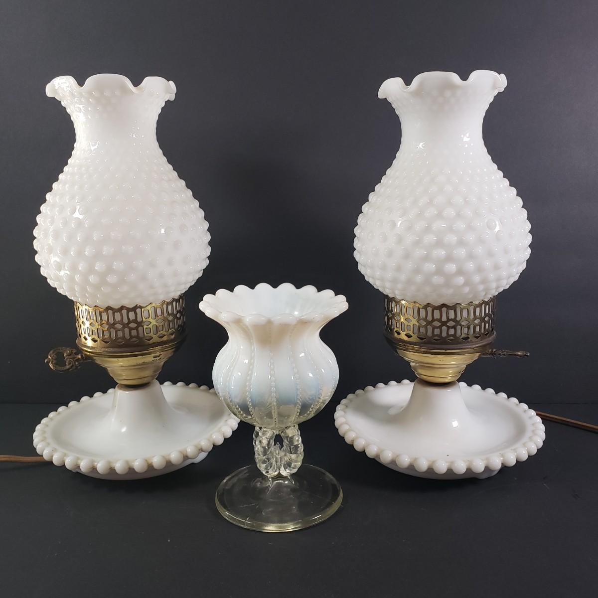 LOT 22G: Northwood Opalescent Beaded Vase & Pair of Milk Glass Hurricane Lamps