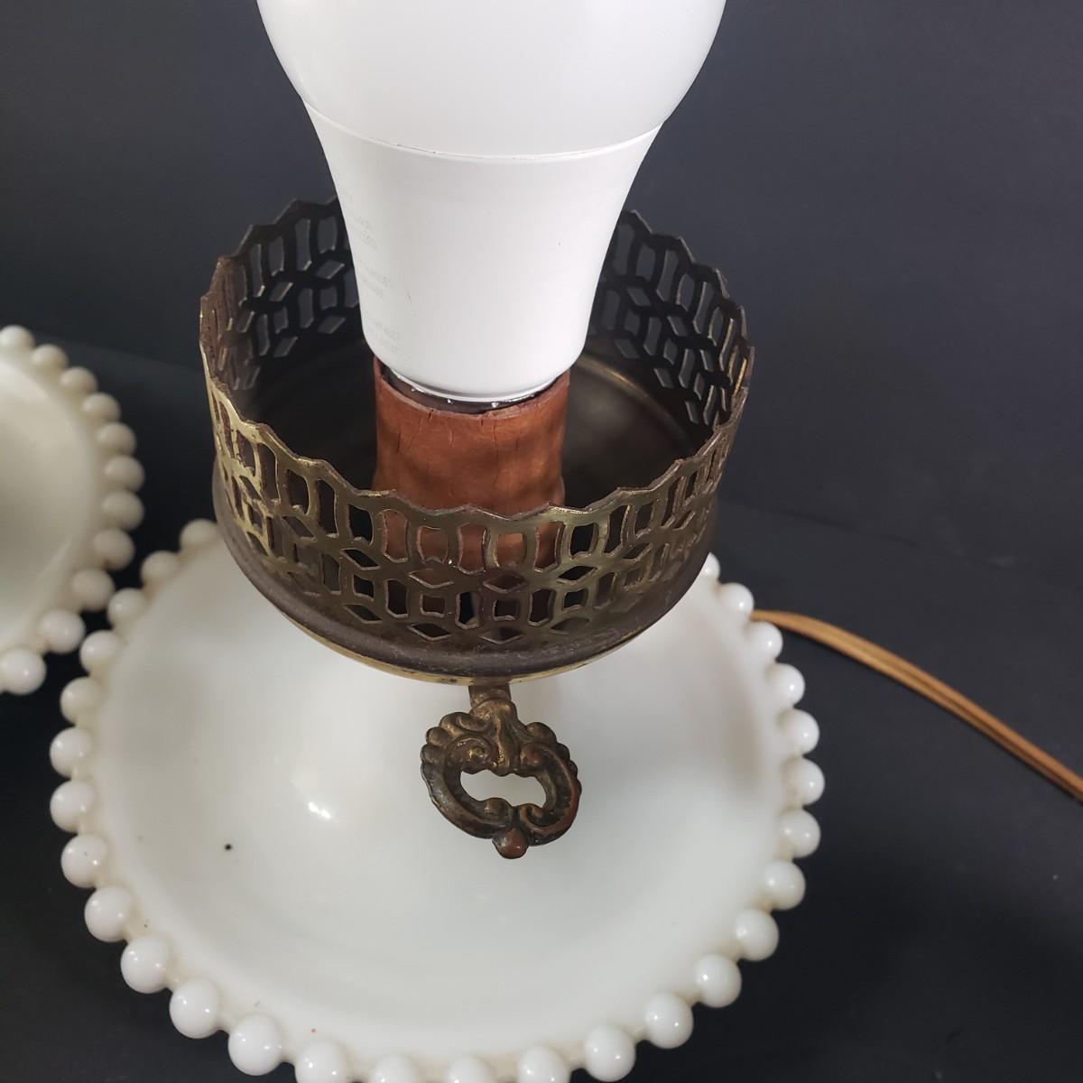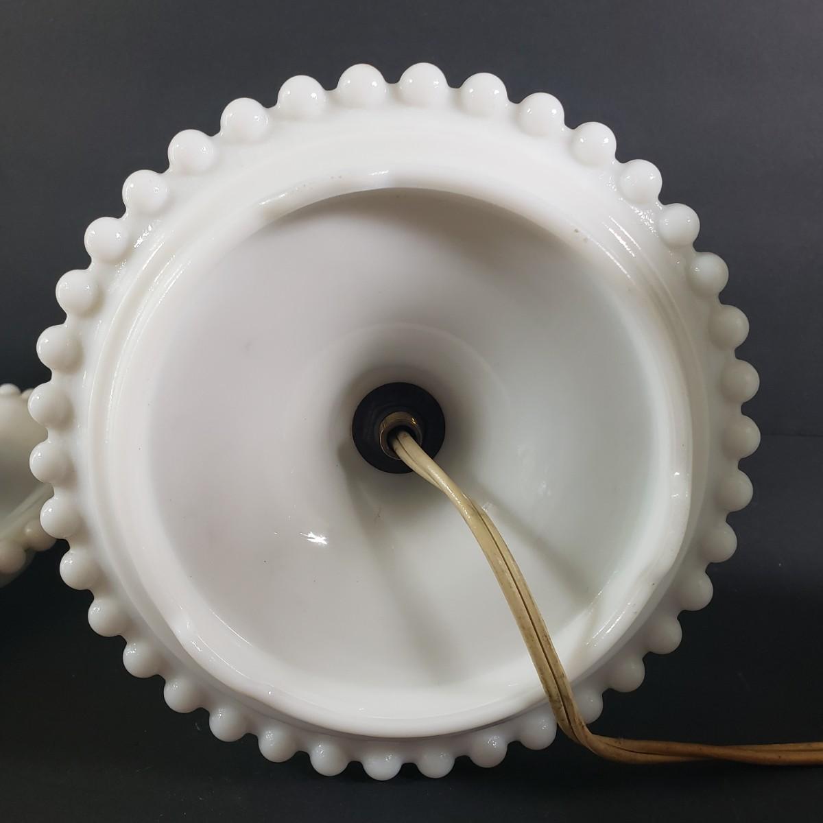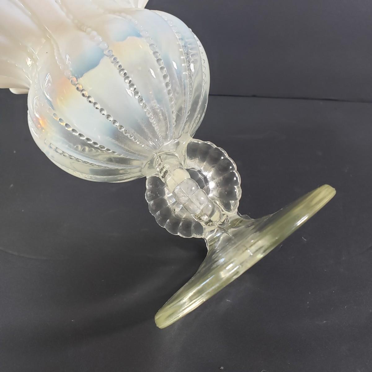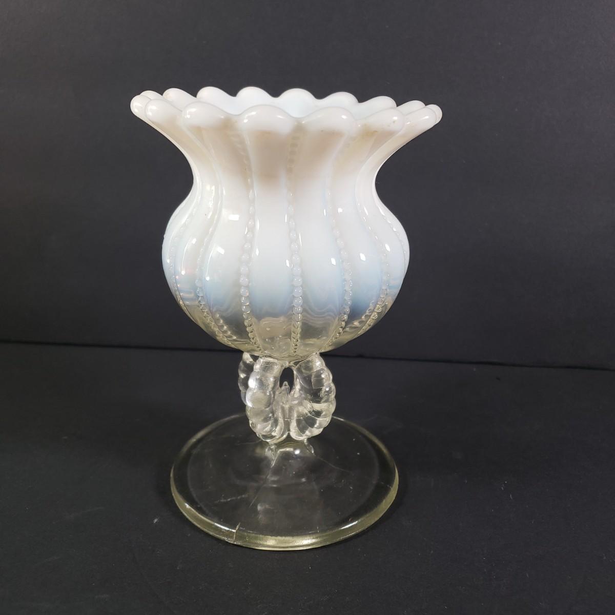 LOT 22G: Northwood Opalescent Beaded Vase & Pair of Milk Glass Hurricane Lamps