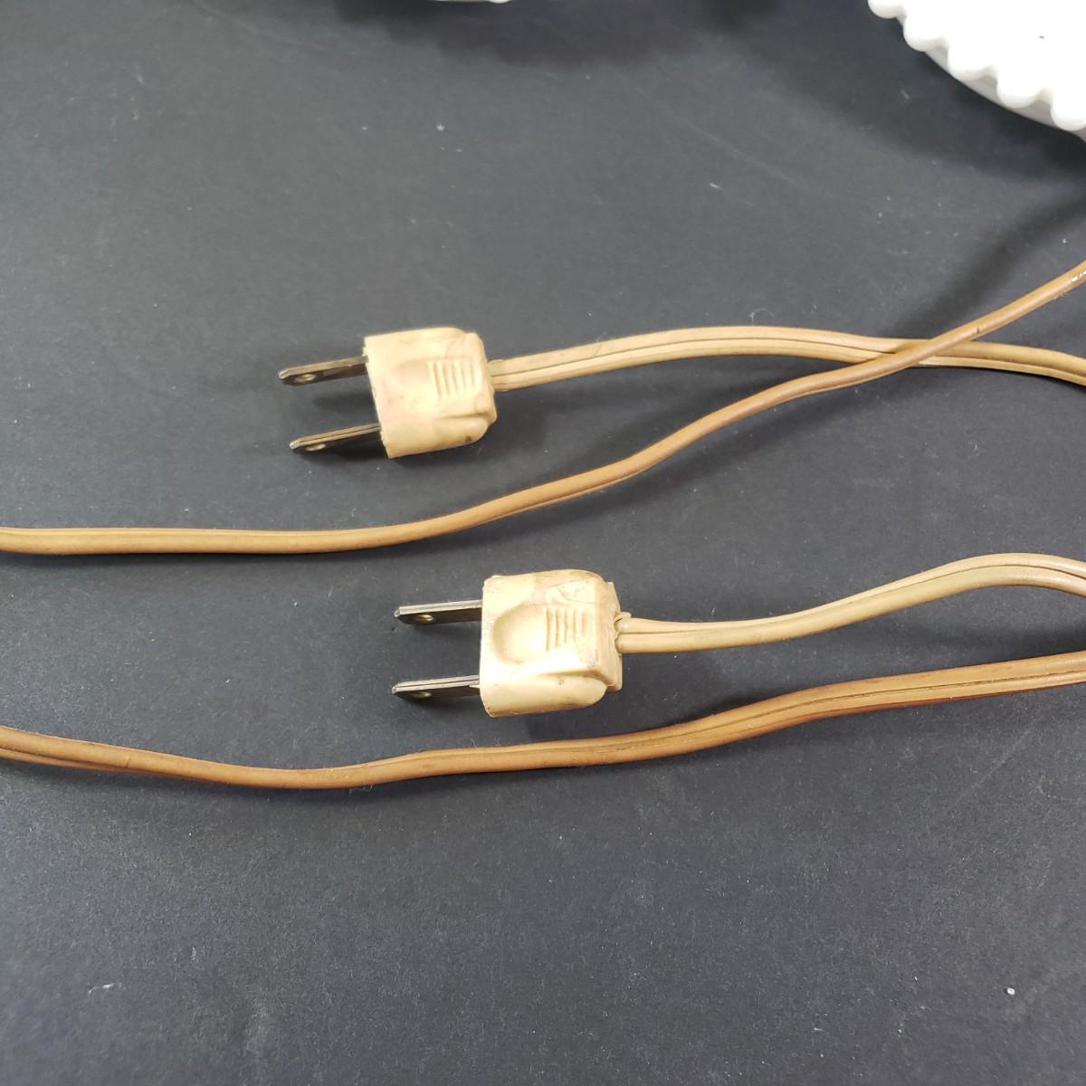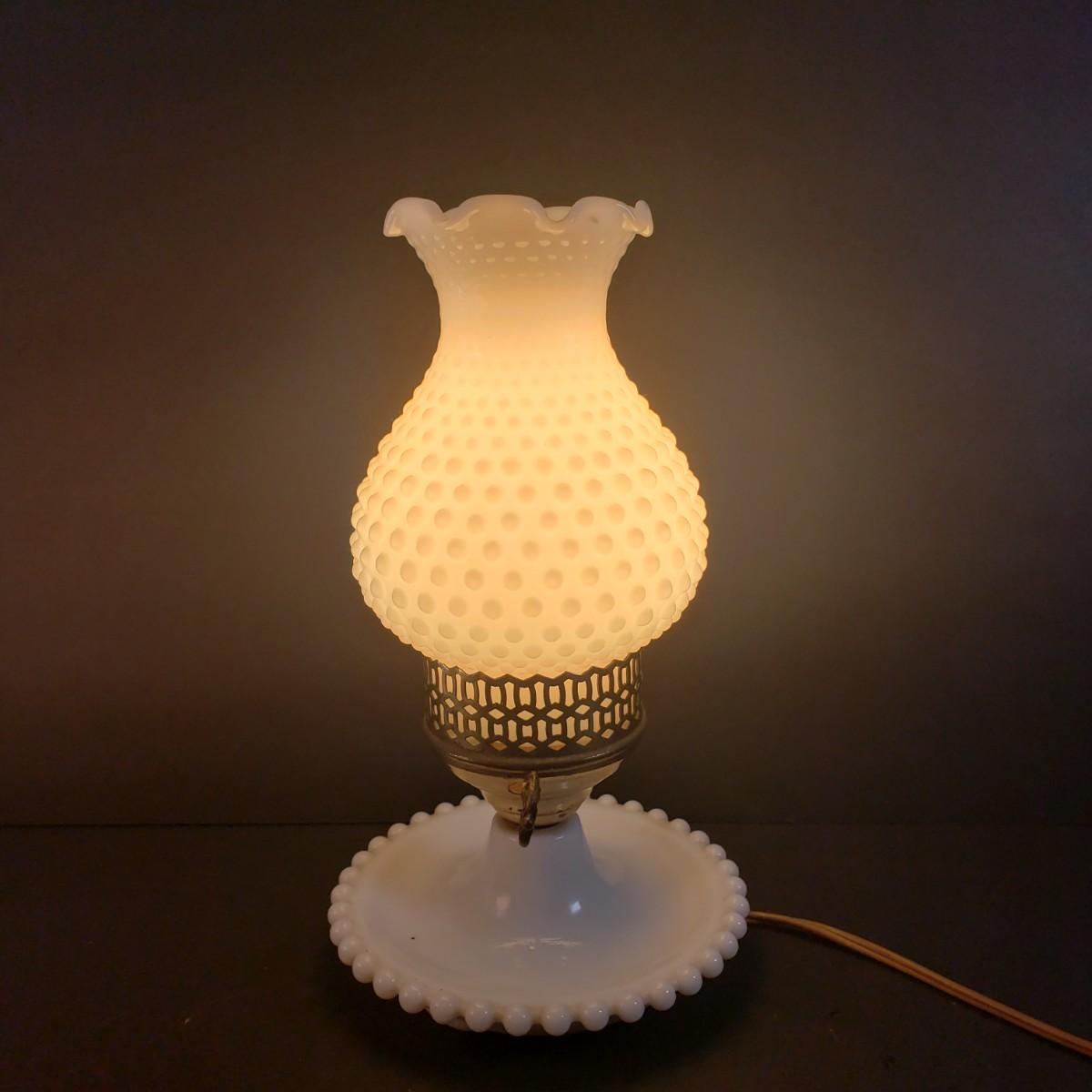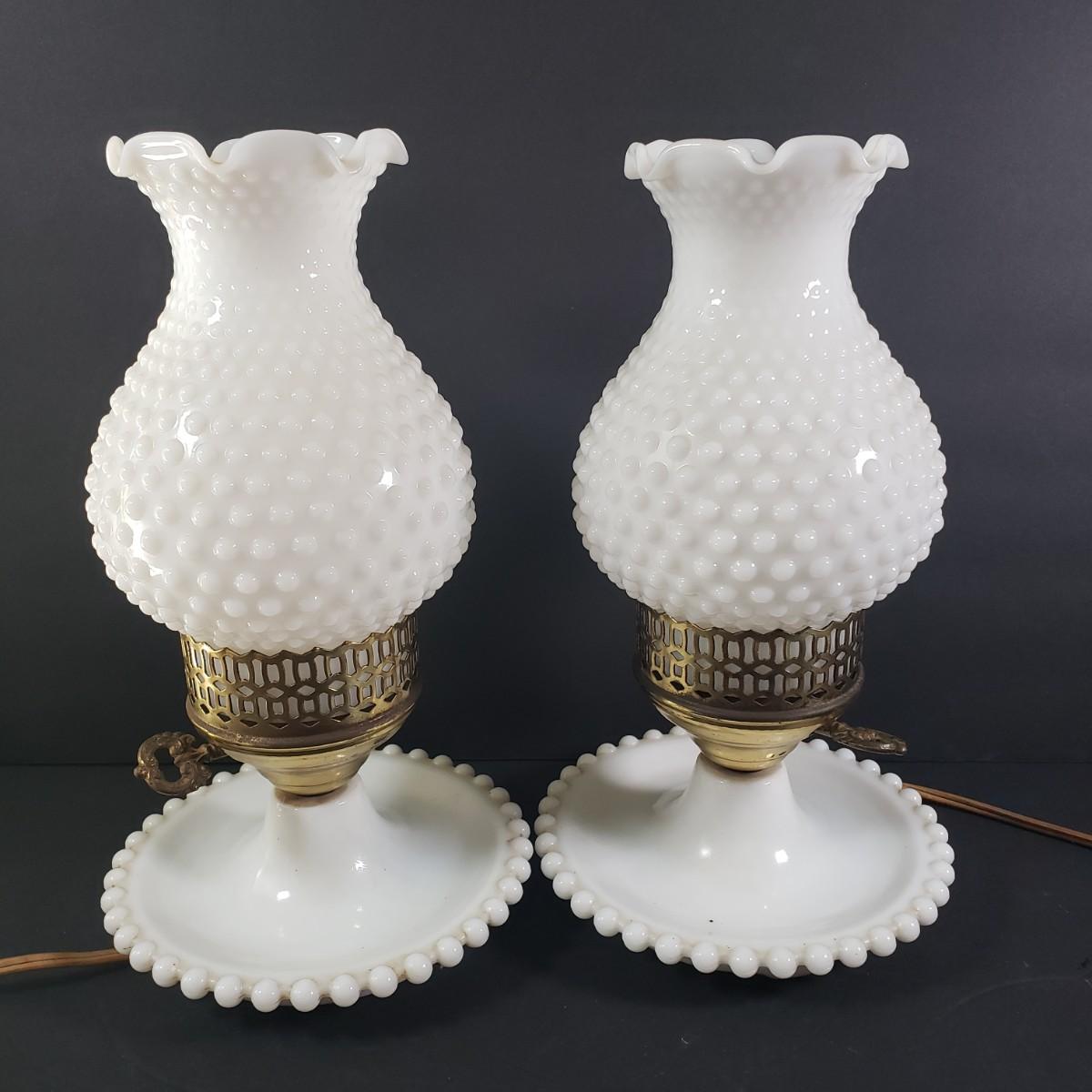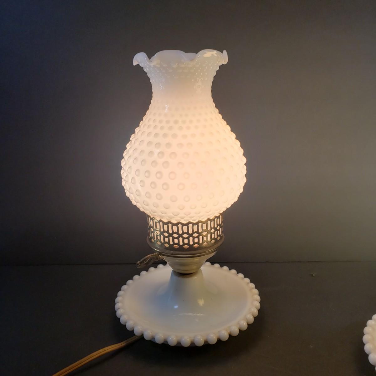 LOT 22G: Northwood Opalescent Beaded Vase & Pair of Milk Glass Hurricane Lamps