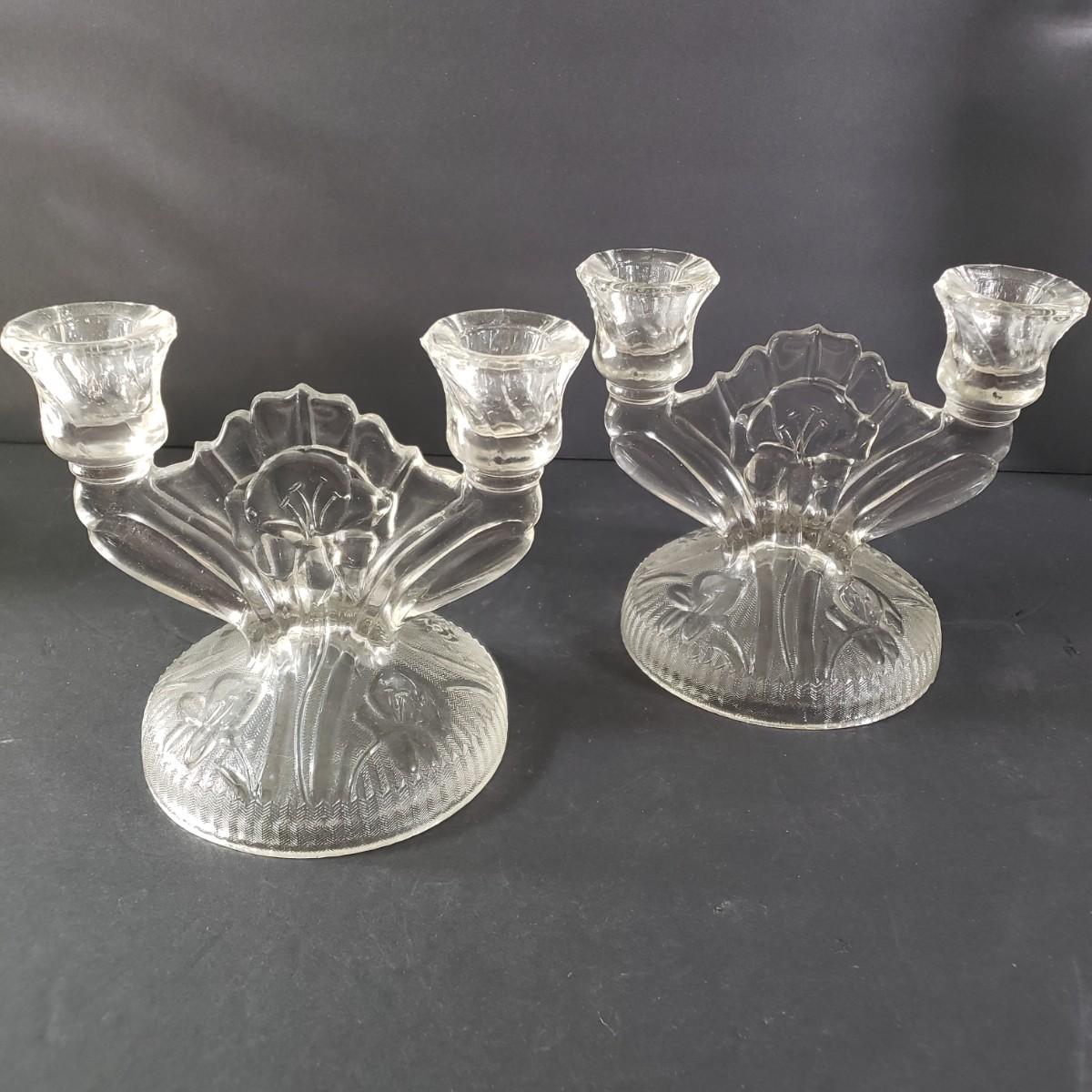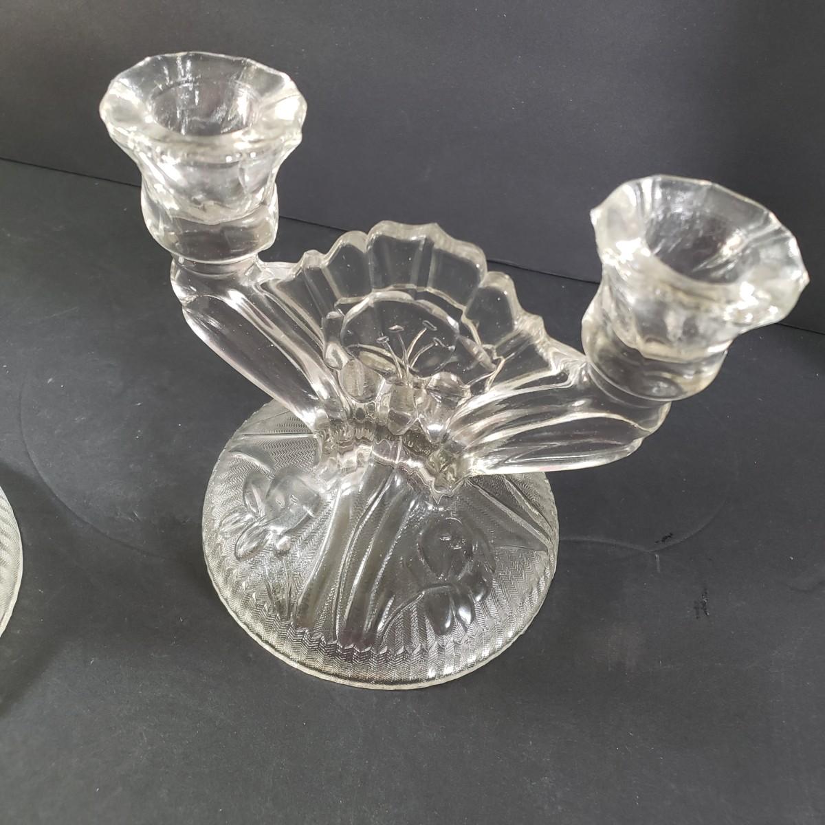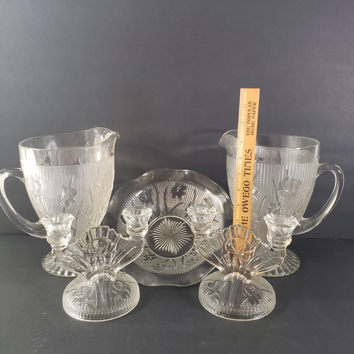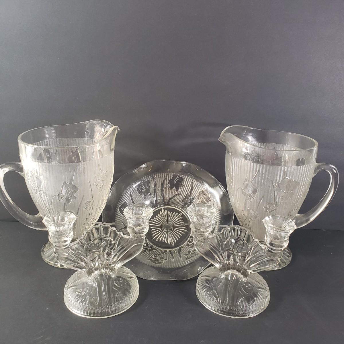 LOT 37G: Jeanette Glass Iris Herringbone Set of Candlesticks Holders, Pitchers & Bowl