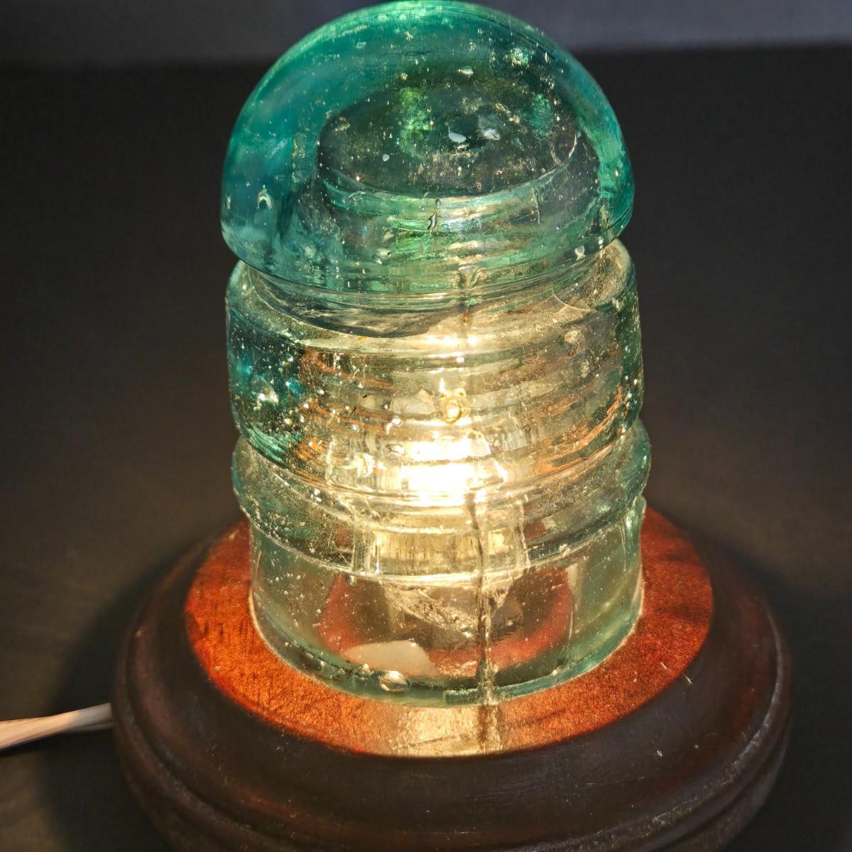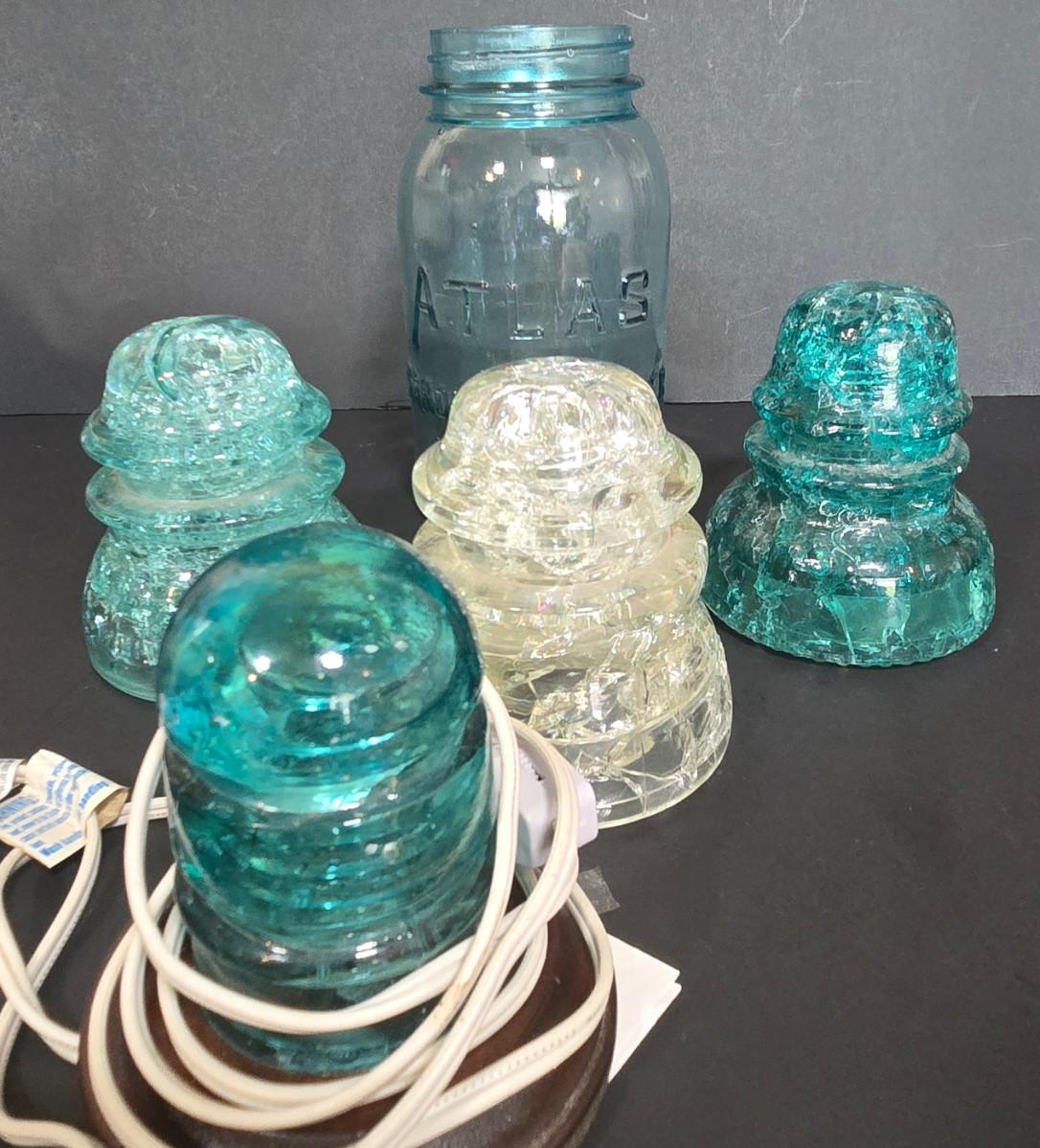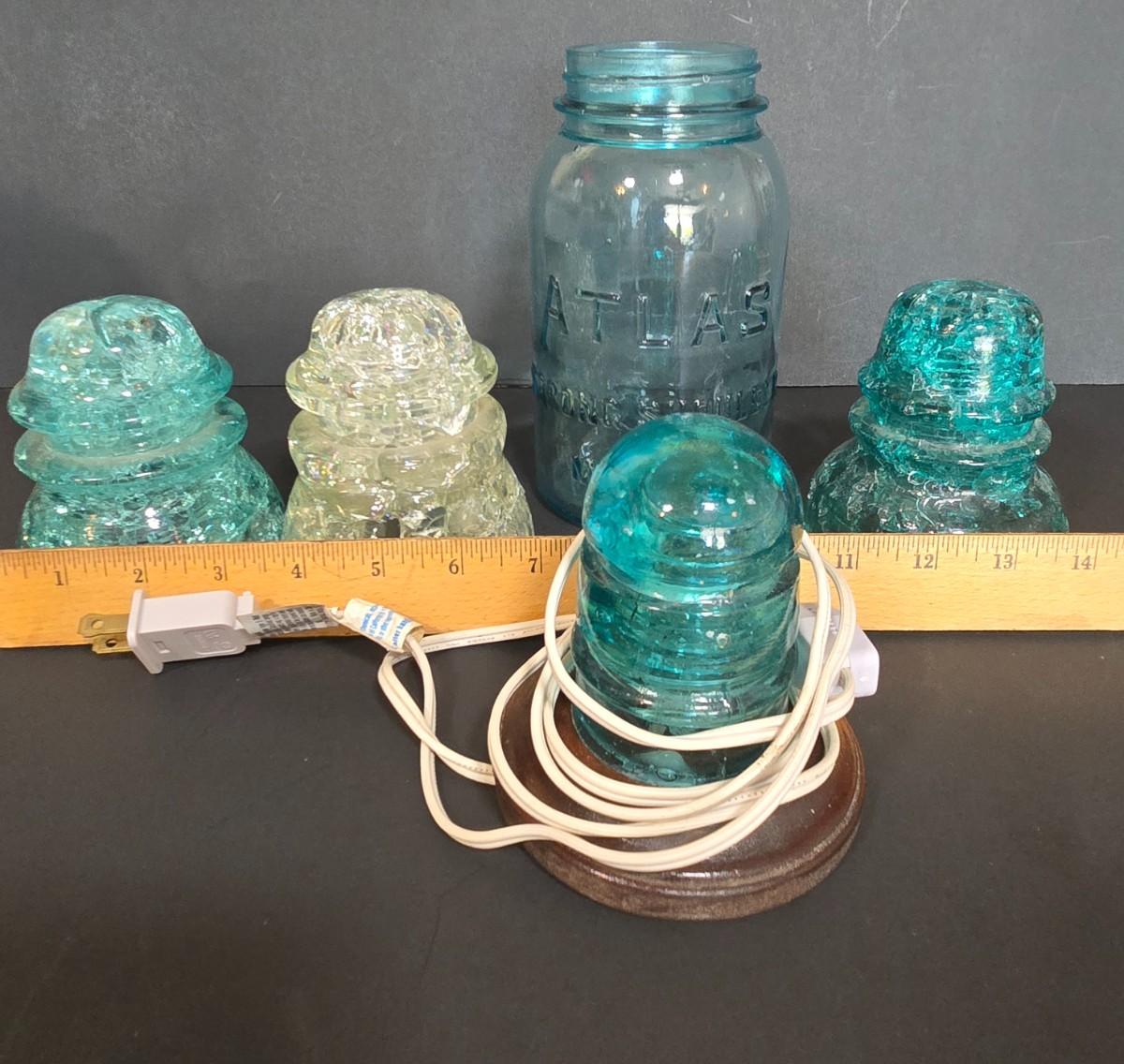 LOT 46: Three Crackled Glass Insulators, Hand-Made Night Light, and Atlas Strong Shoulder Mason Jar