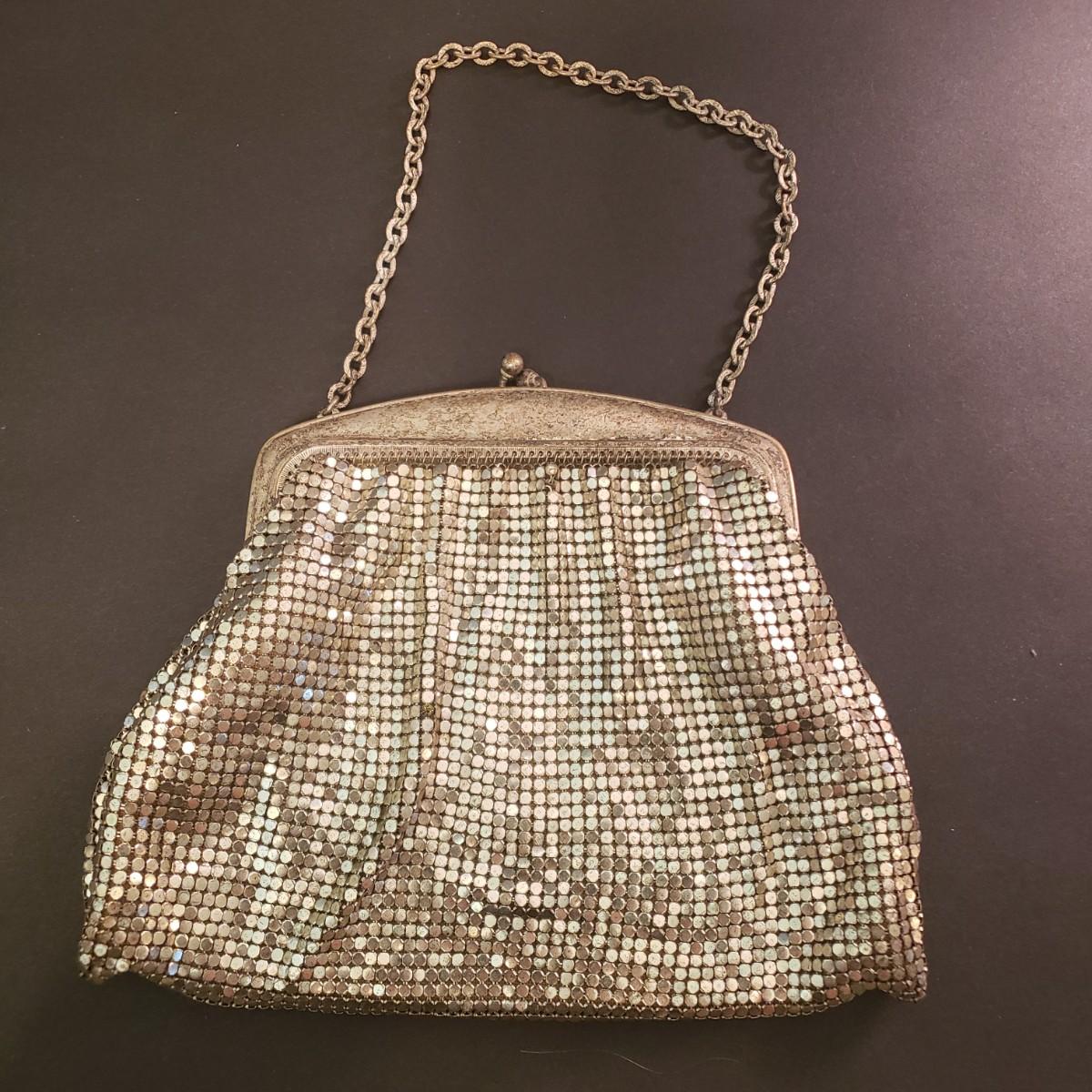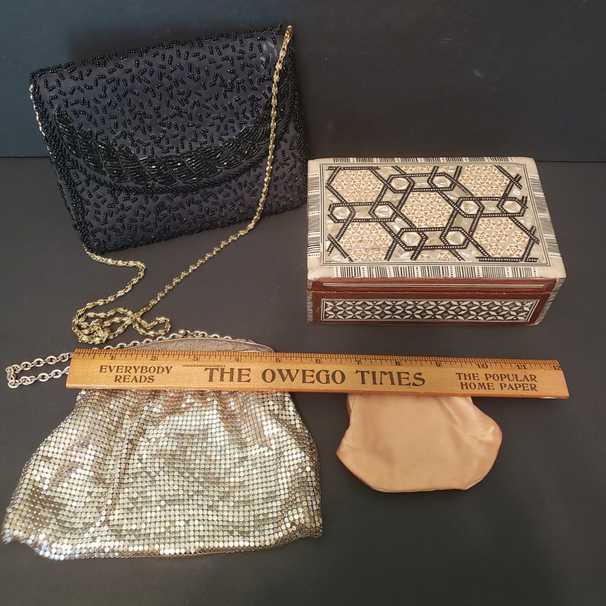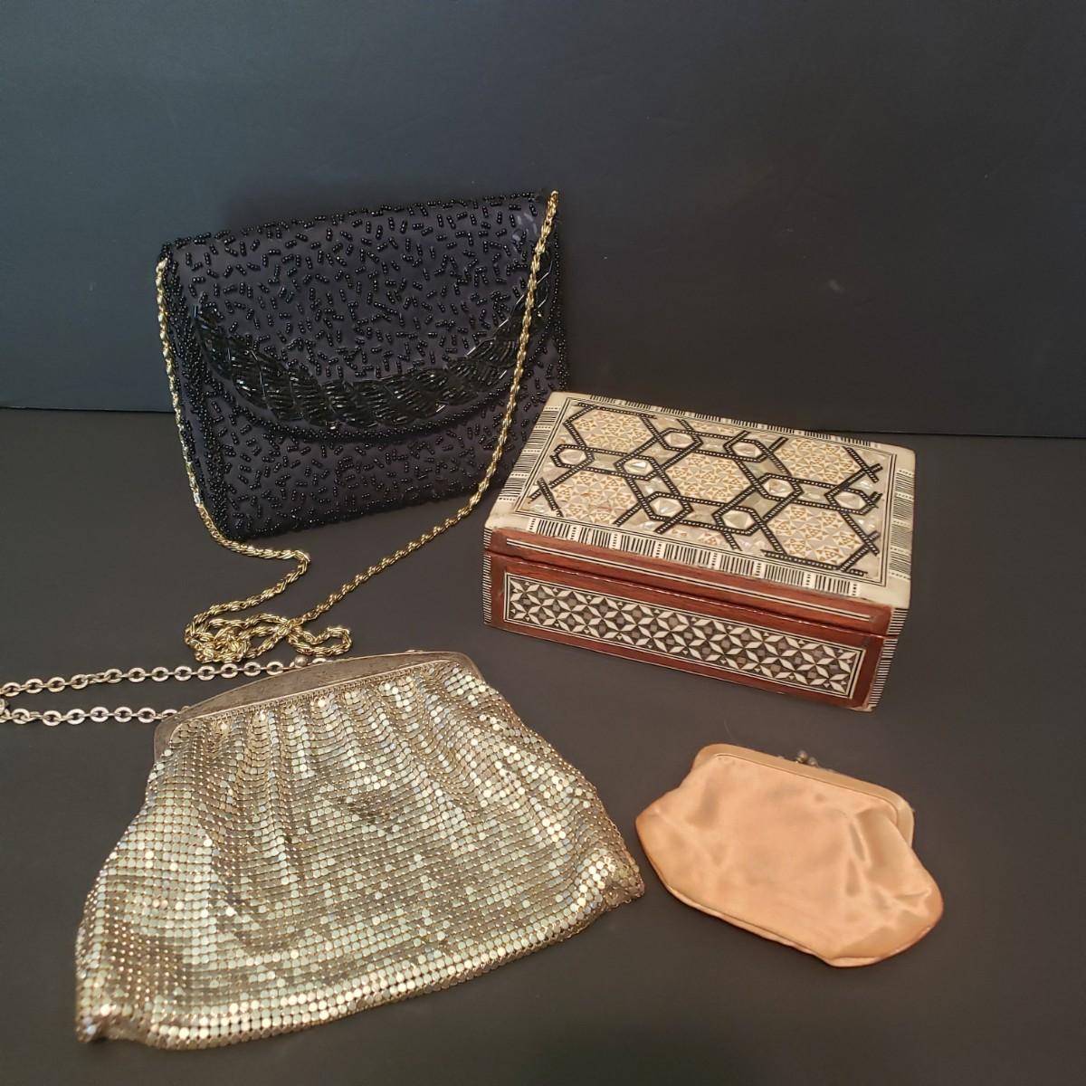 LOT 72F: Mother of Pearl Inlaid Box, Whiting & Davis Mesh Purse & Other Vintage Purses
