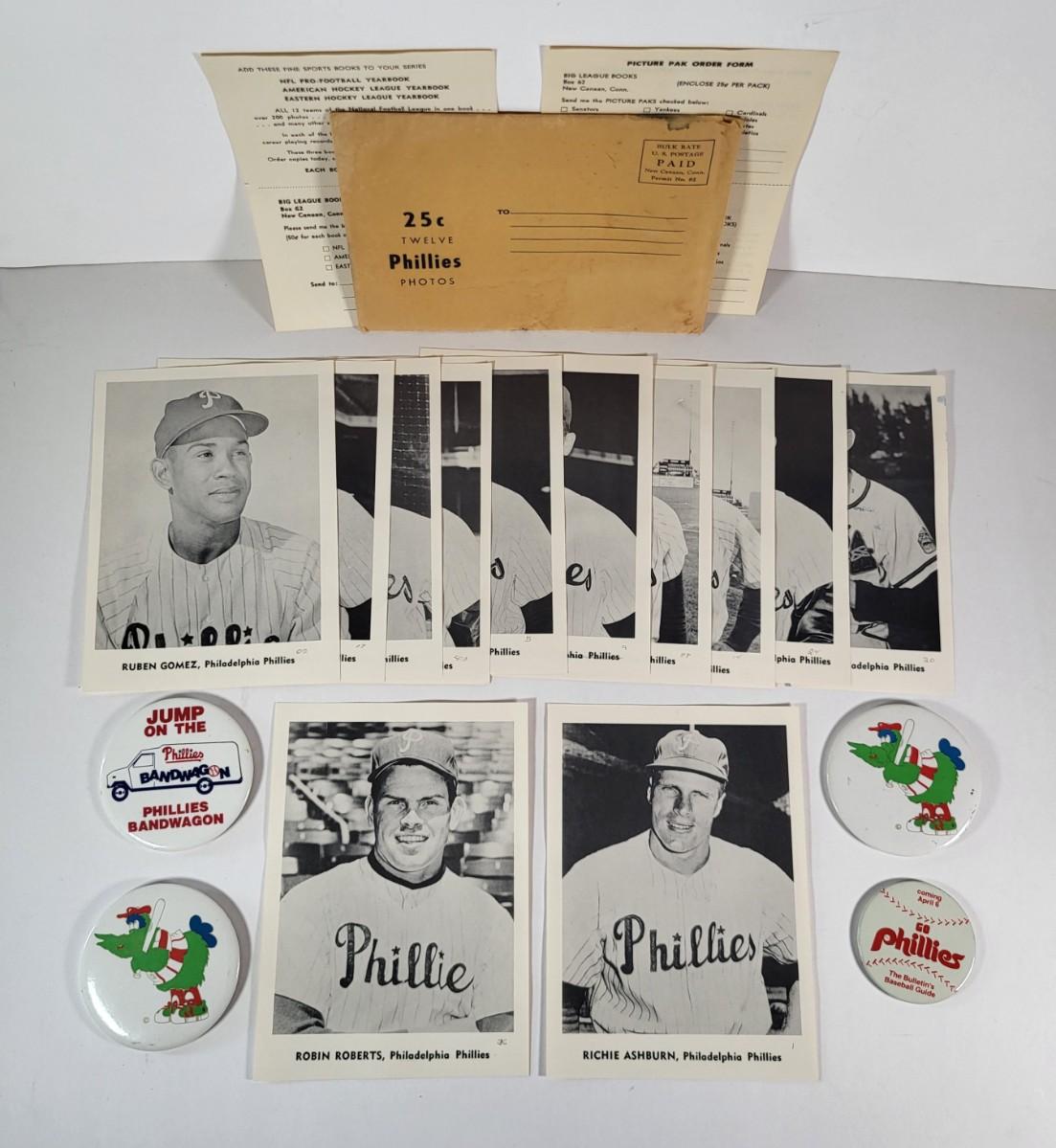 LOT 94D: Vintage Phillies Pins and Black & White Photographs of All-Time Phillies Greats Robin Roberts, Richie Ashburn and More