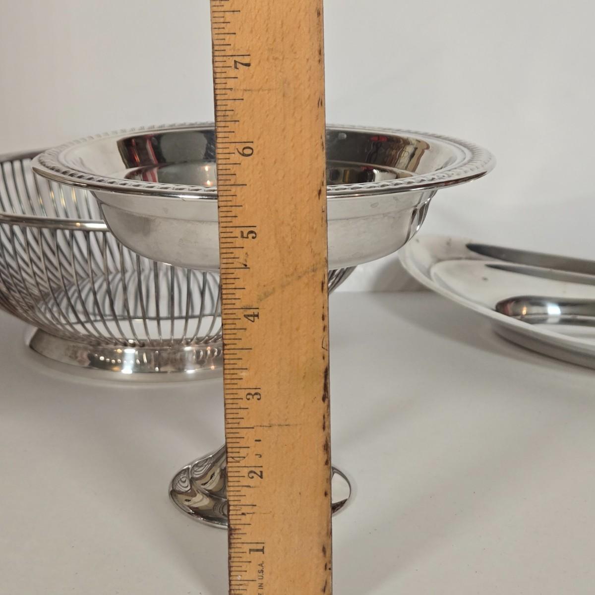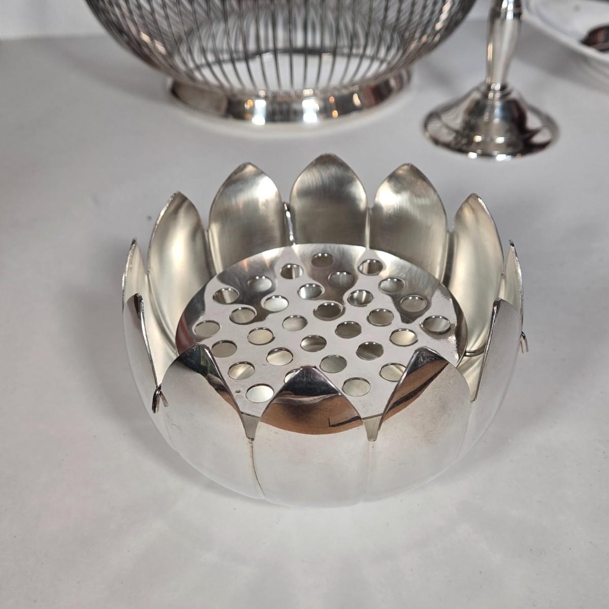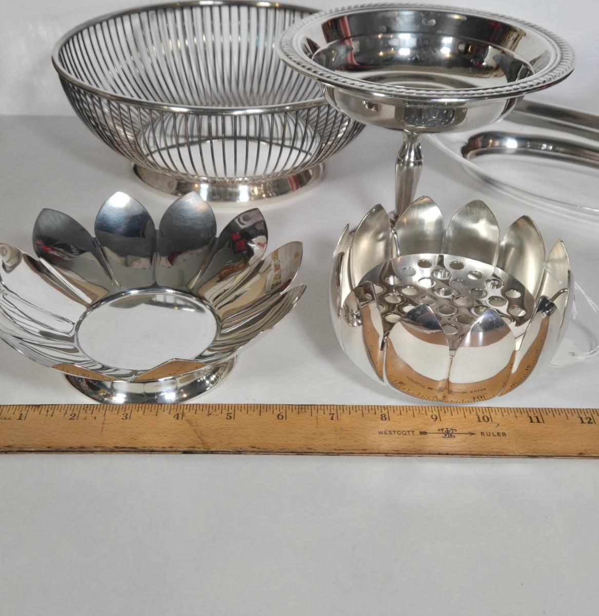 LOT 113: Art Deco Russel Wright Pancake and Corn Table Set, Silver Plate Flower Frog, Pedestal Candy Bowl, and More