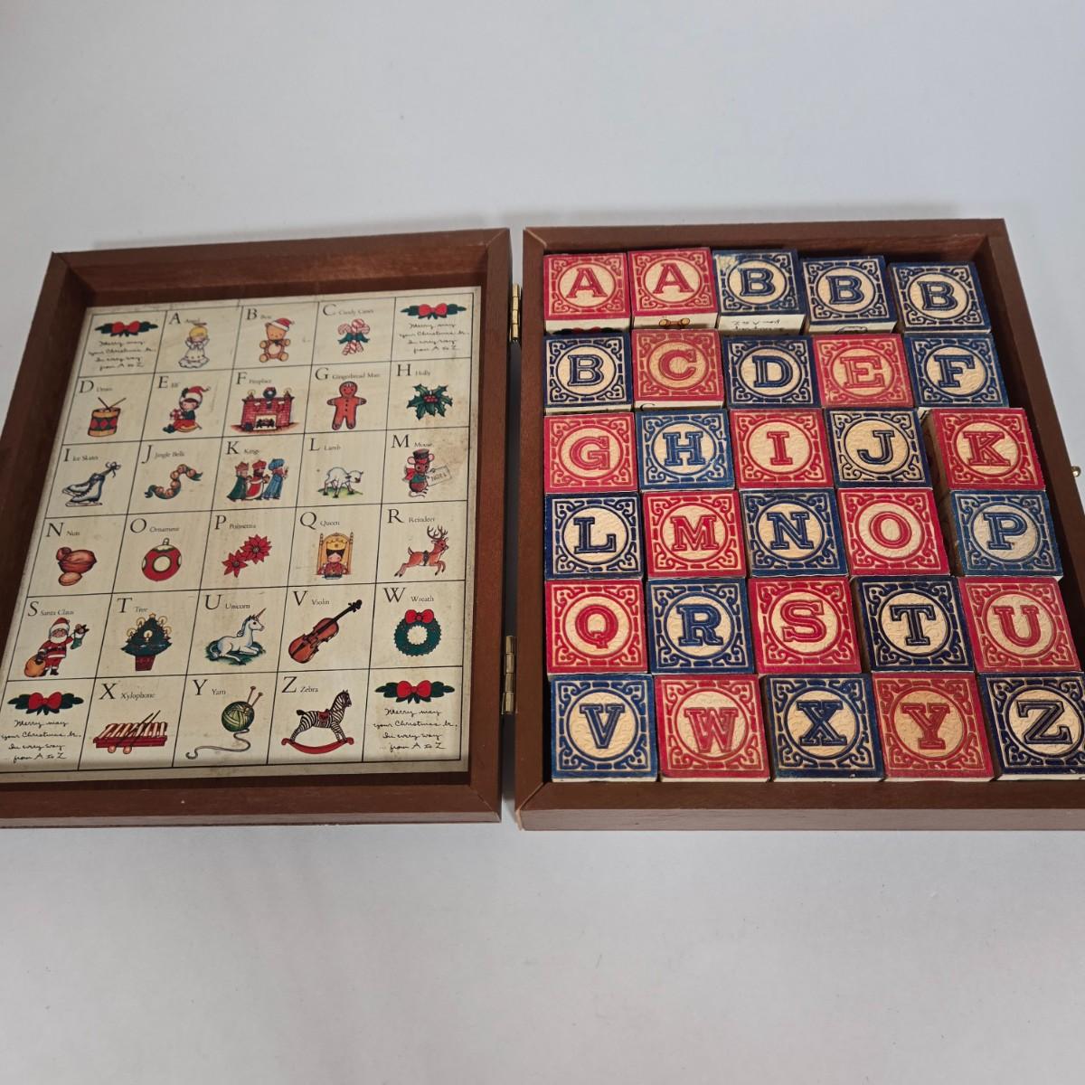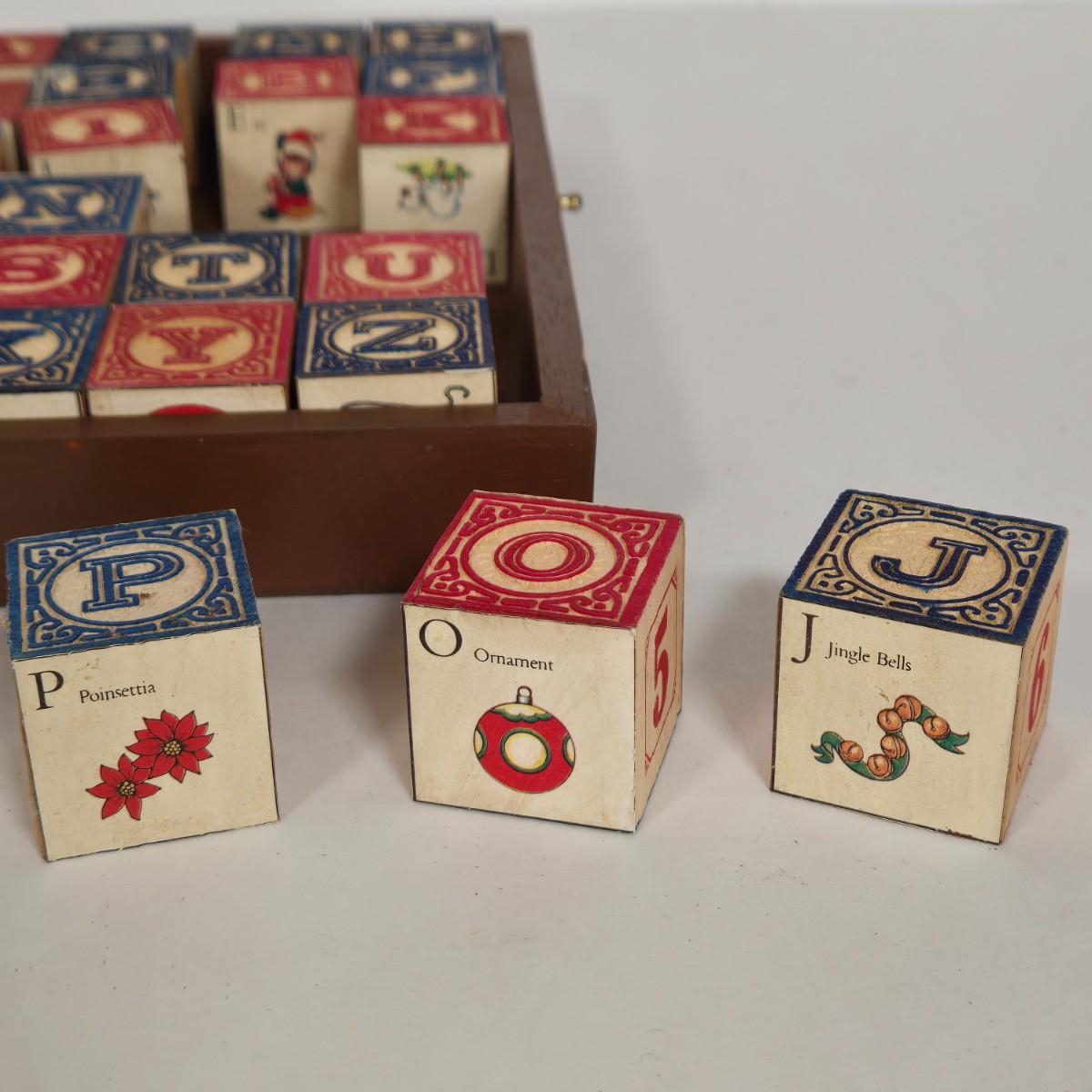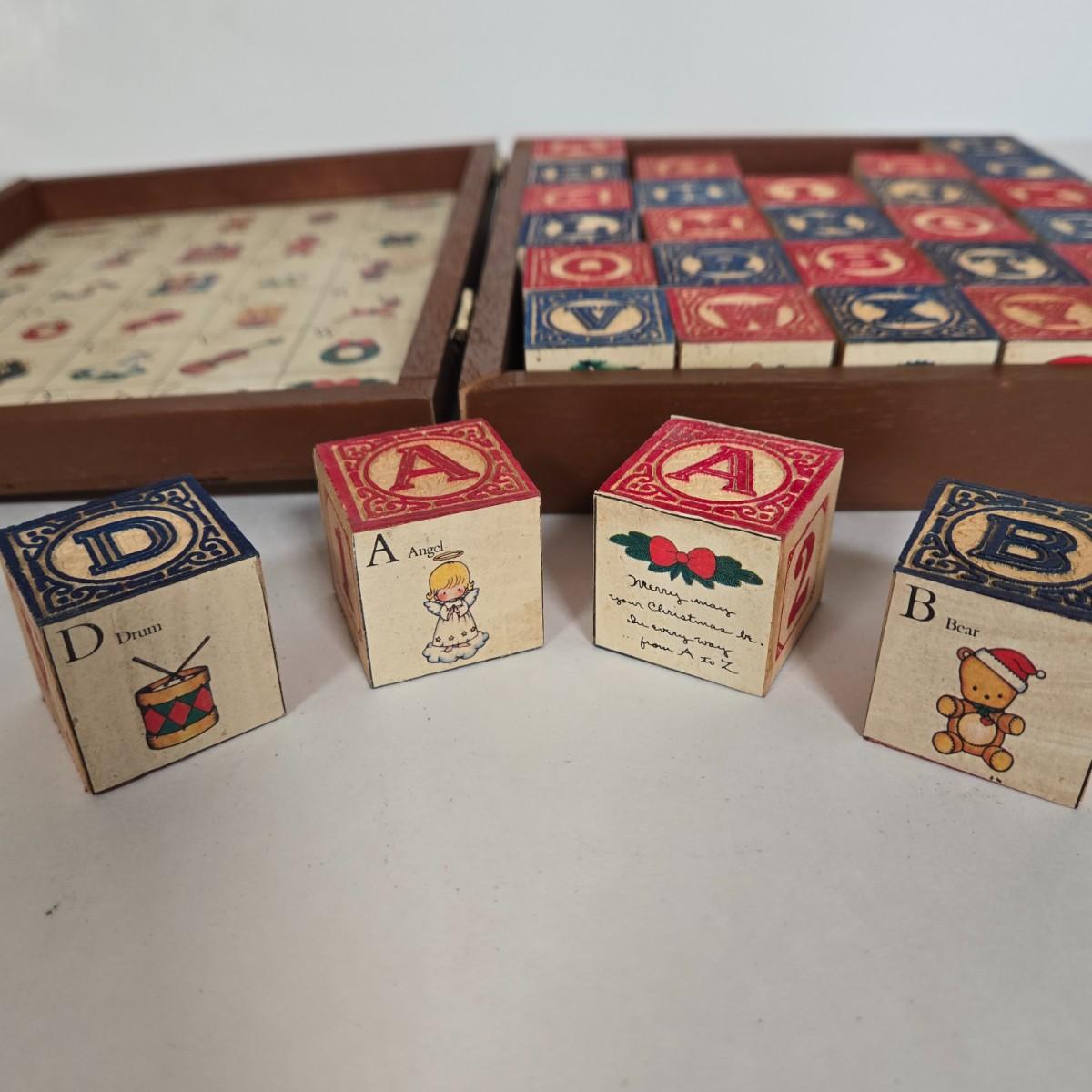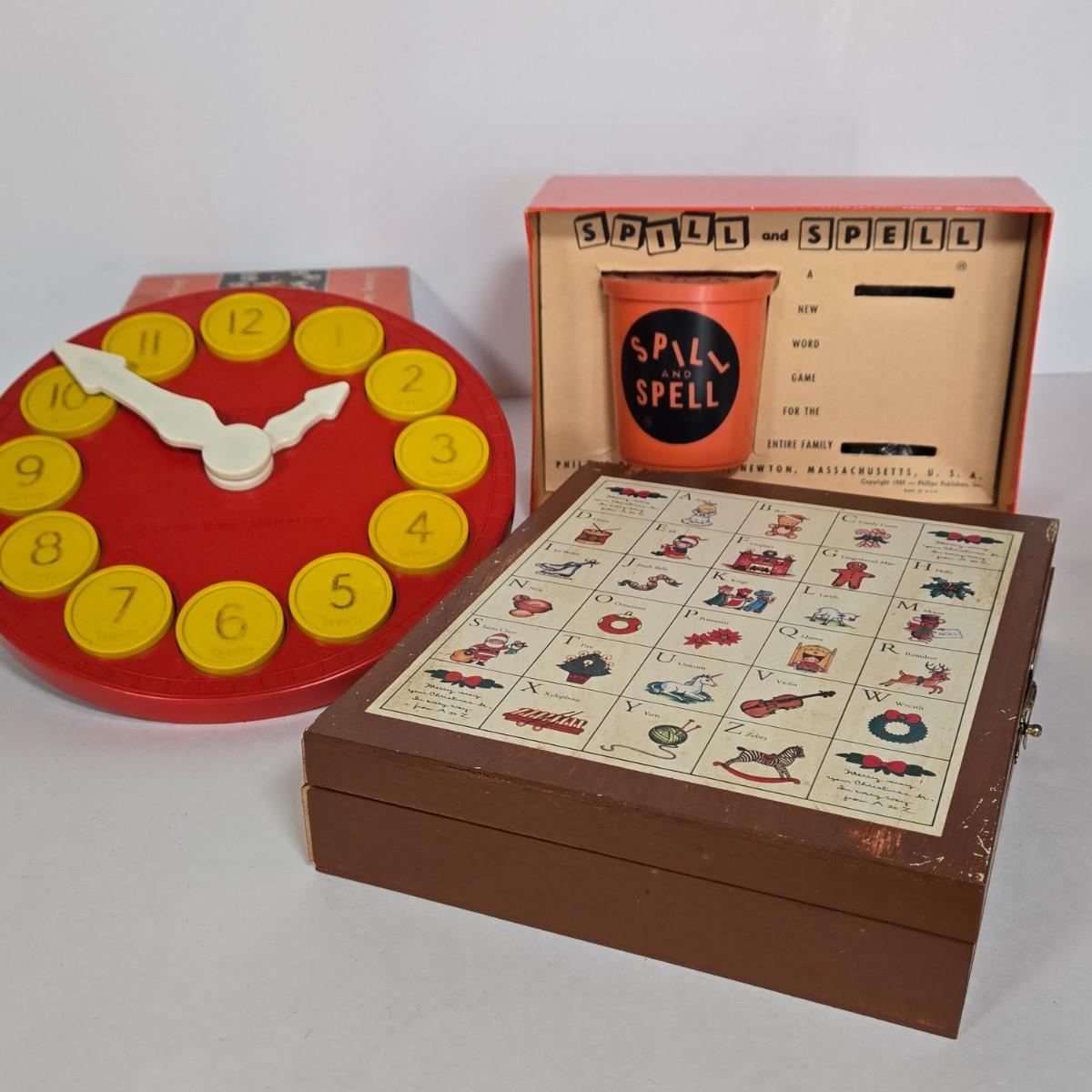 LOT 118G: Hillary Page Toy Clock, Vintage Spill and Spell Game, and Christmas Themed Block Set
