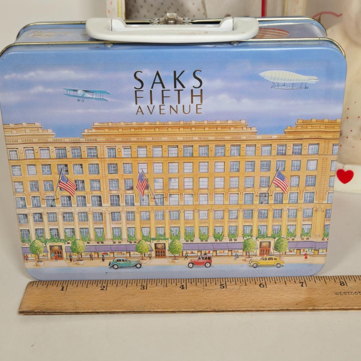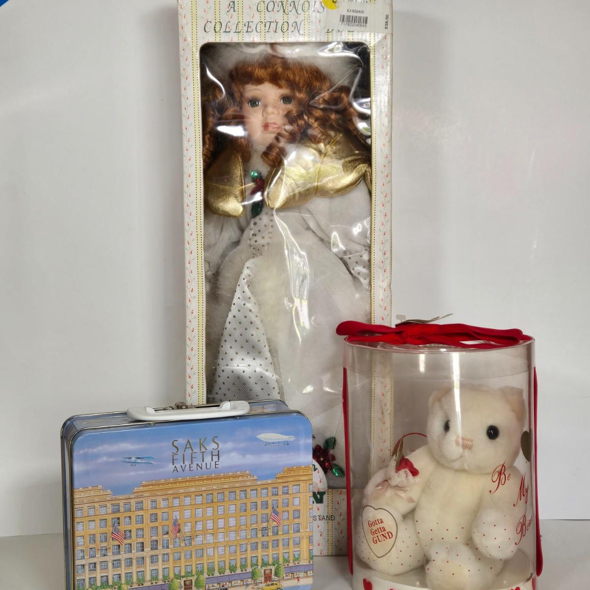 LOT 119G:NIB Seymour Mann Doll, Gund Valentines Bear, and Saks Fifth Avenue Lunch Box
