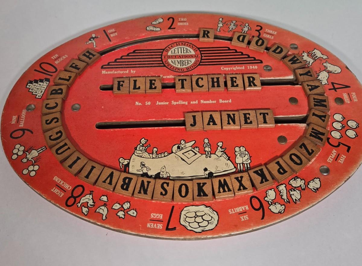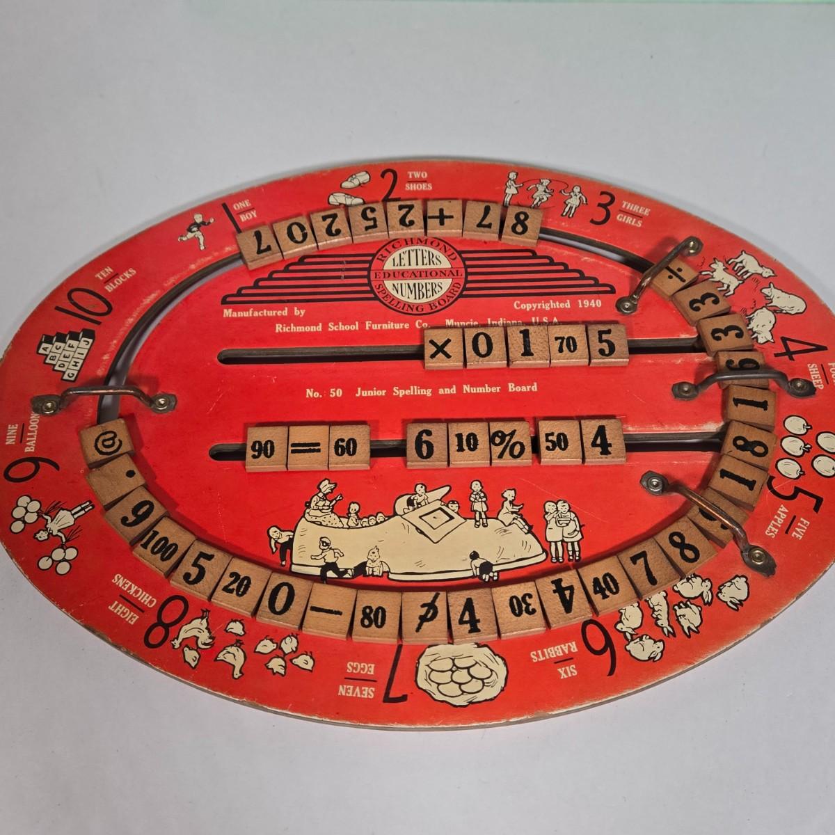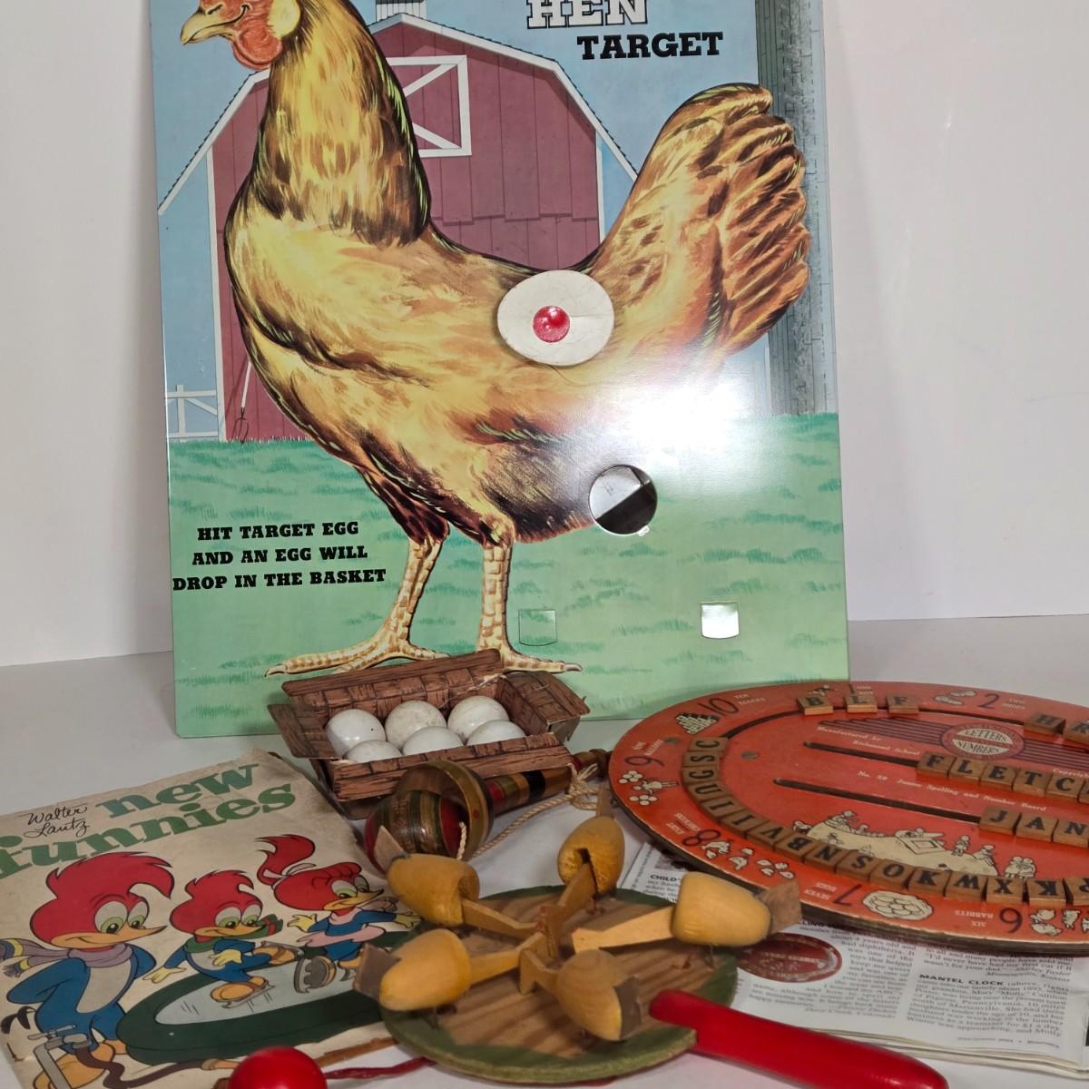 LOT 120G: Vintage Richmond Letters and Numbers Spelling Board, Dell Comic Book, Mother Hen Target Game, and More