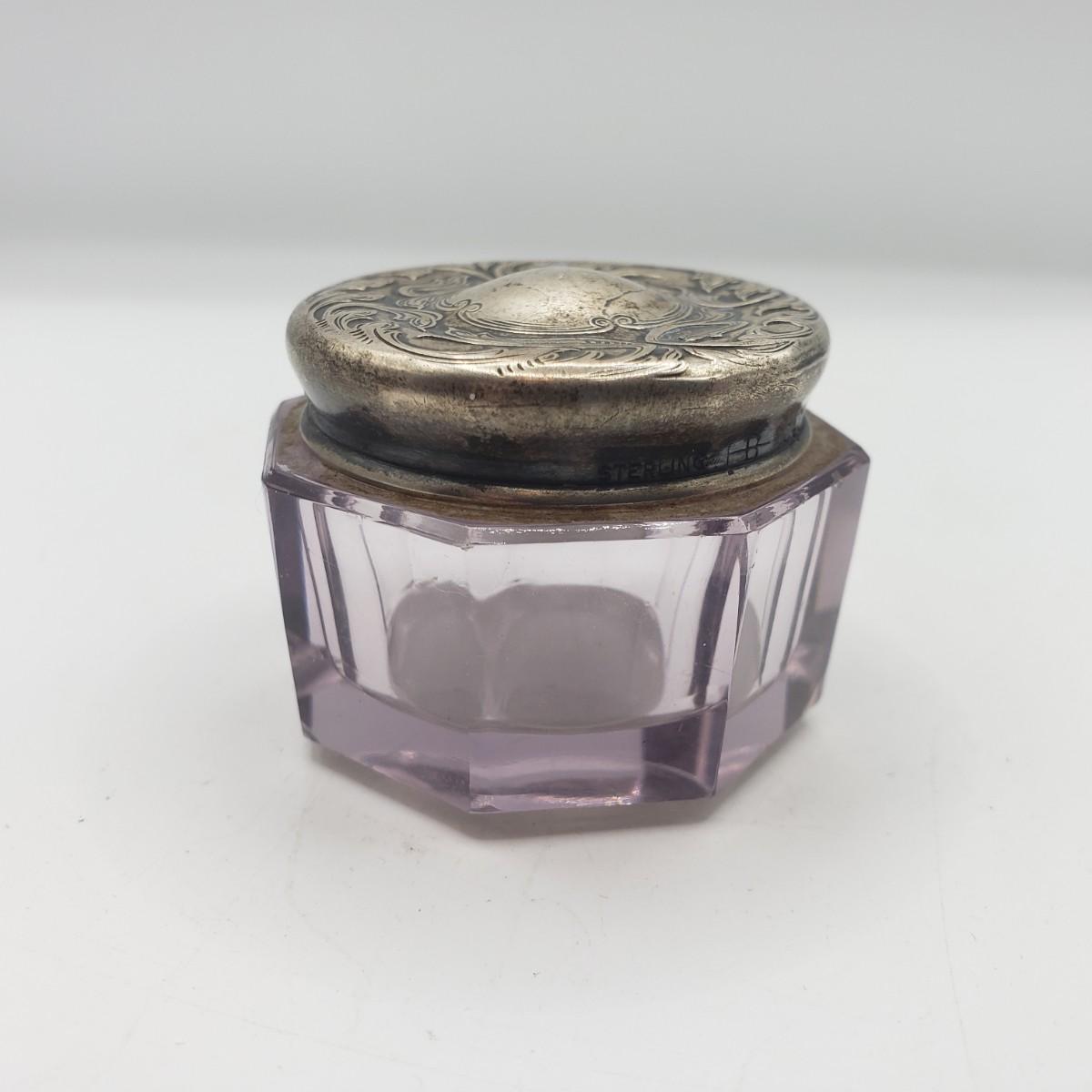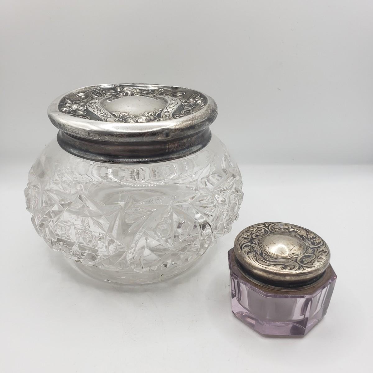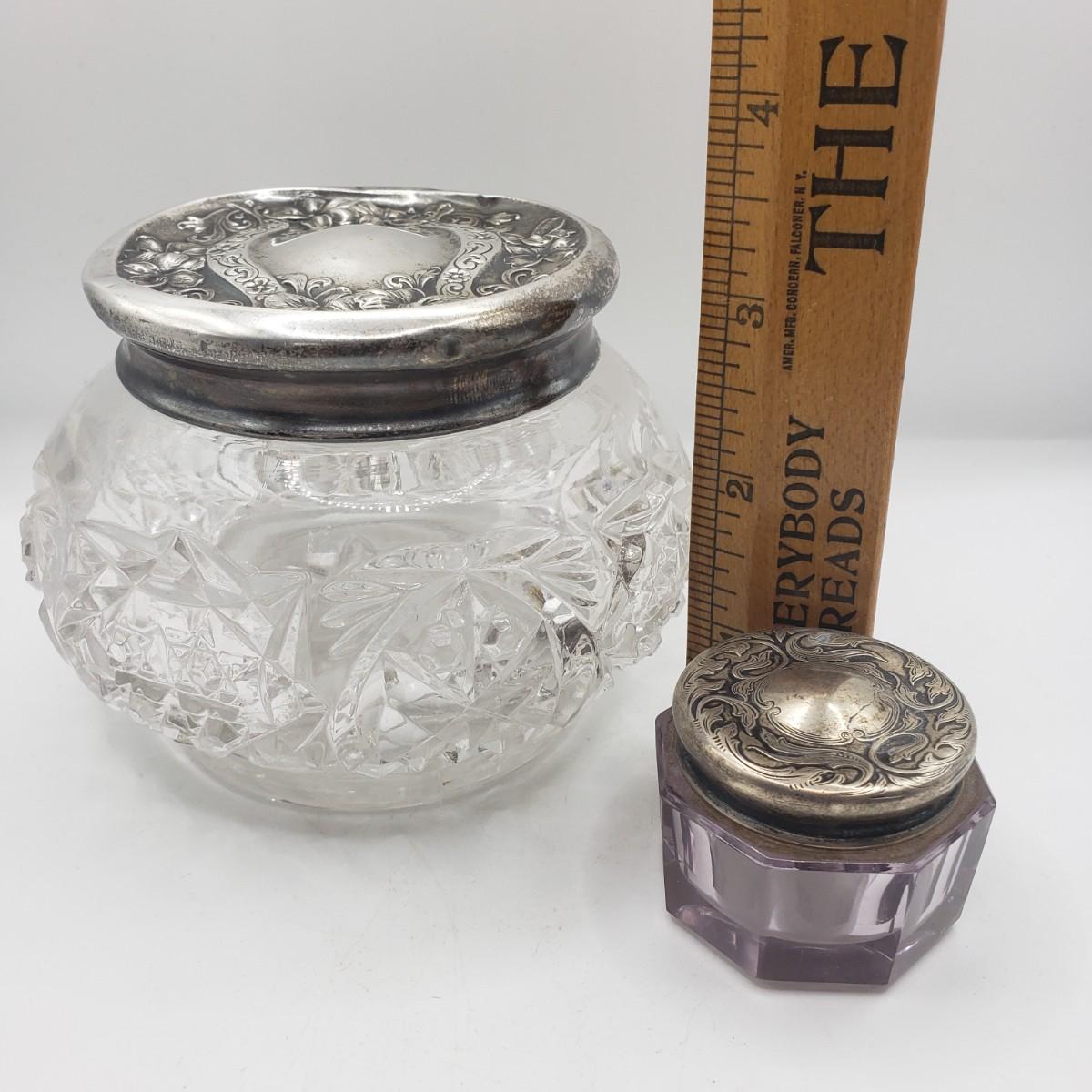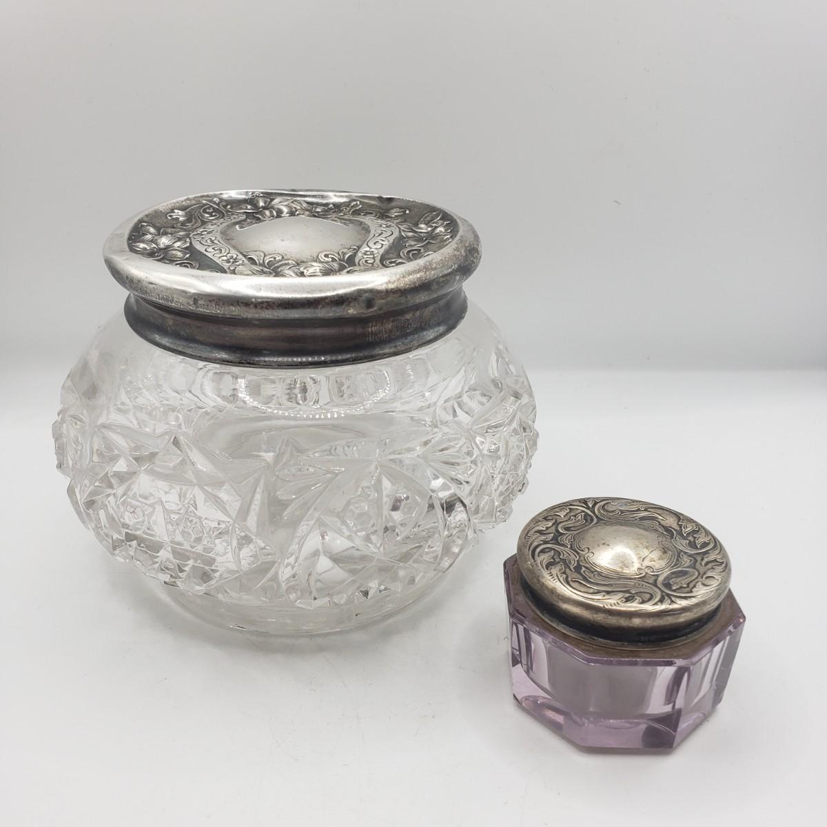 LOT 140F: Glass Powder Jar & Inkwell with Sterling Lids 26.74gtw
