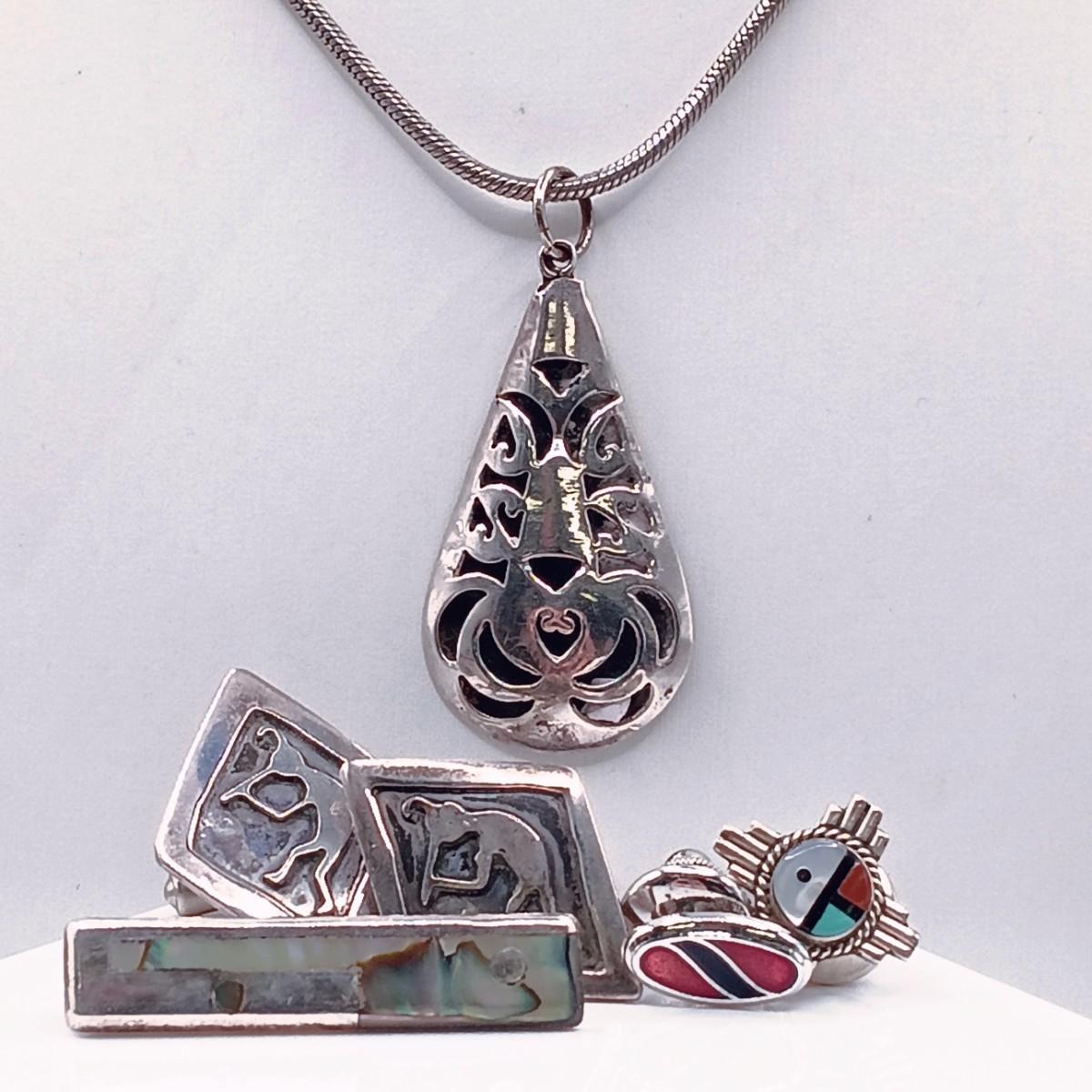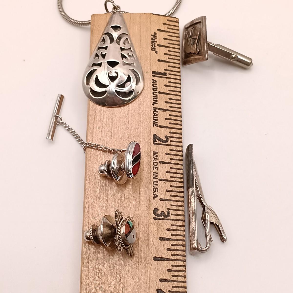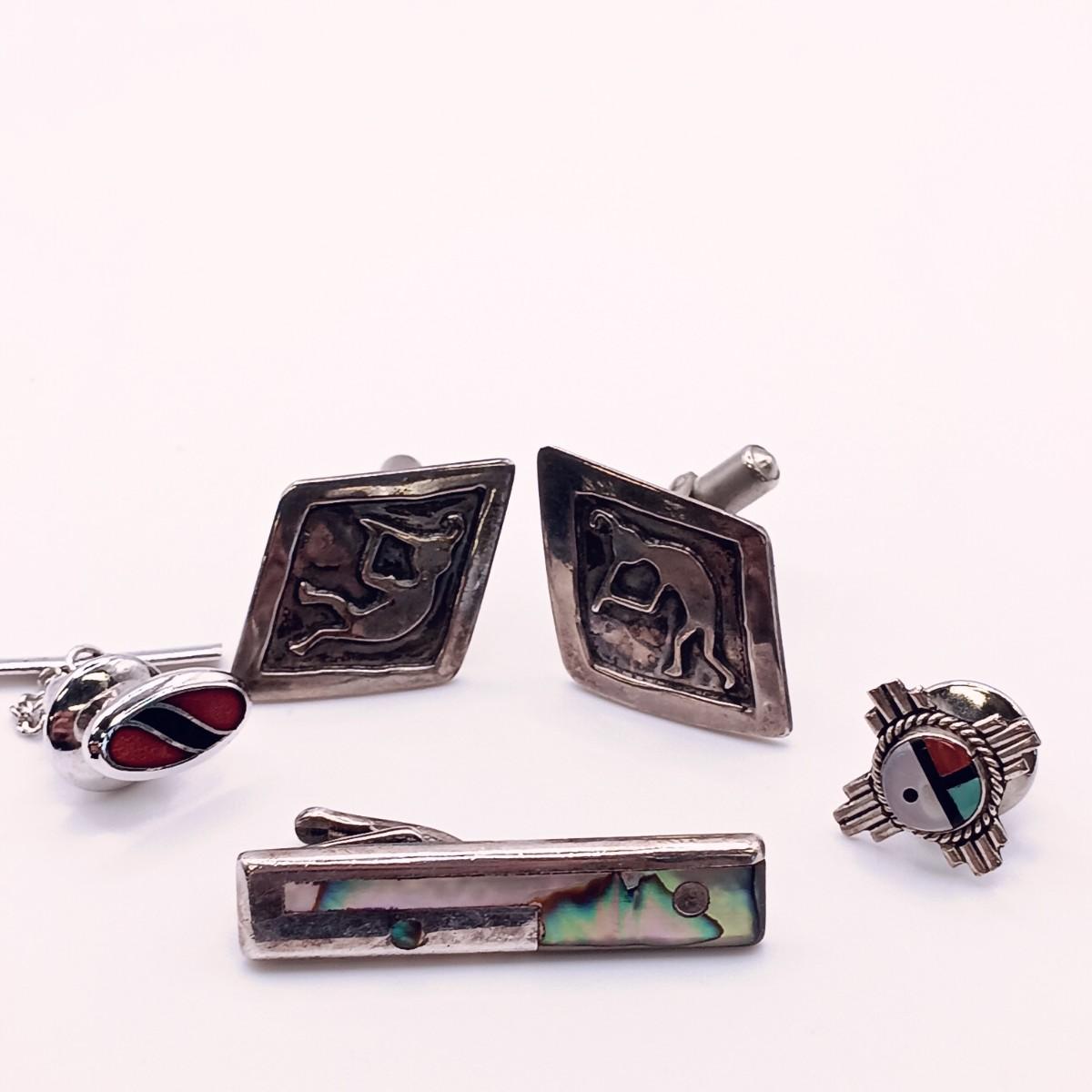 LOT 7: Sterling Silver Necklace from Guadalupe, Mexico with Abalone and Sterling Tie Clip, Sterling Kokopelli Cufflinks & Silver-Tone Tie Tacks