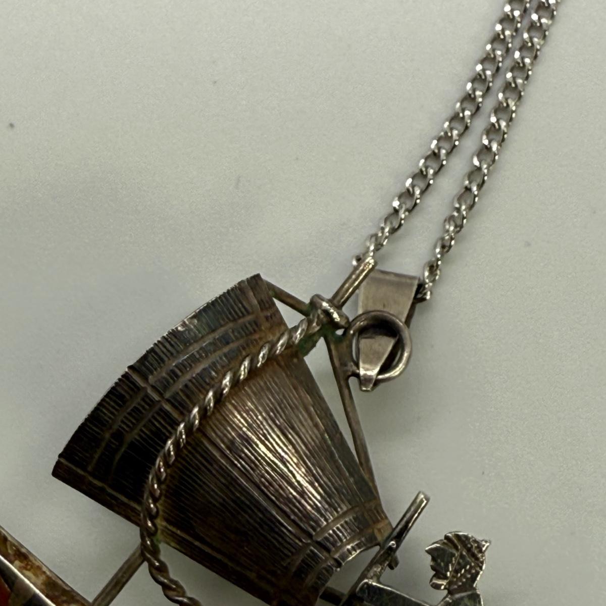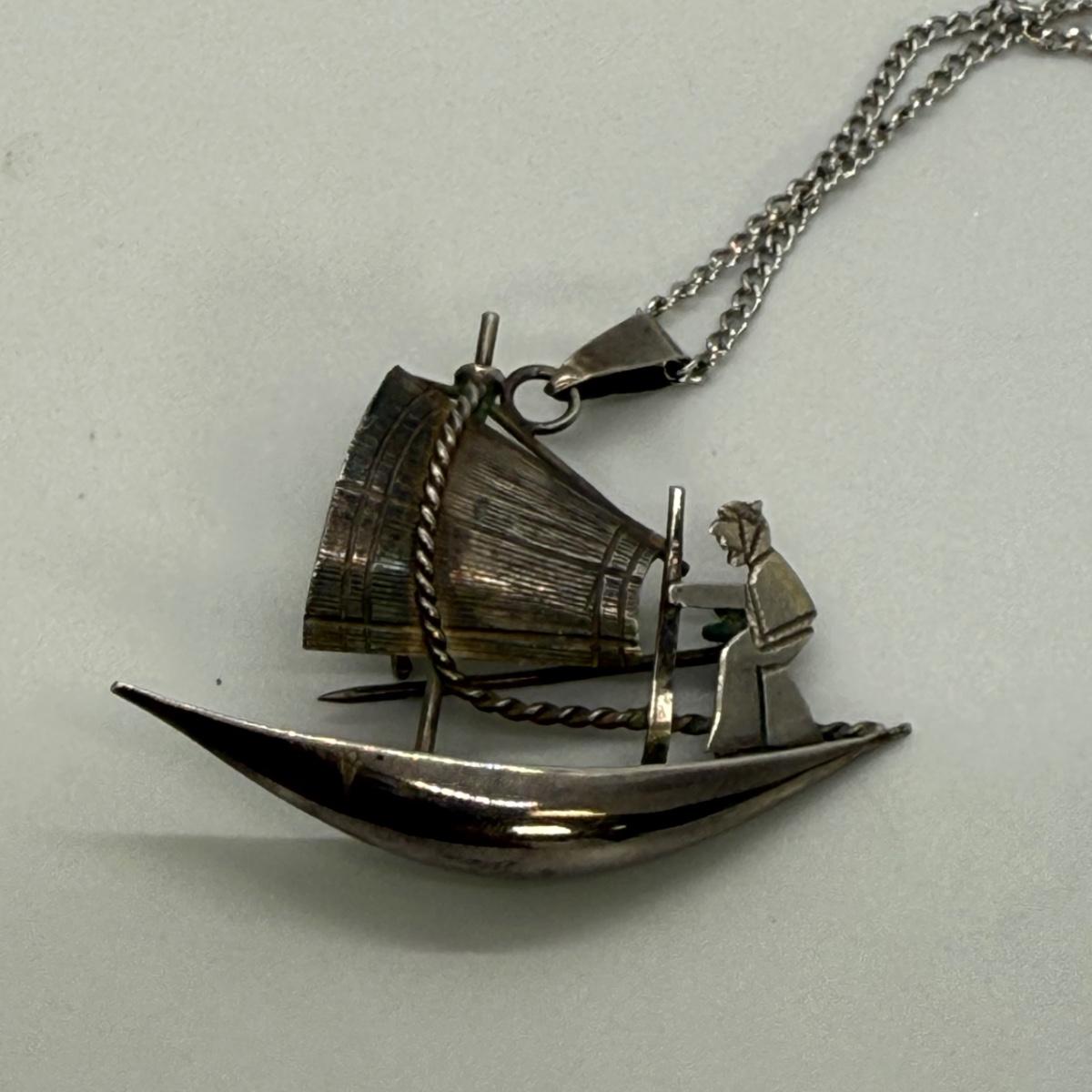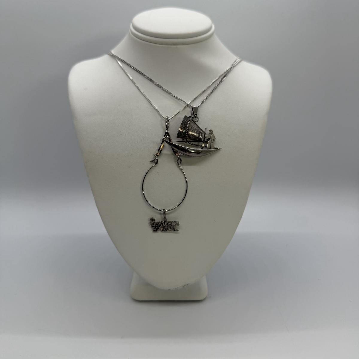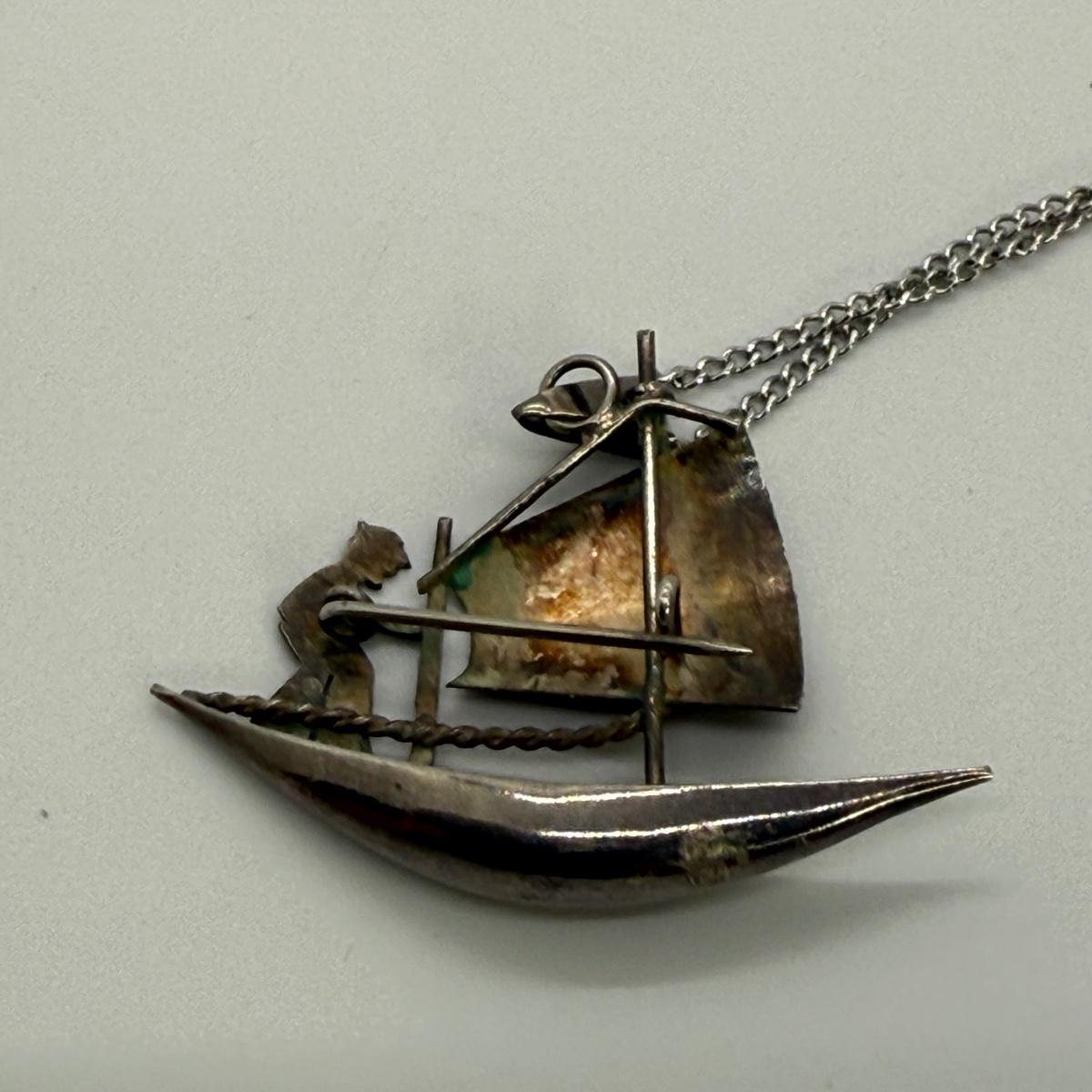 LOT 40: 30” 925 Box Chain with 925 Charm Holder 5.1 gtw and 16” Fine Chain w/ 925 Asian Boat Brooch/Pendant 3.8gtw