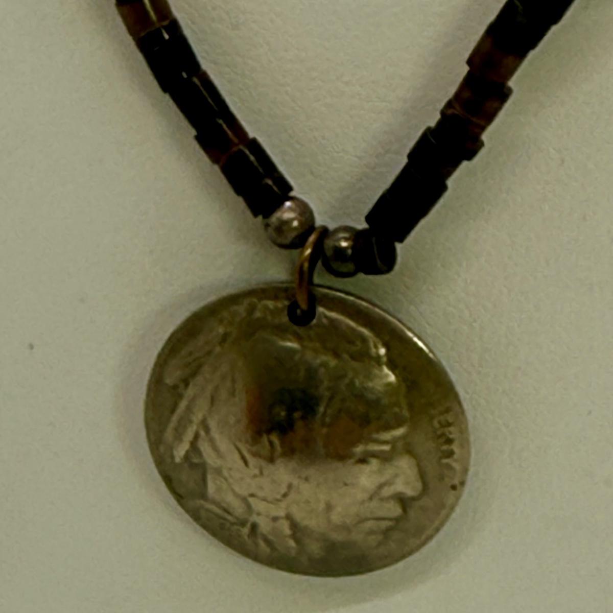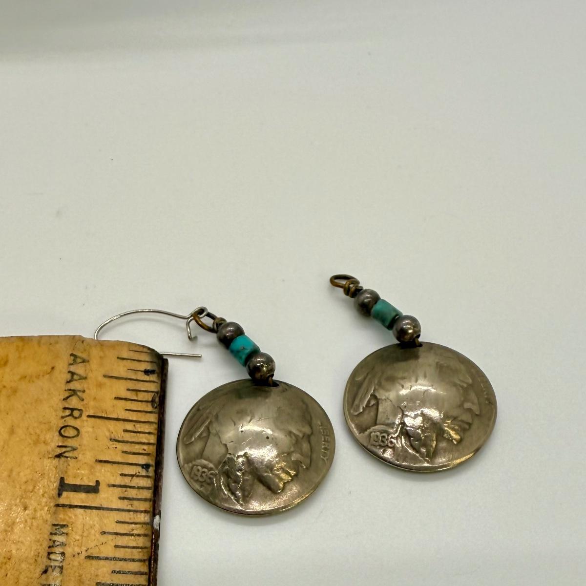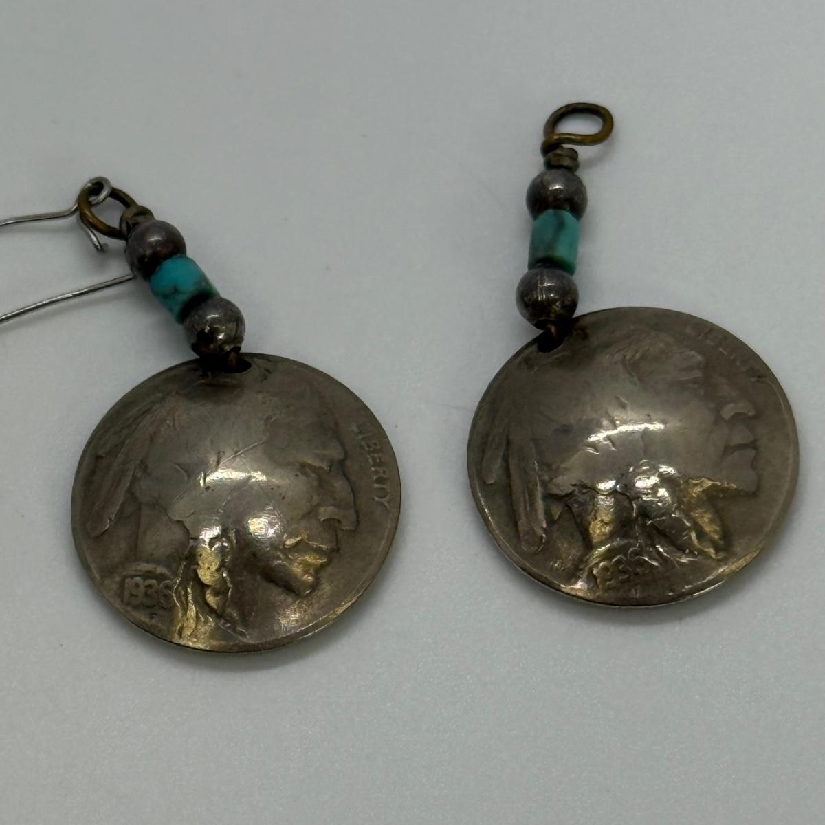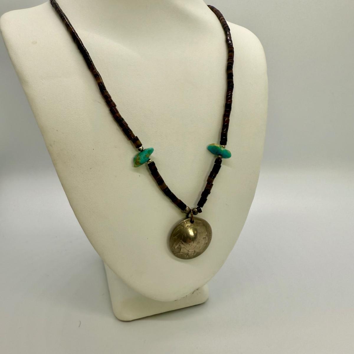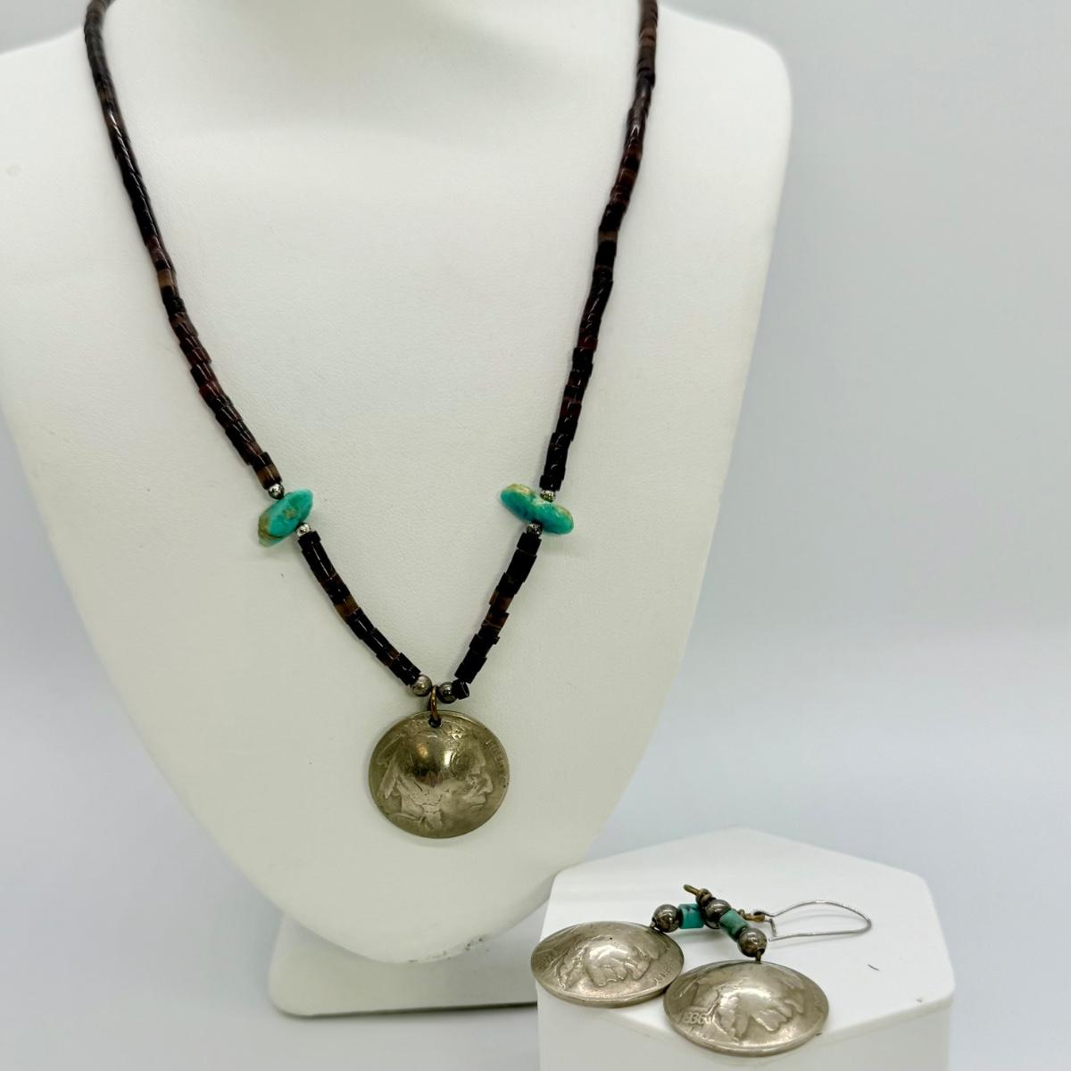 LOT 41: Vintage Navajo 18” Necklace w/ Turquoise and Buffalo Nickel Pendant and Matching Earrings 22.8 gtw