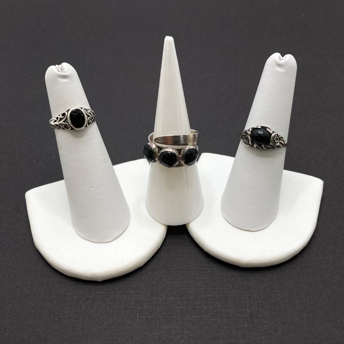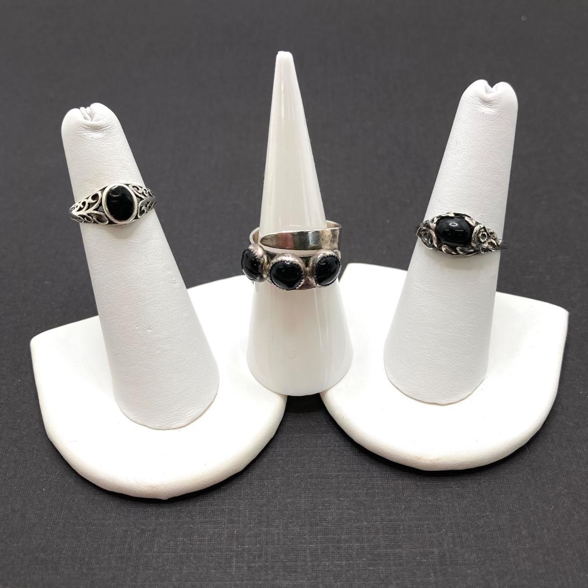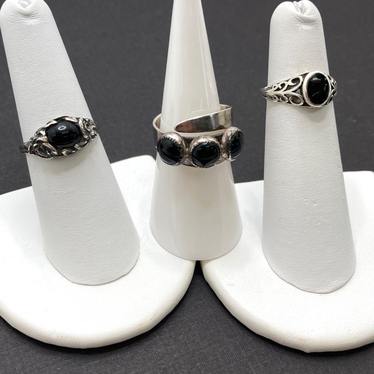 LOT 59: Three Sterling and Black Onyx Rings Sizes 4.5, 6 and 7 - 8.8 gtw