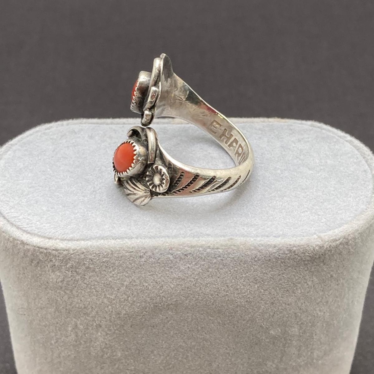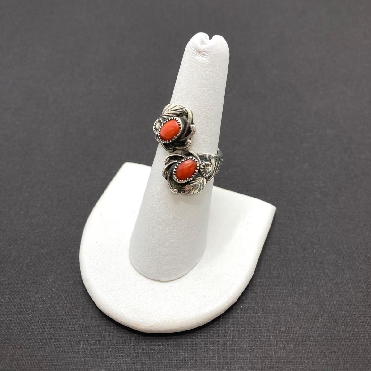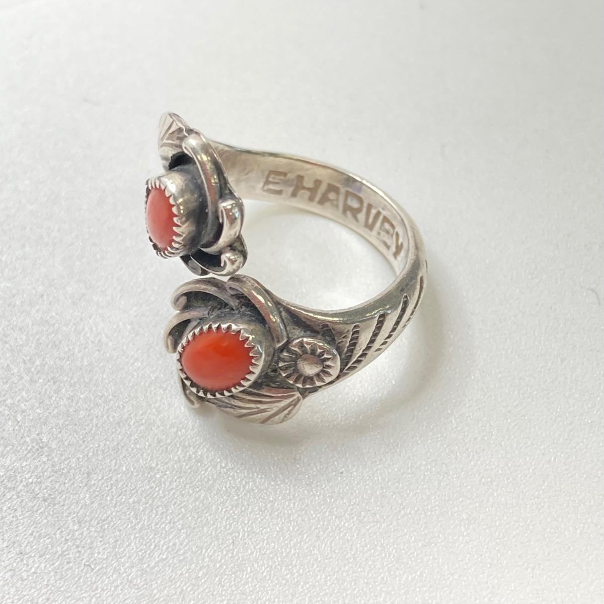 LOT 60: Vintage 1960's - 1970's E. Harvey (Emerson Harvey) Native American Bypass Silver and Coral Ring Sz 6.5 - 5.6 gtw