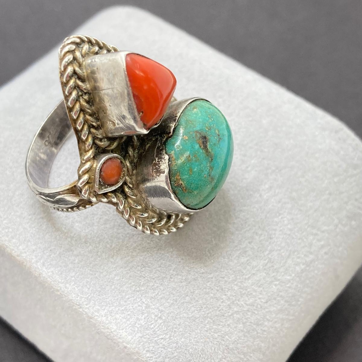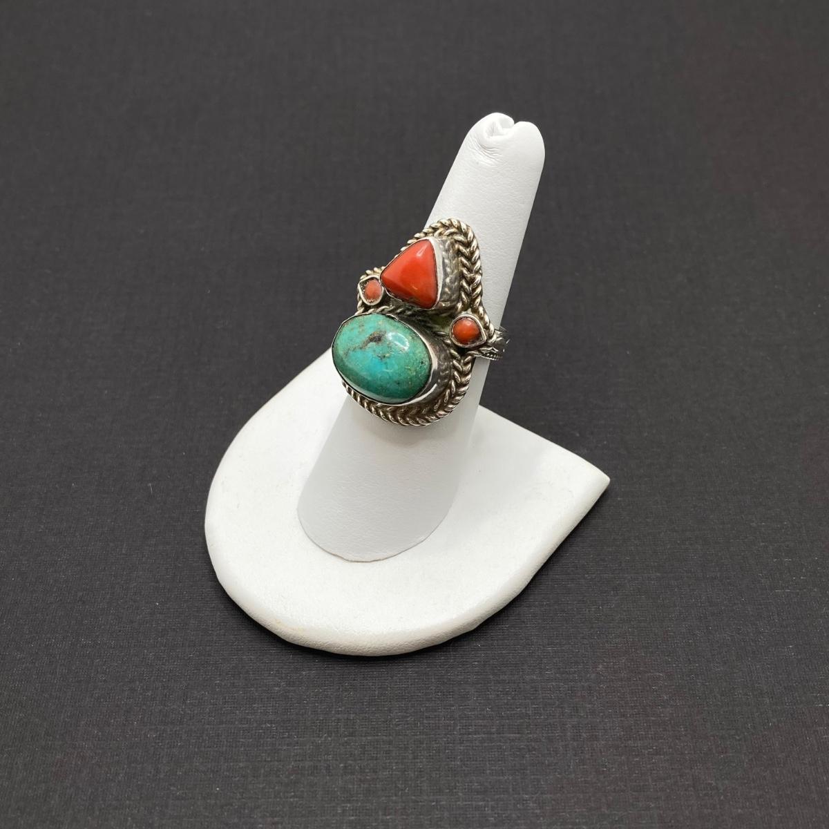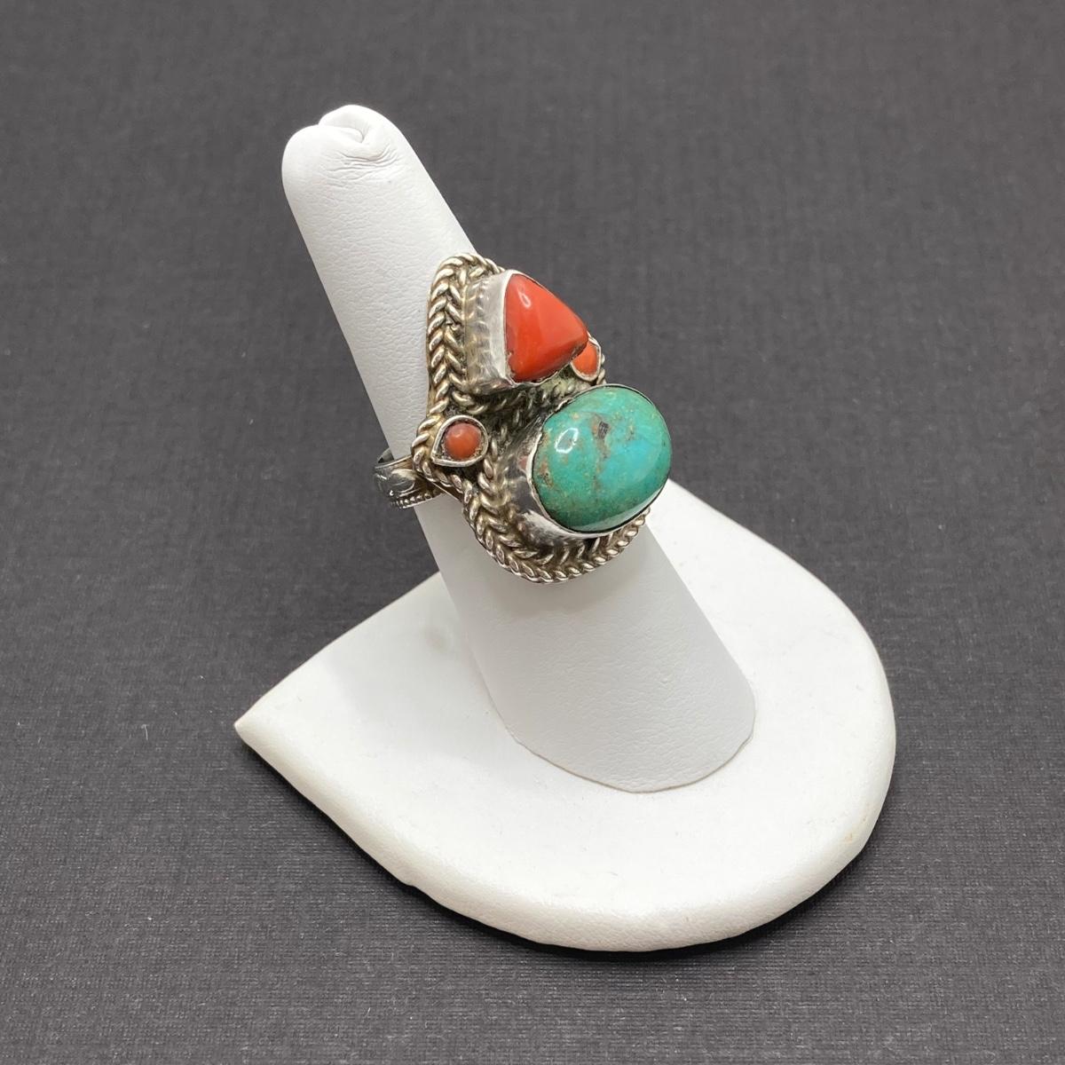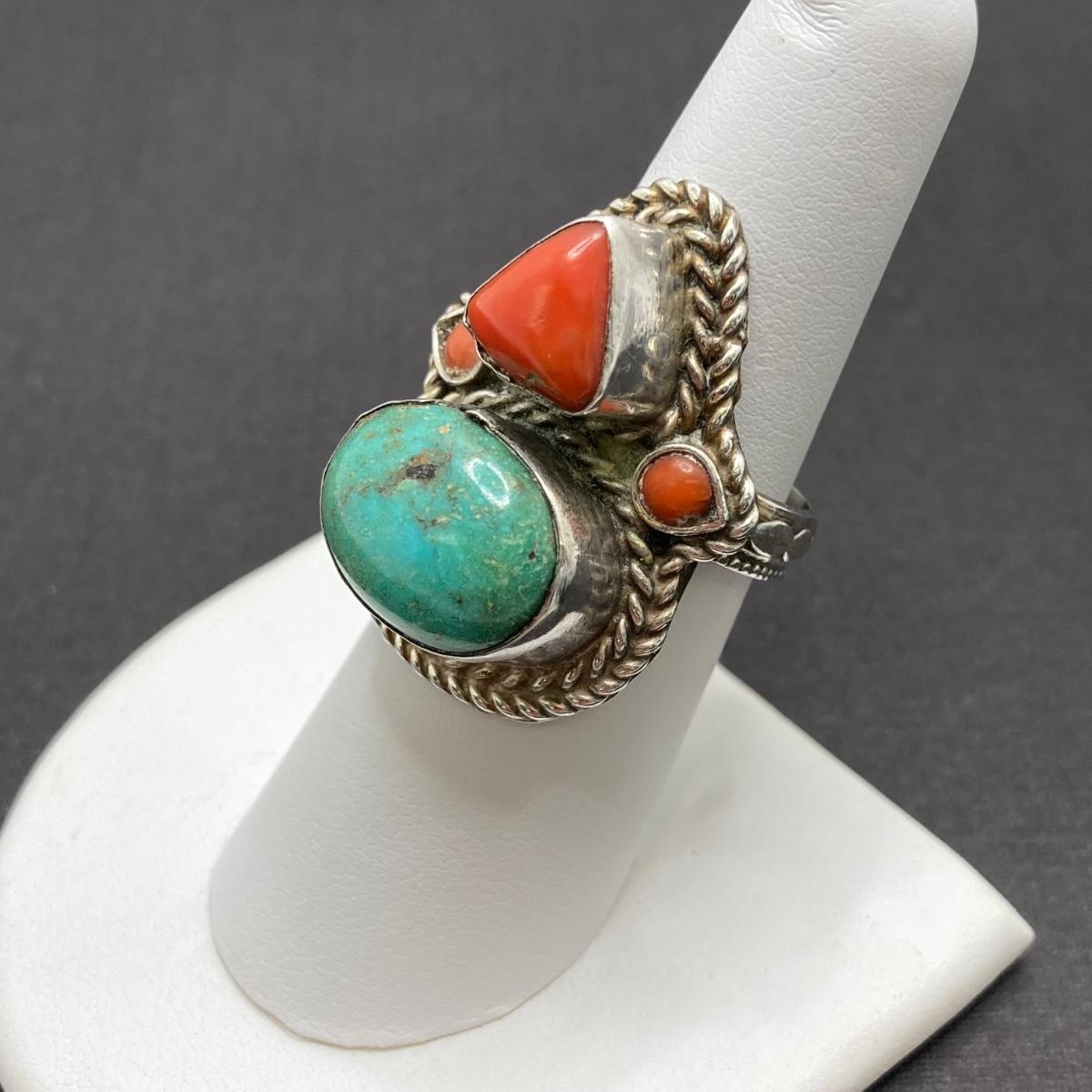 LOT 64: Vintage Sterling Silver 925 Native American Turquoise and Coral Stone Ring Sz 7, 1.25" in Height and 12.3 gtw