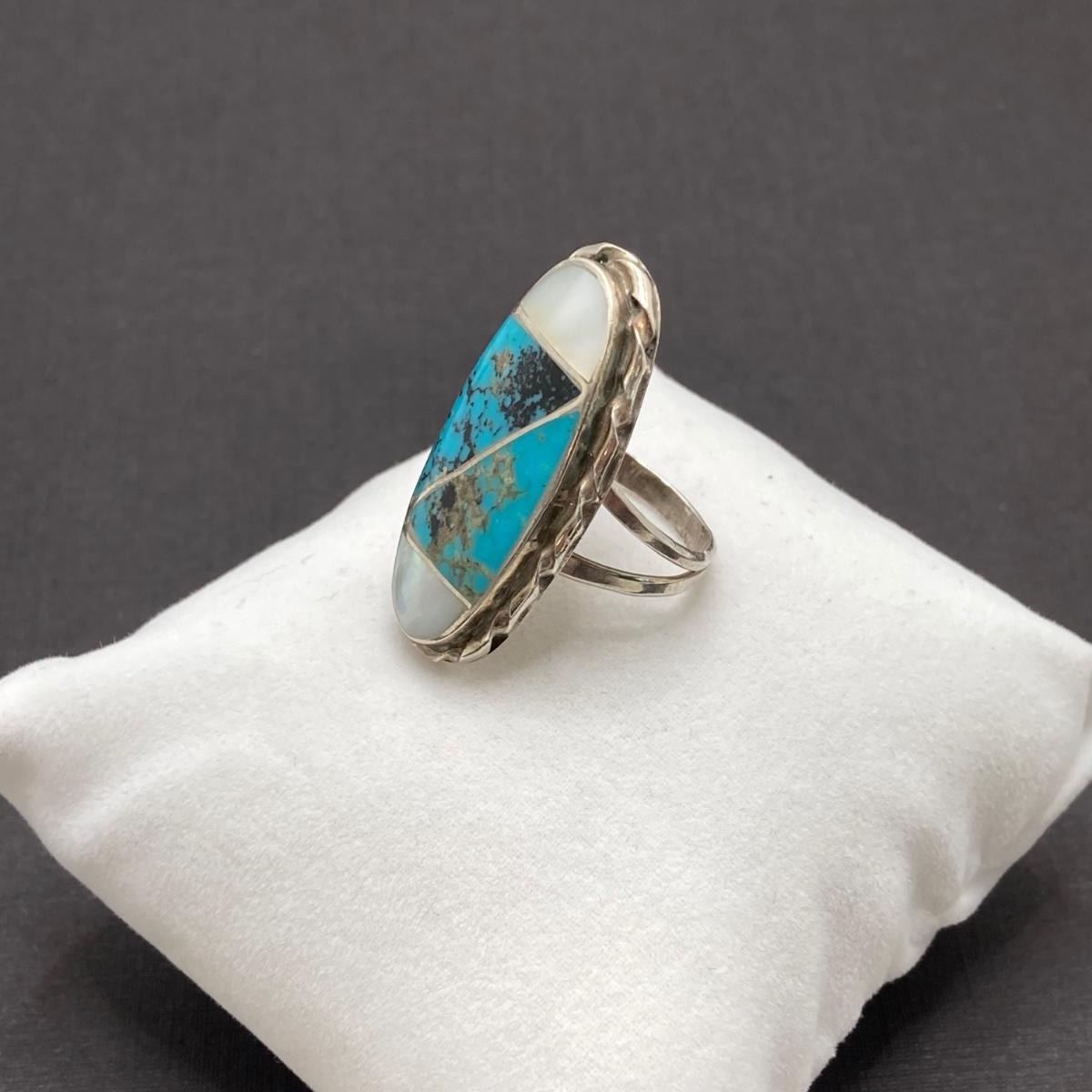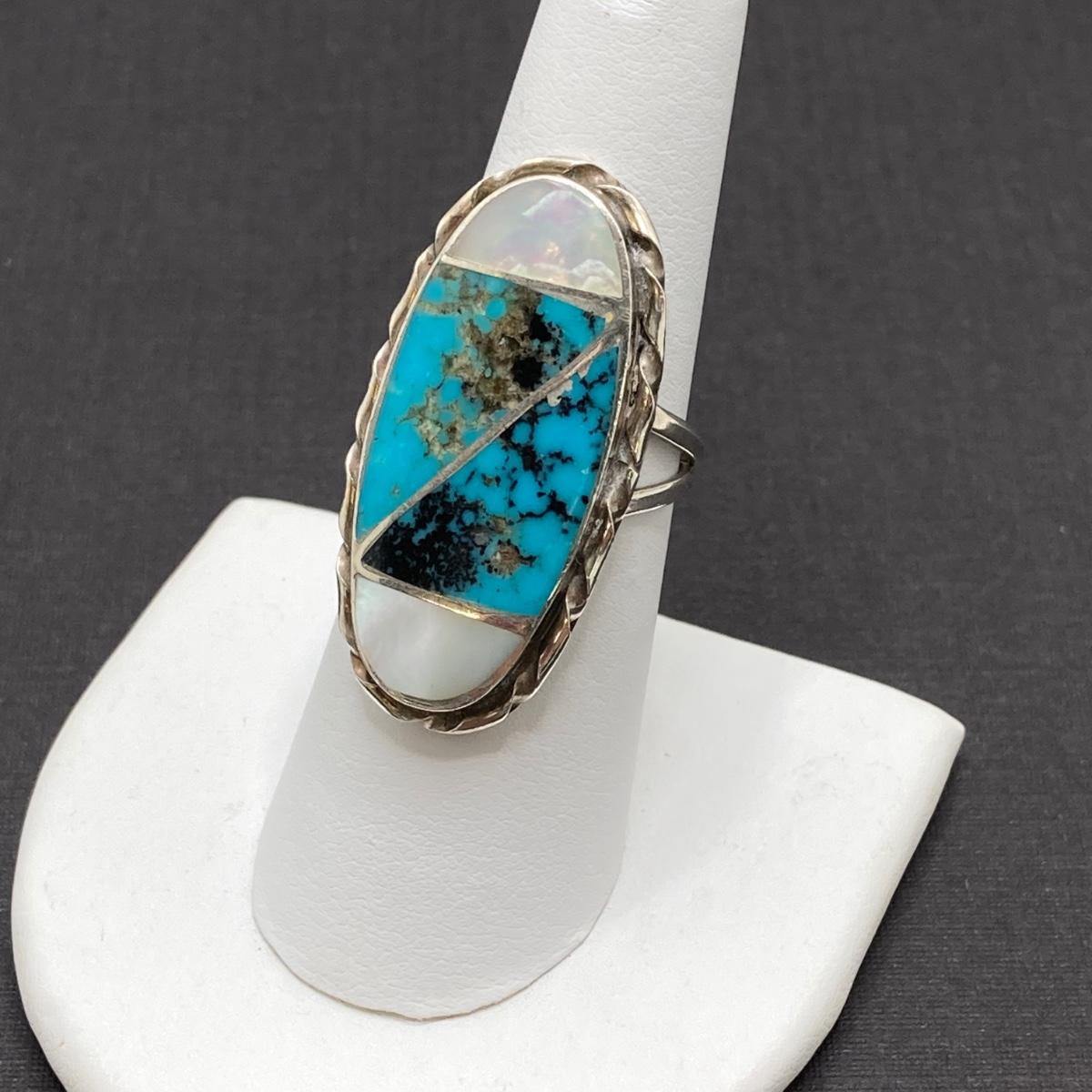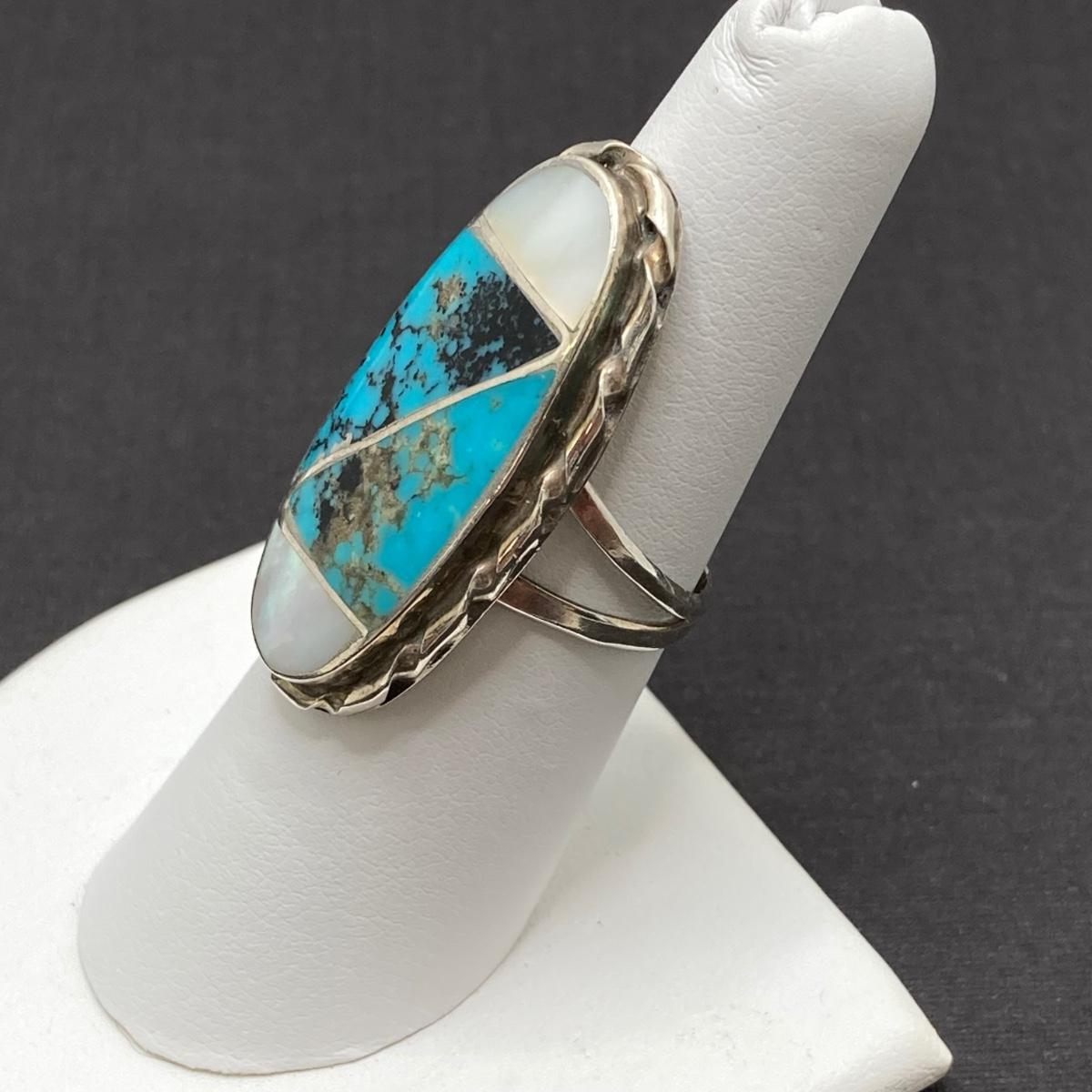 LOT 69: Stunning Turquoise and Mother of Pearl Inlay Native American Navajo Statement Ring by N. Lee (Norman Lee) - 7.7 gtw