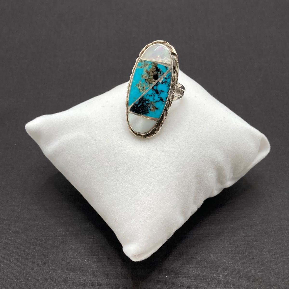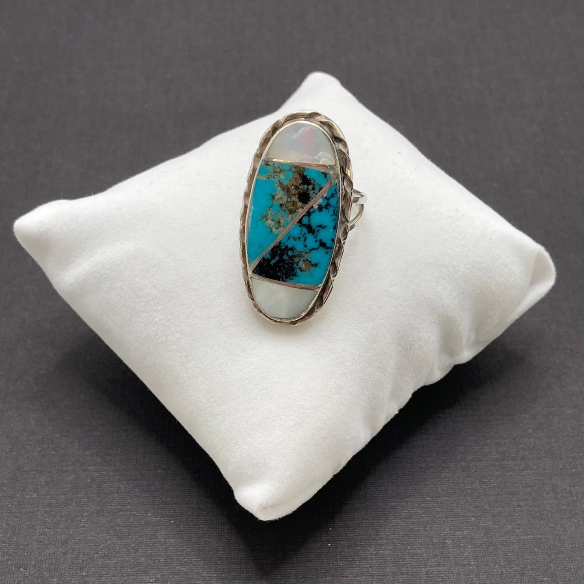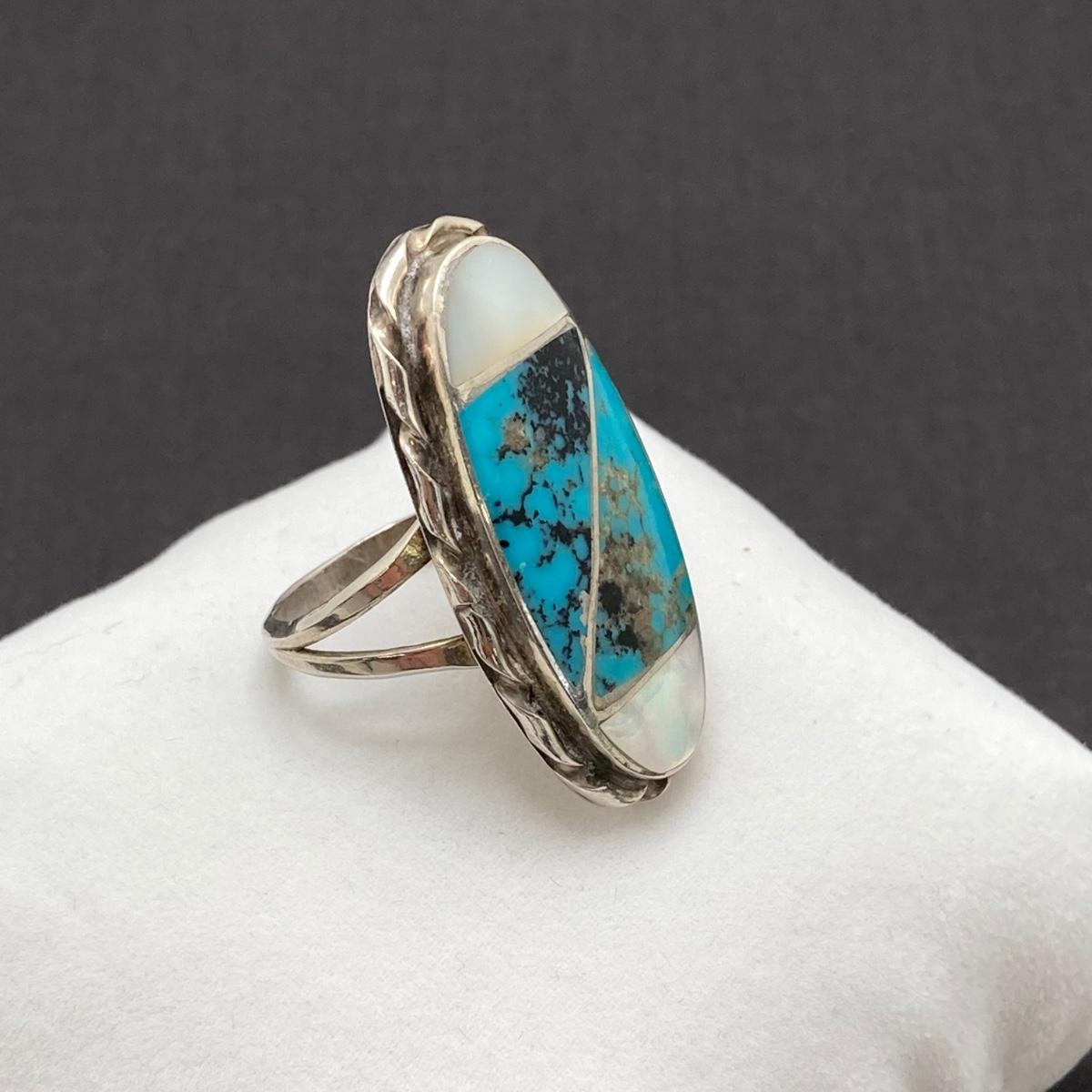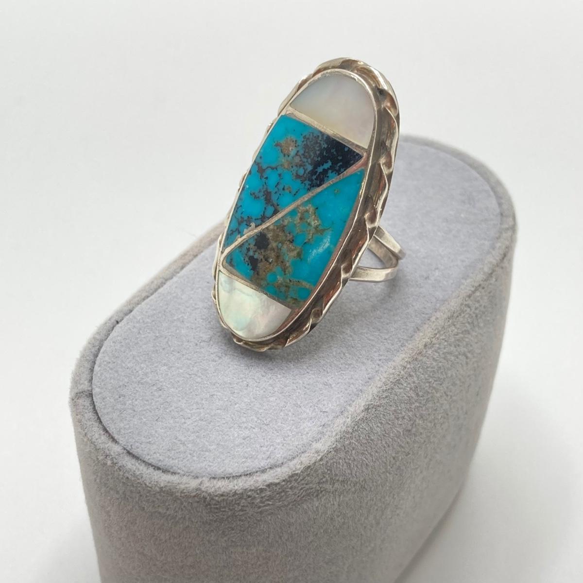 LOT 69: Stunning Turquoise and Mother of Pearl Inlay Native American Navajo Statement Ring by N. Lee (Norman Lee) - 7.7 gtw