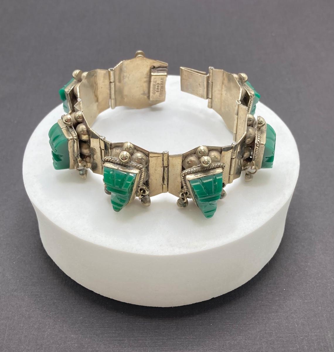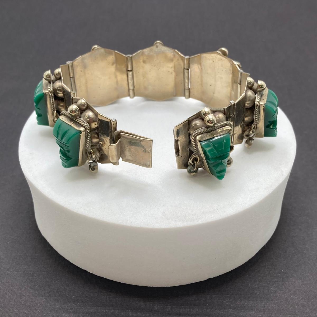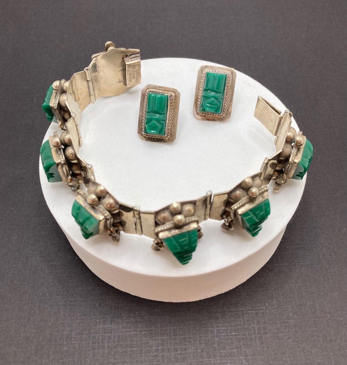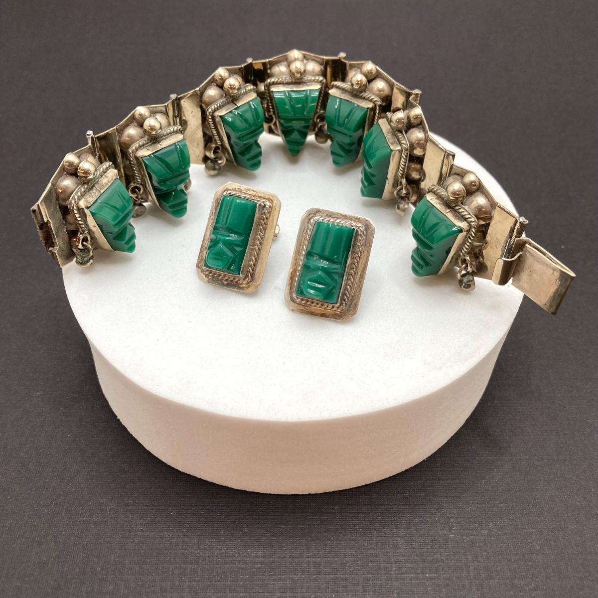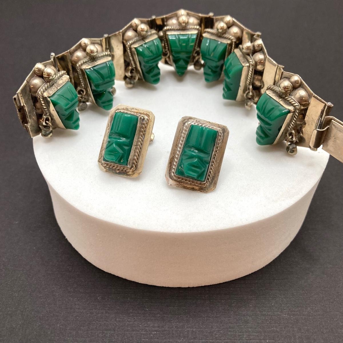 LOT 74: Vintage Sterling Taxco Mexico Carved Green Onyx Mayan Faces Panel Bracelet 6.5" and Screw Back Earrings - 46.0 gtw