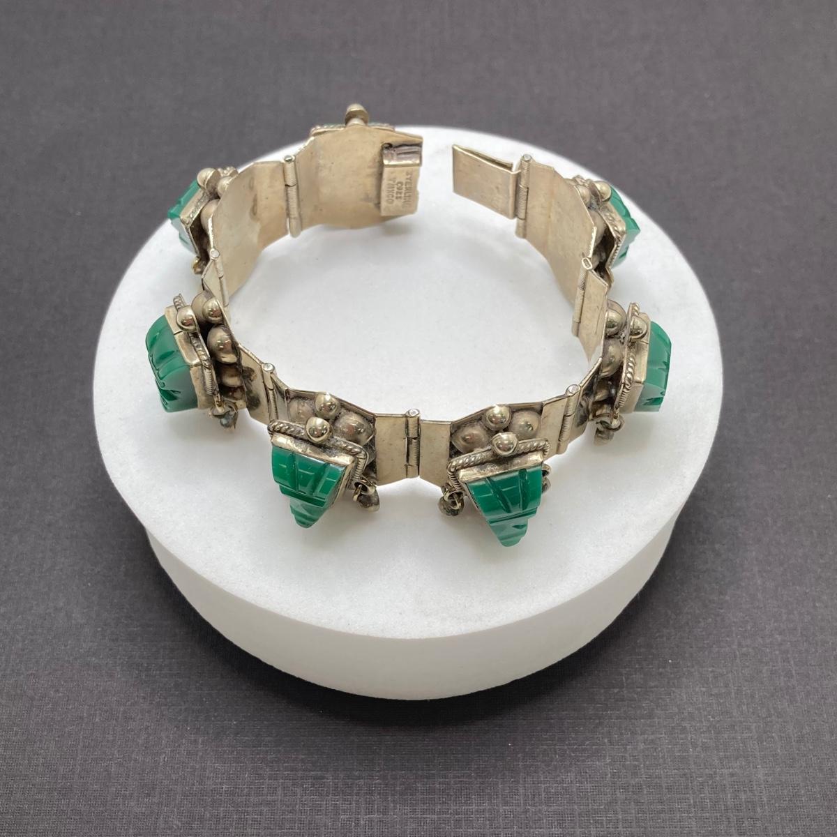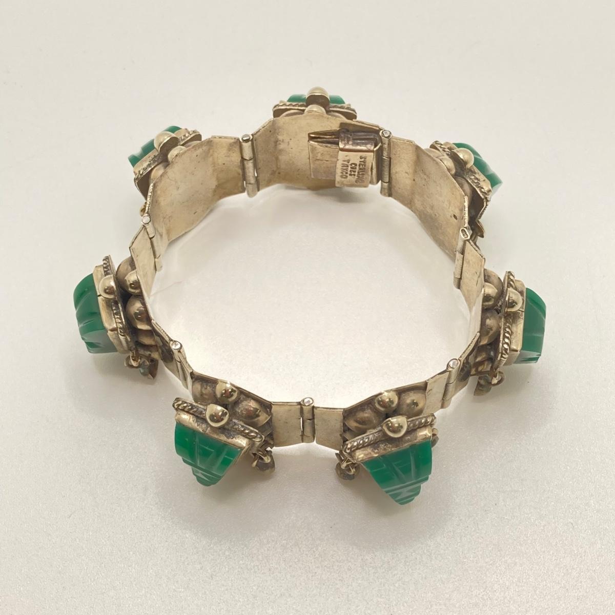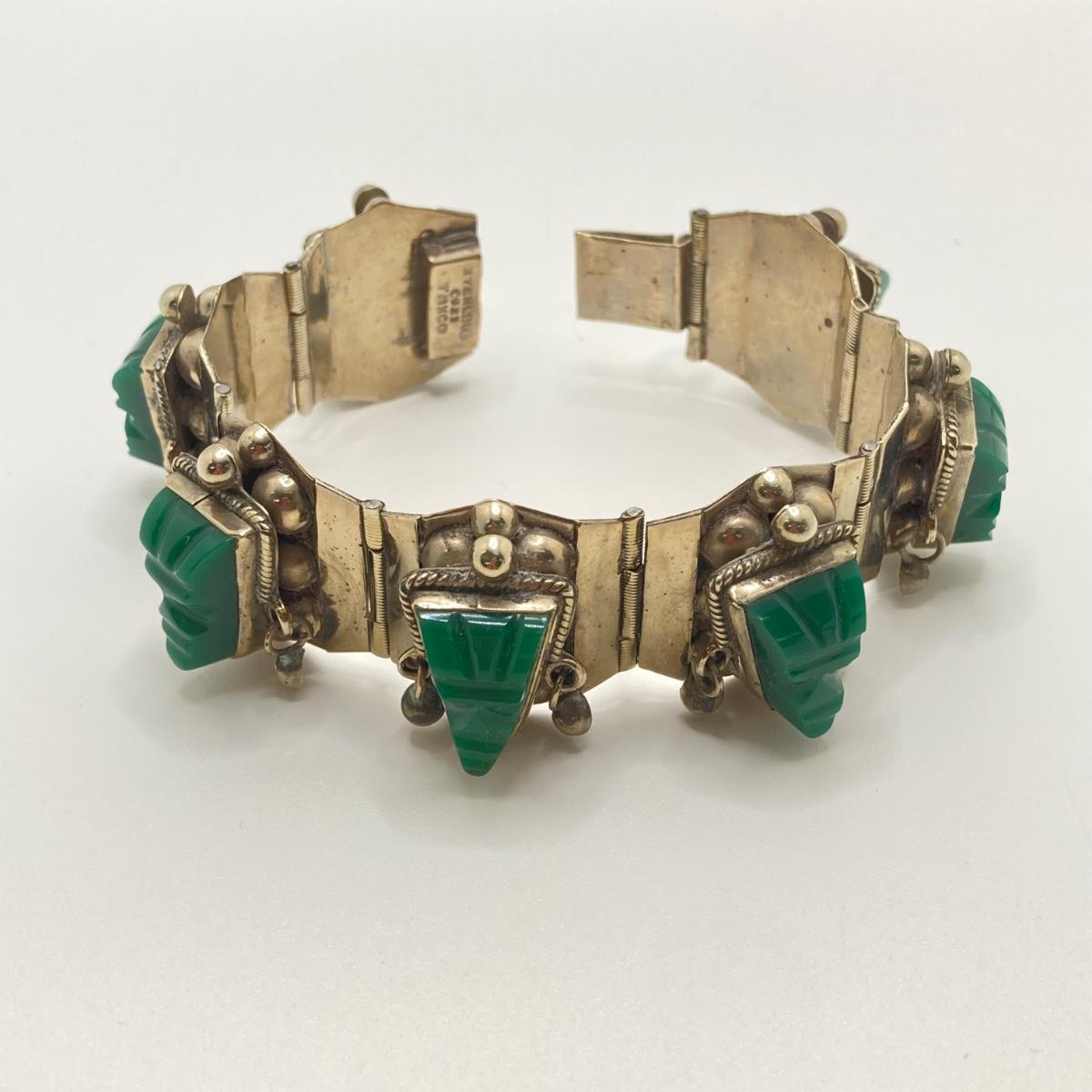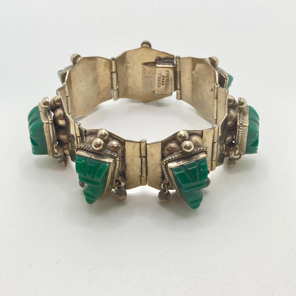 LOT 74: Vintage Sterling Taxco Mexico Carved Green Onyx Mayan Faces Panel Bracelet 6.5" and Screw Back Earrings - 46.0 gtw