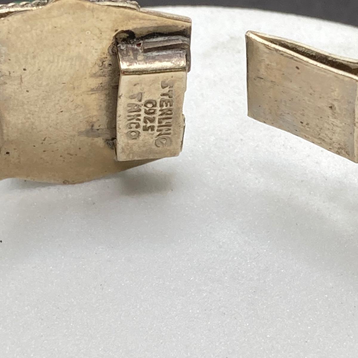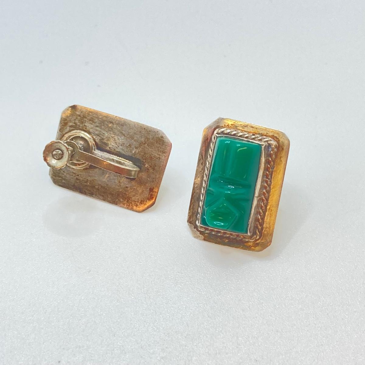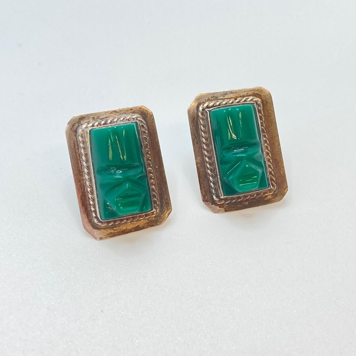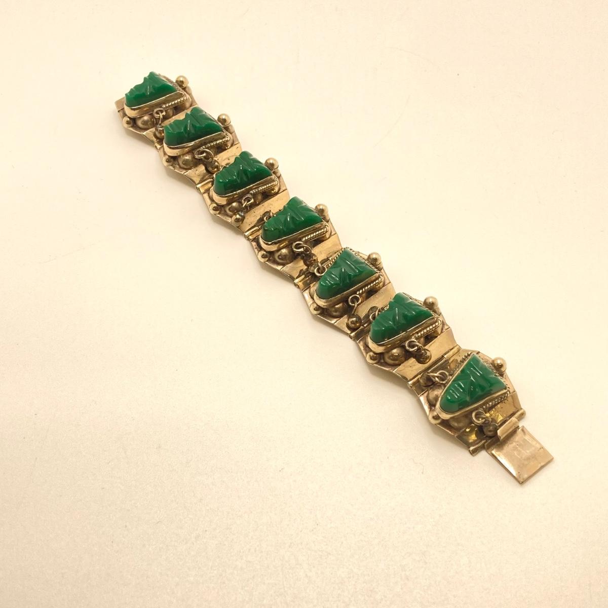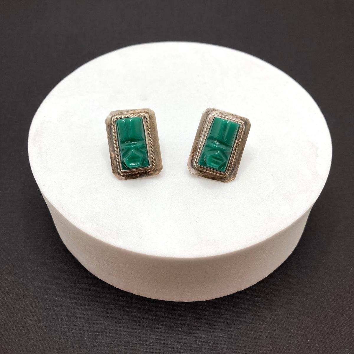 LOT 74: Vintage Sterling Taxco Mexico Carved Green Onyx Mayan Faces Panel Bracelet 6.5" and Screw Back Earrings - 46.0 gtw
