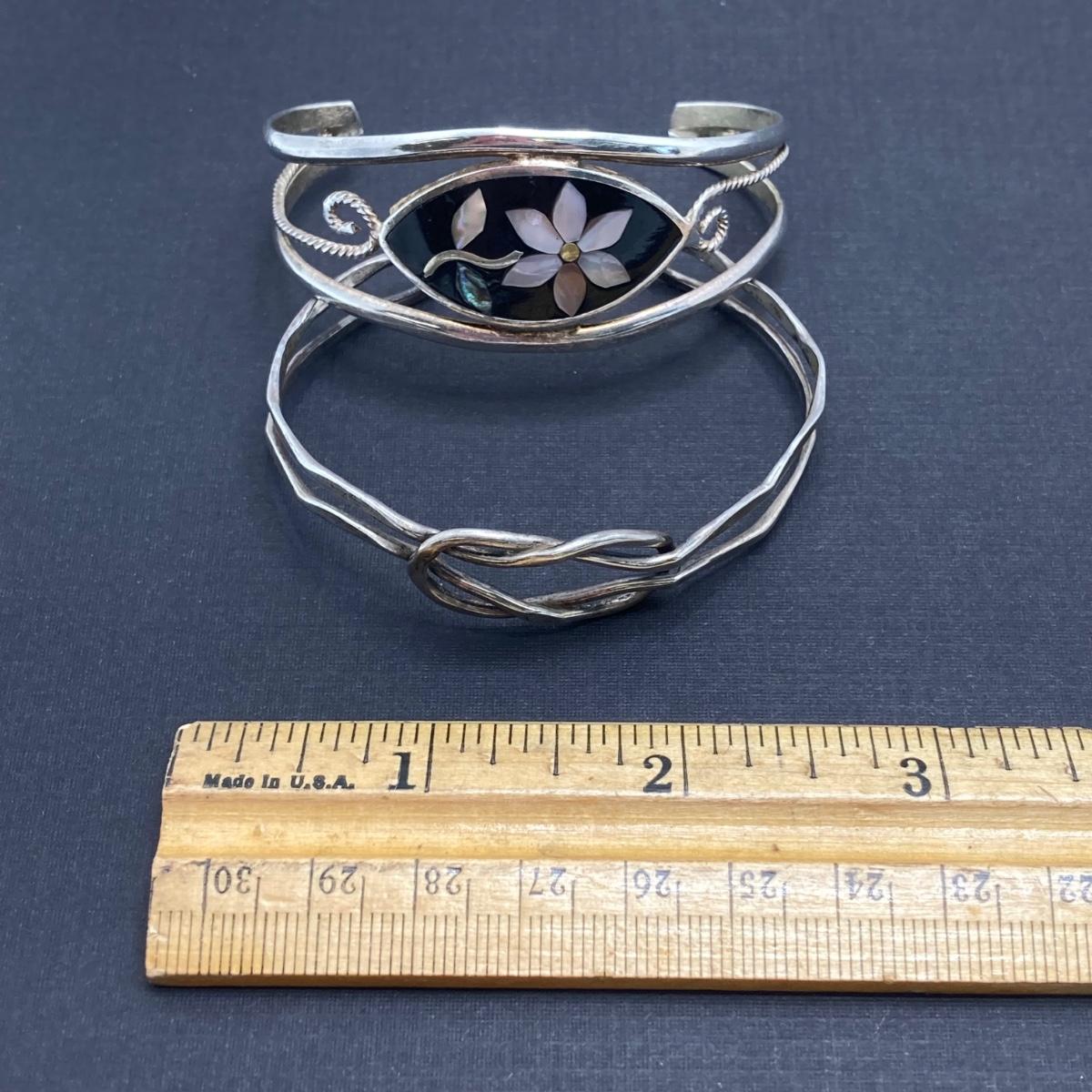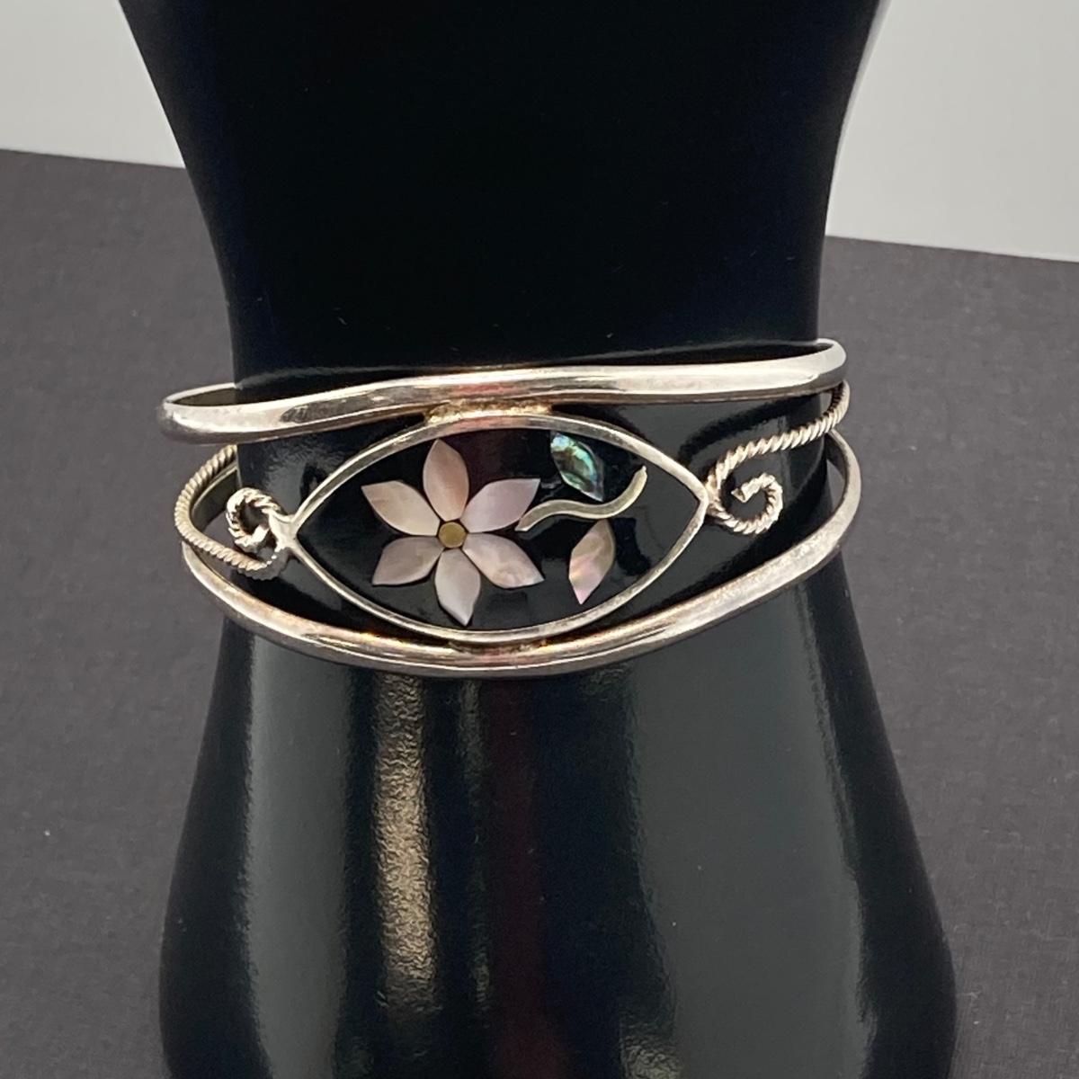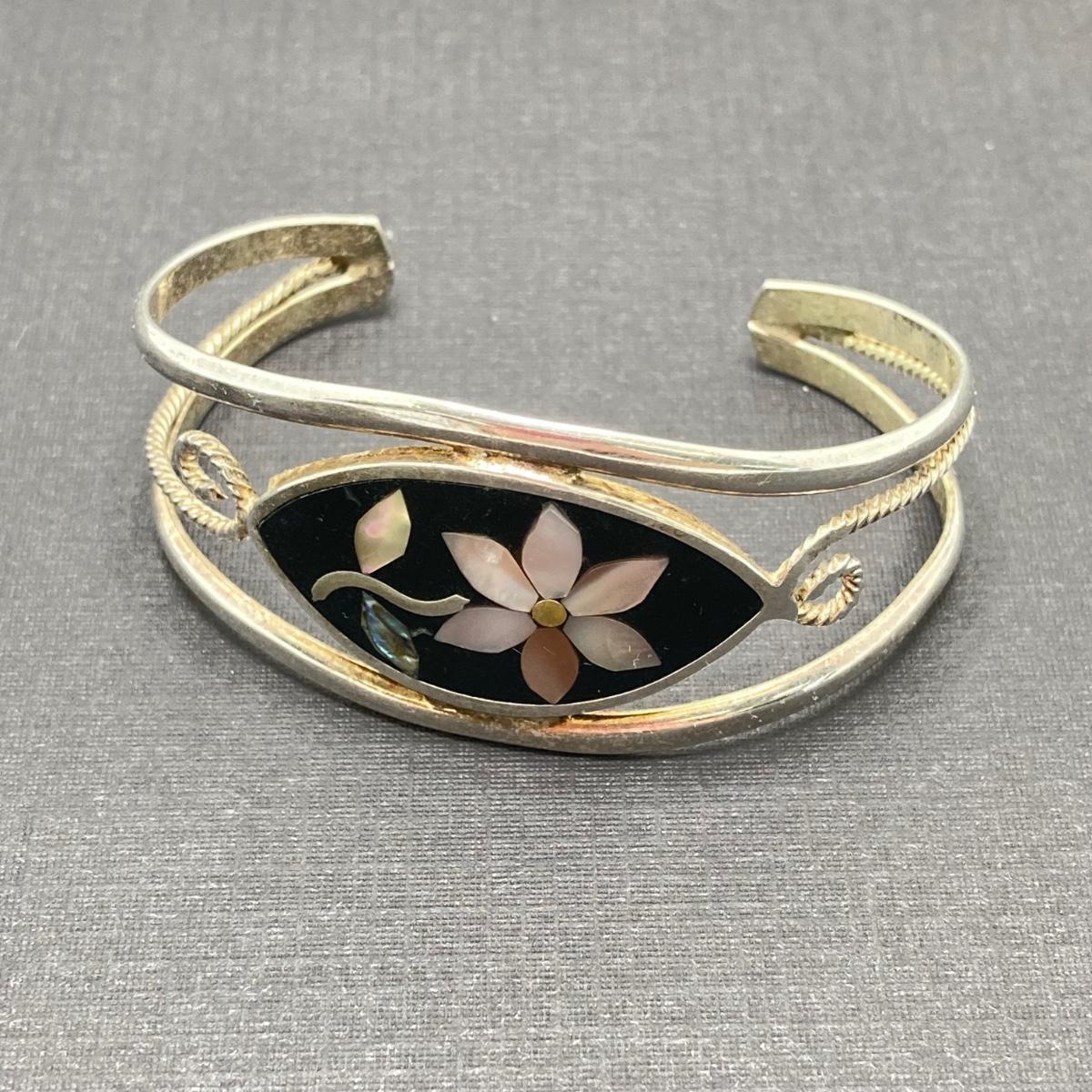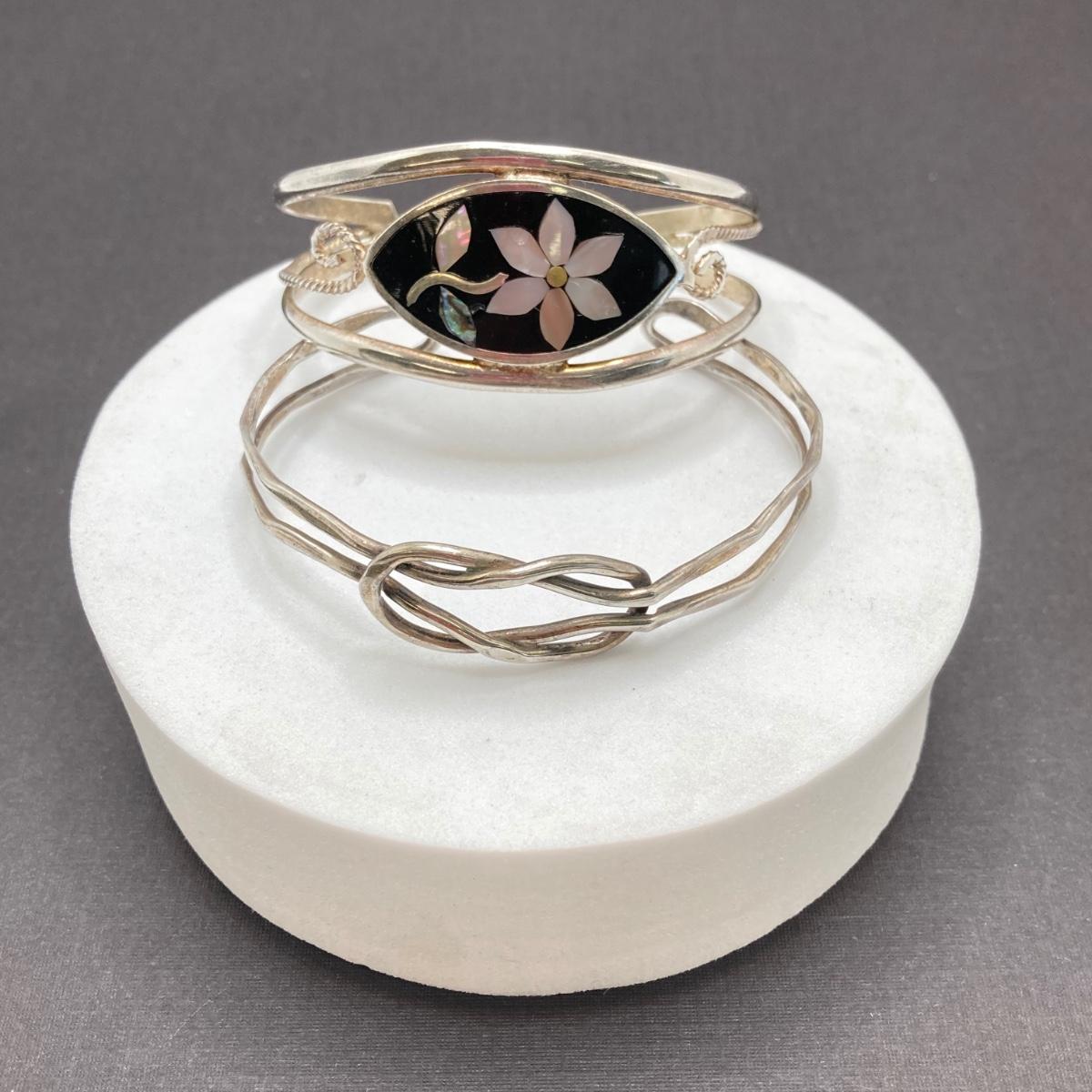 LOT 75: Vintage Cuff Bracelets - Abalone and Mother of Pearl Inlay Flower Mexico and Artisan Love Knot