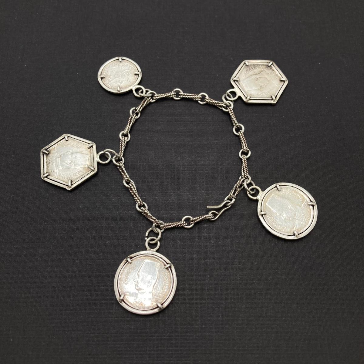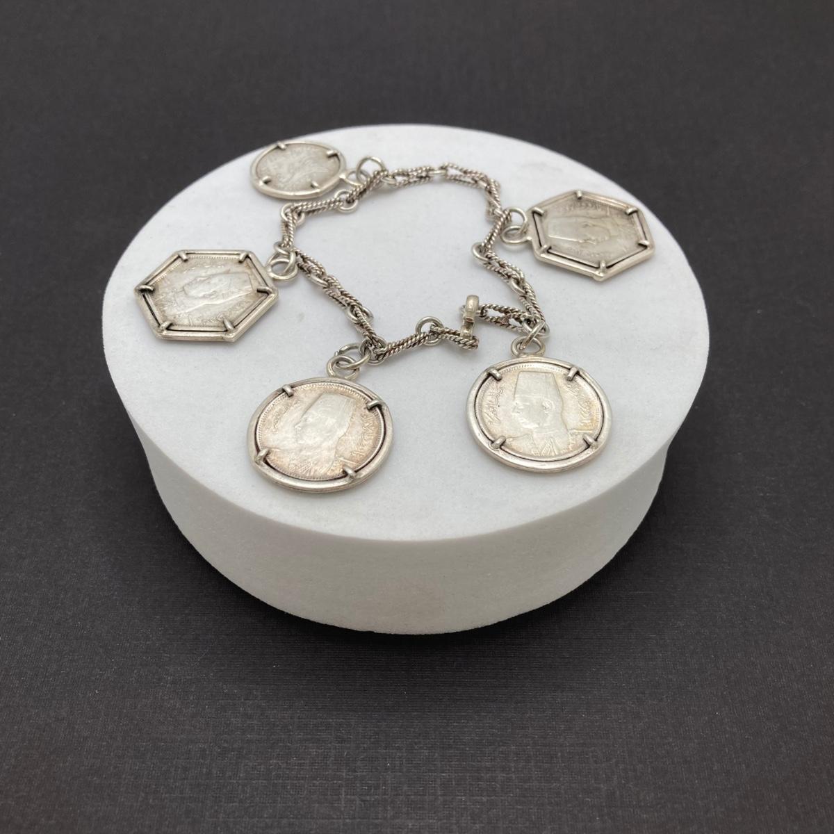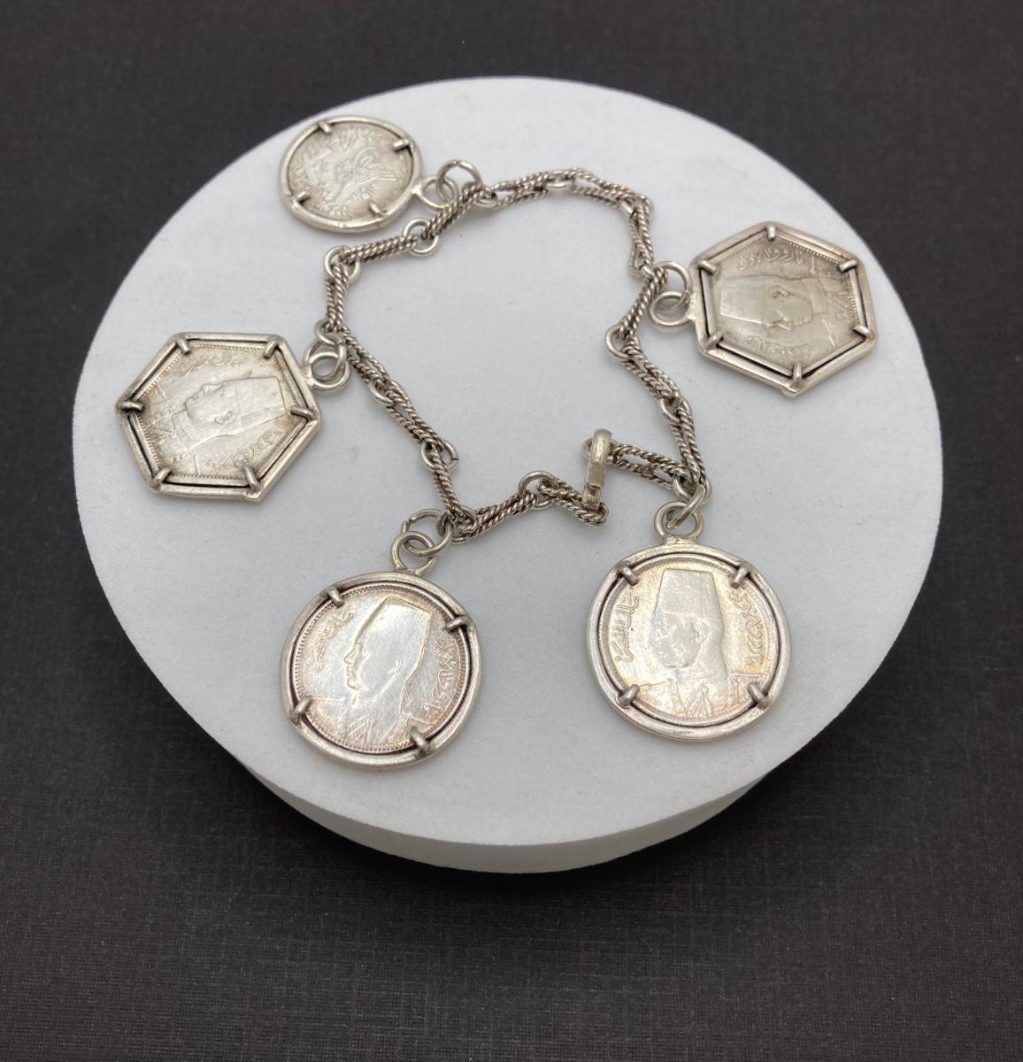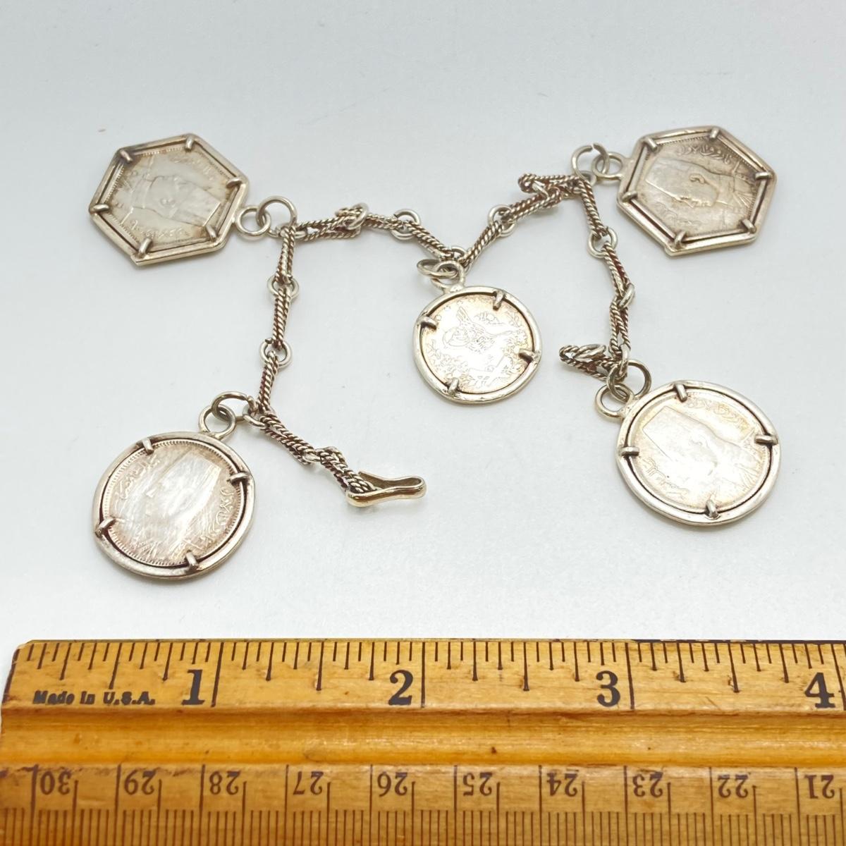 LOT 80: Vintage Silver Charm Bracelet Featuring Egyptian Silver Qirsh Coins, Four King Farouk Bust Coins Circa 1936 - 195 and Center Coin is Antique Lake 1800's - 1900's - 24.0 grams