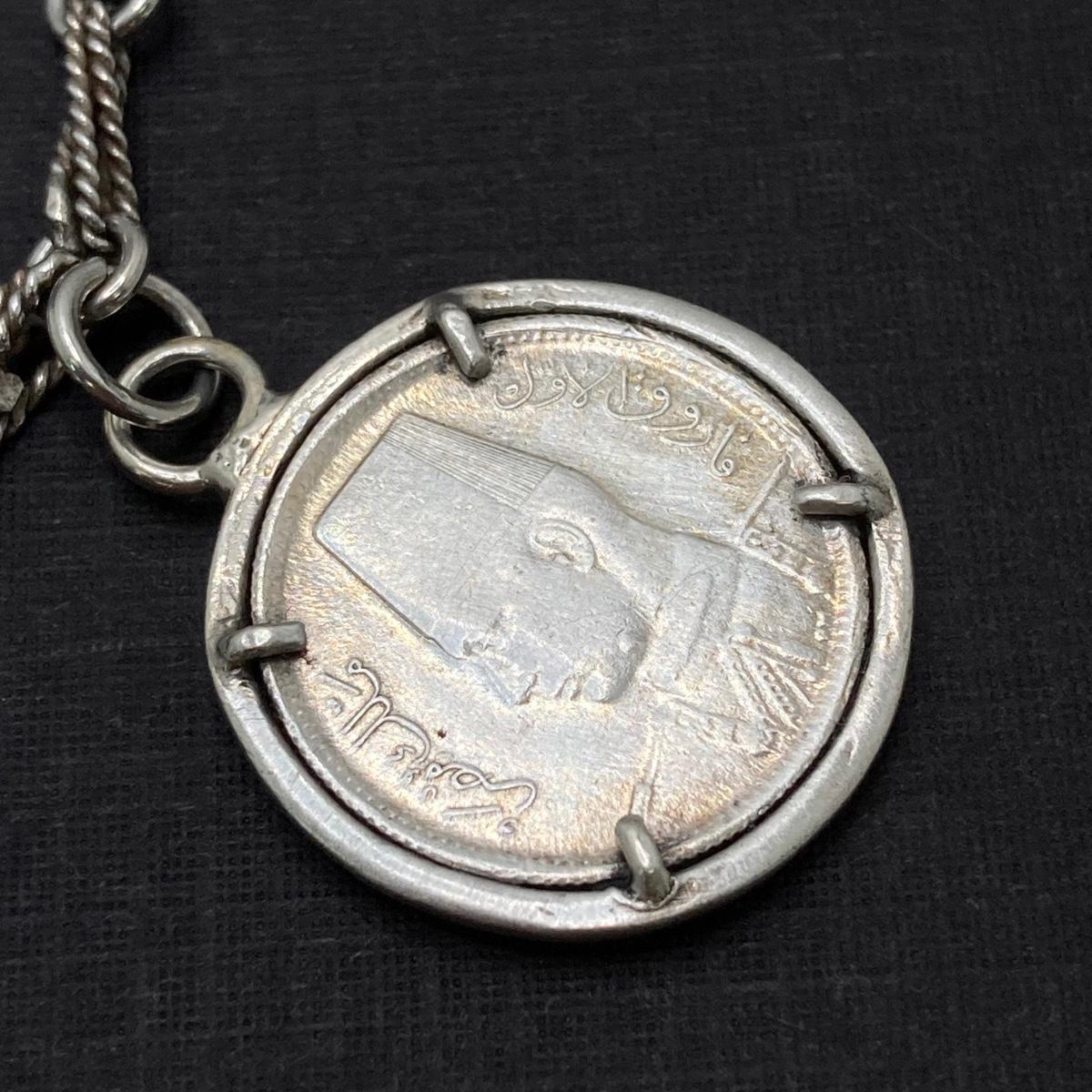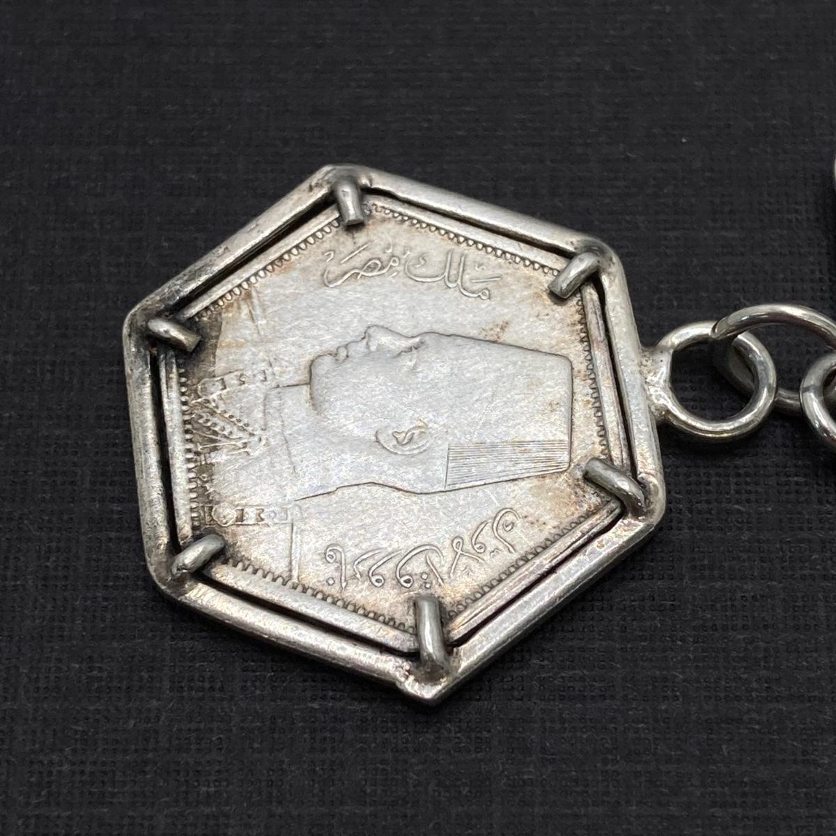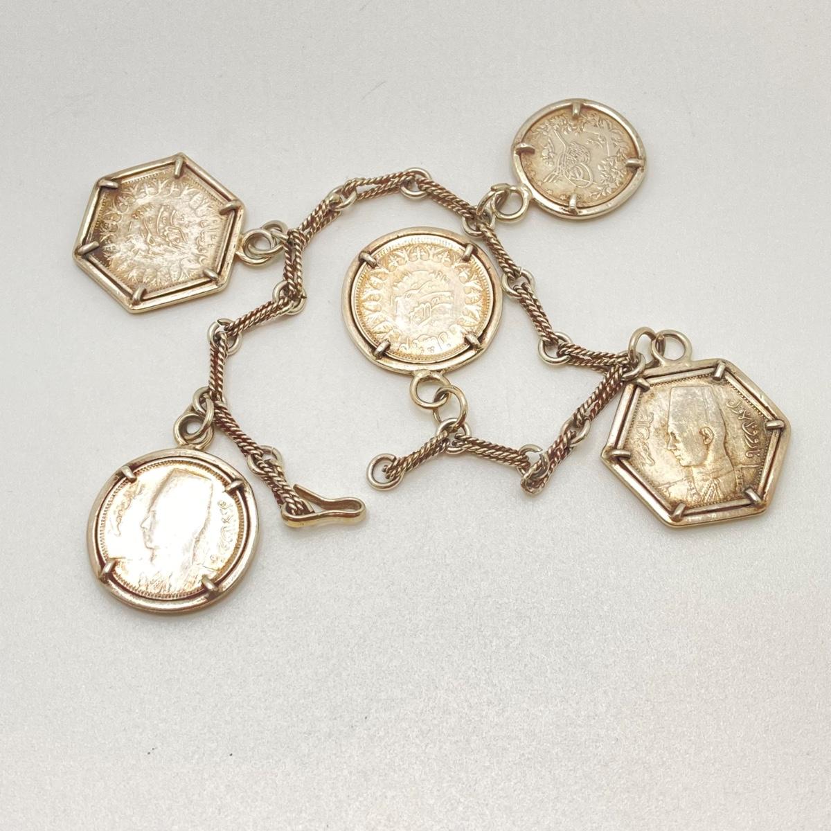 LOT 80: Vintage Silver Charm Bracelet Featuring Egyptian Silver Qirsh Coins, Four King Farouk Bust Coins Circa 1936 - 195 and Center Coin is Antique Lake 1800's - 1900's - 24.0 grams