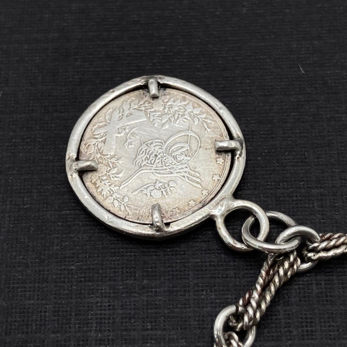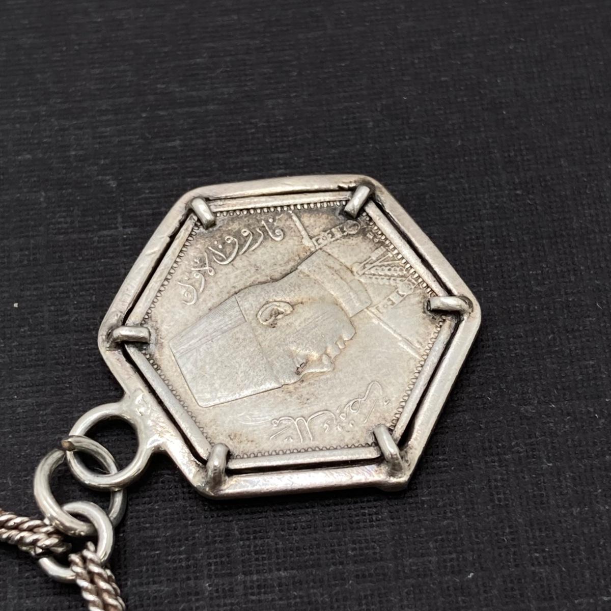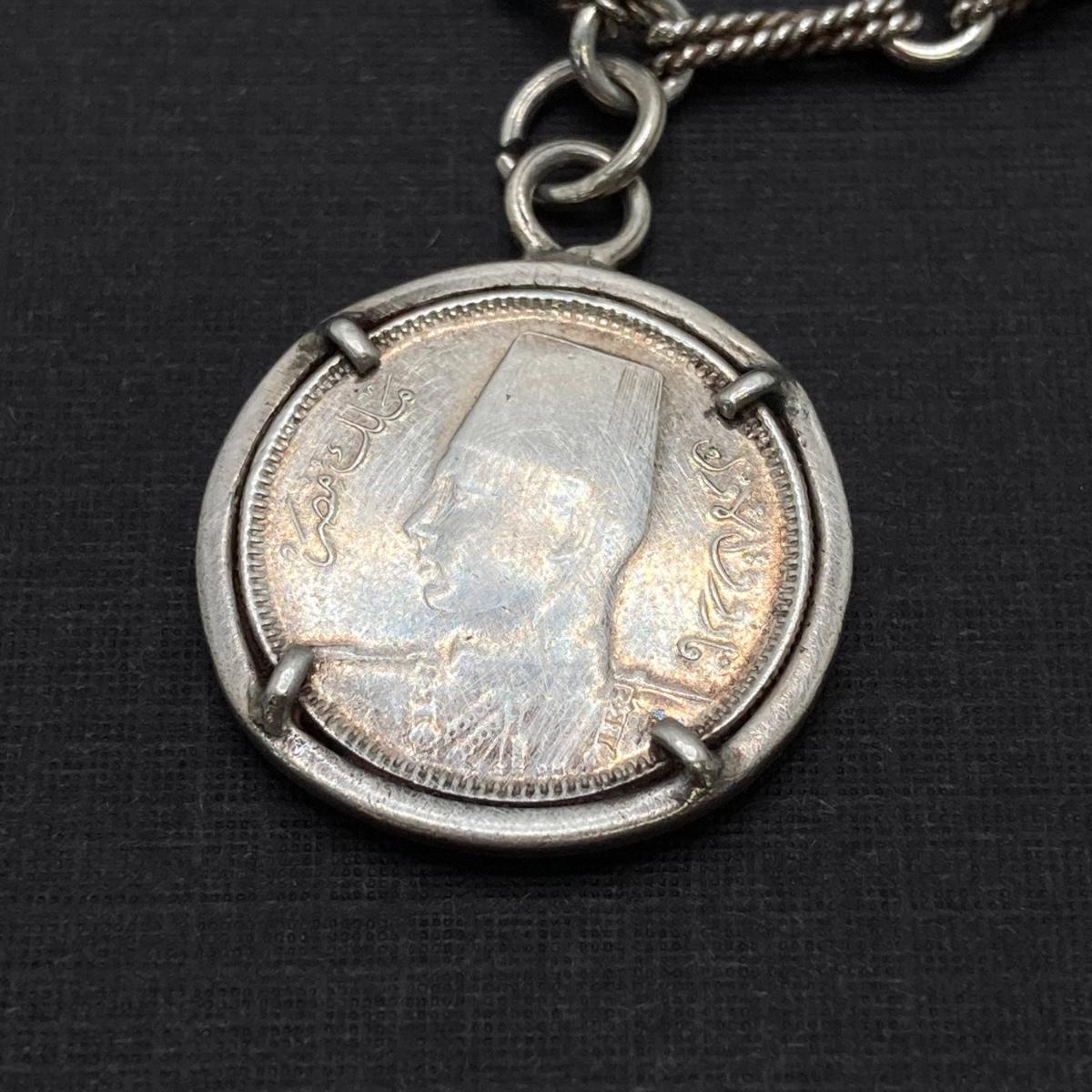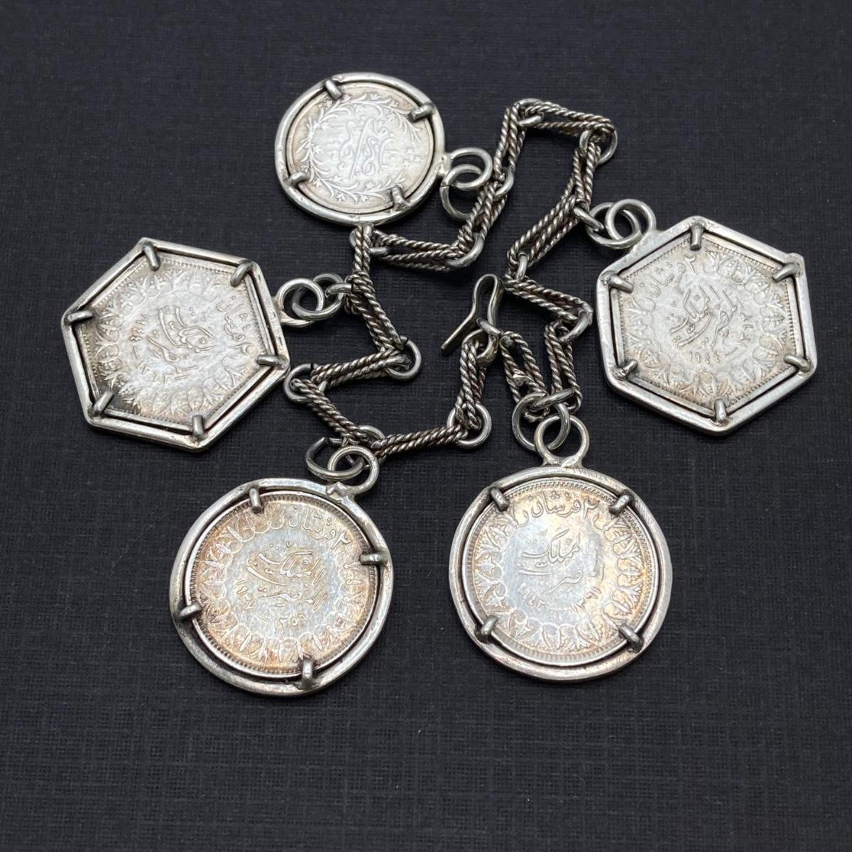 LOT 80: Vintage Silver Charm Bracelet Featuring Egyptian Silver Qirsh Coins, Four King Farouk Bust Coins Circa 1936 - 195 and Center Coin is Antique Lake 1800's - 1900's - 24.0 grams