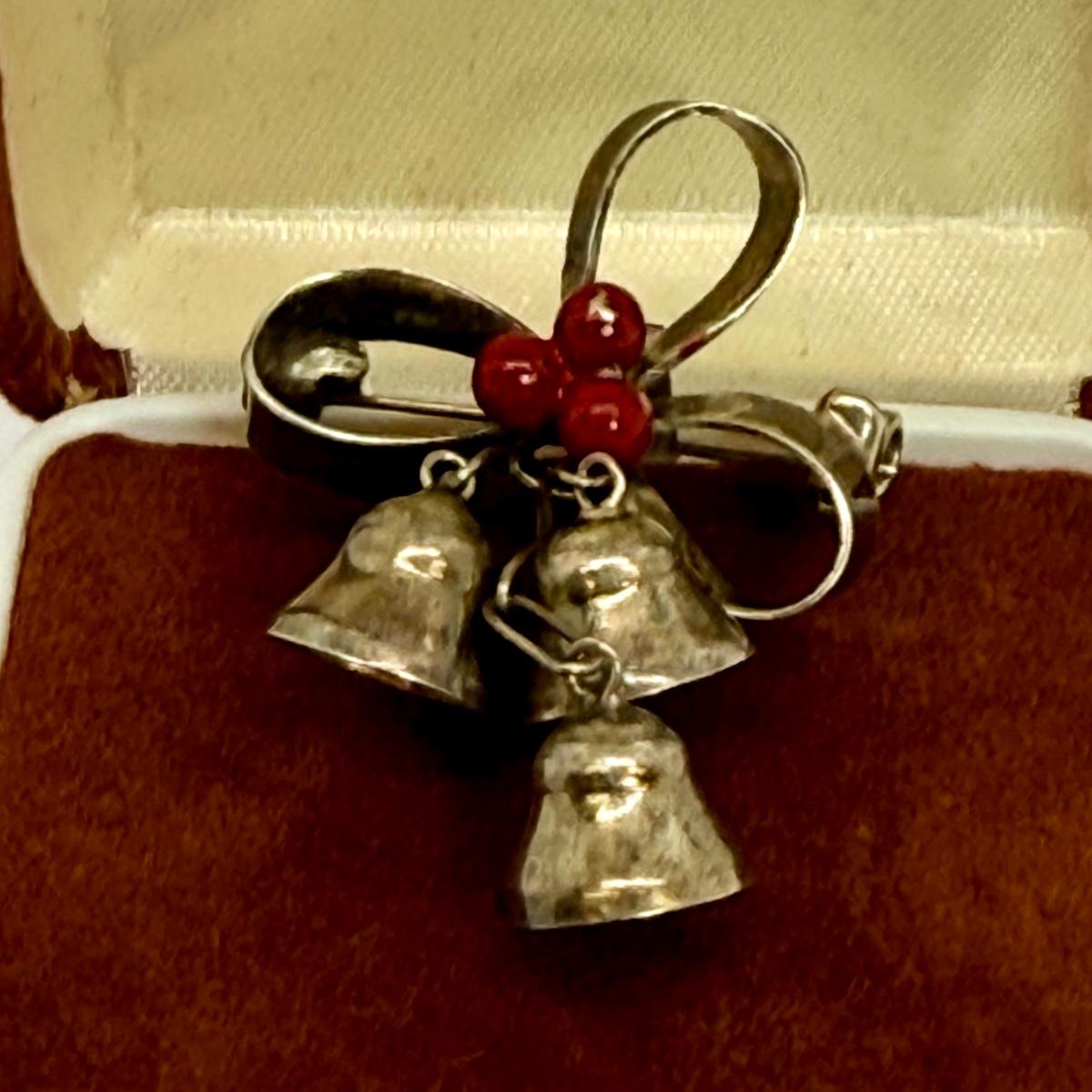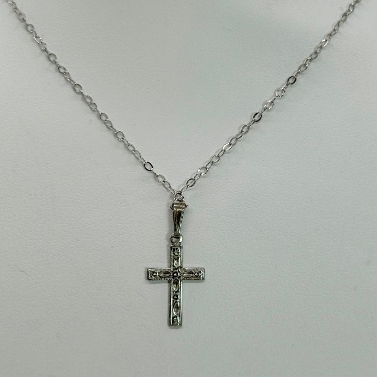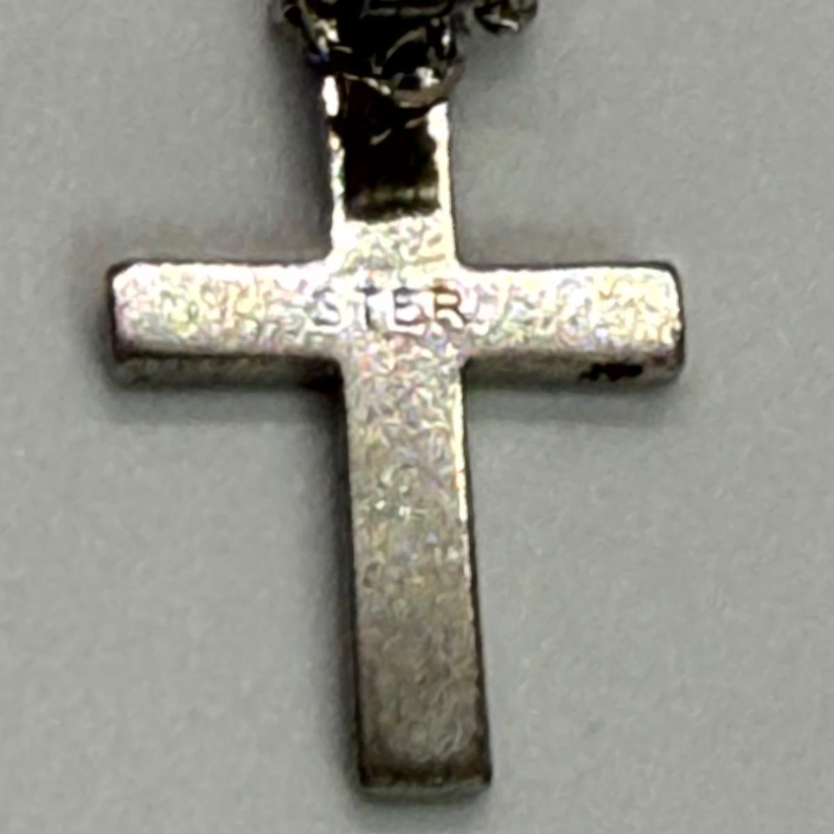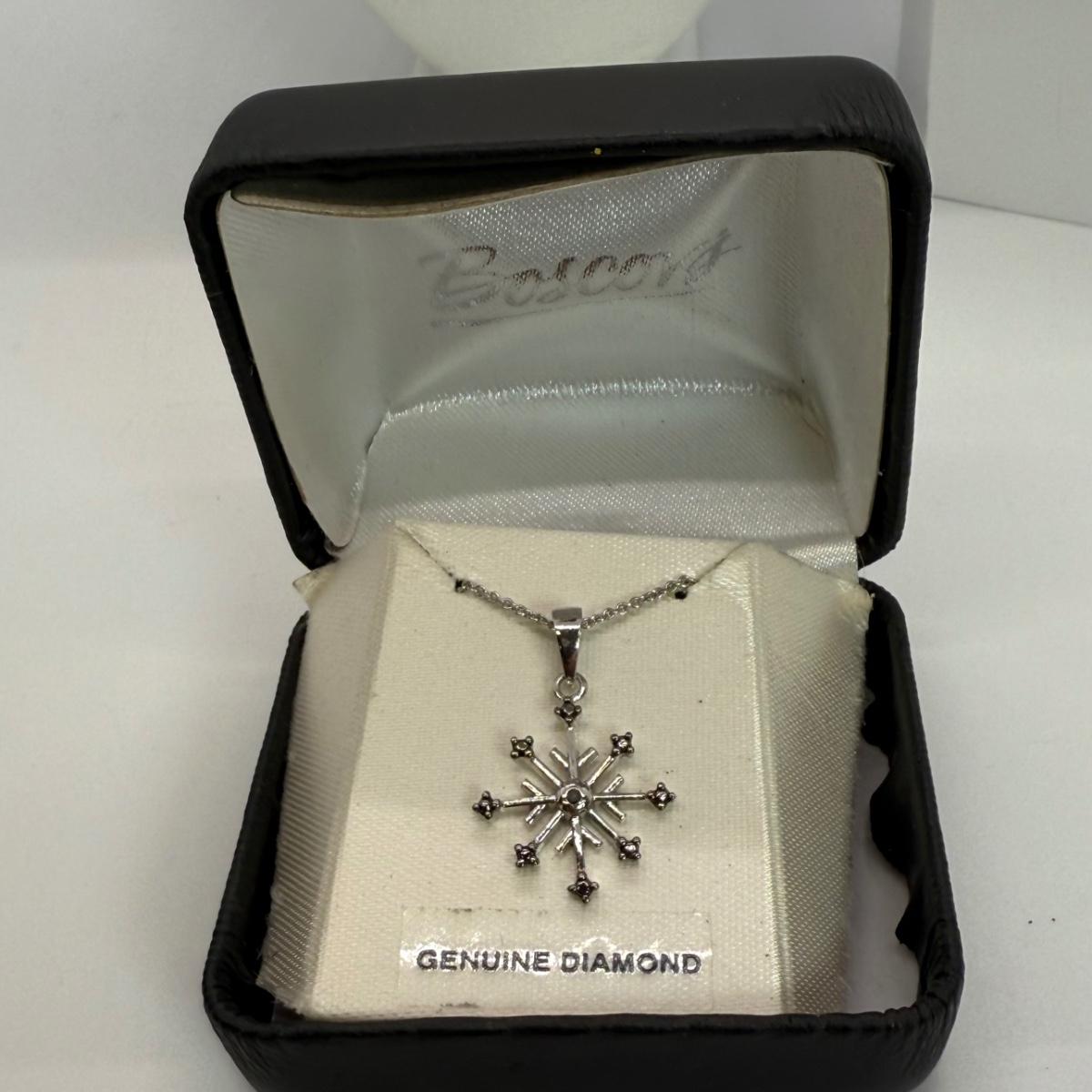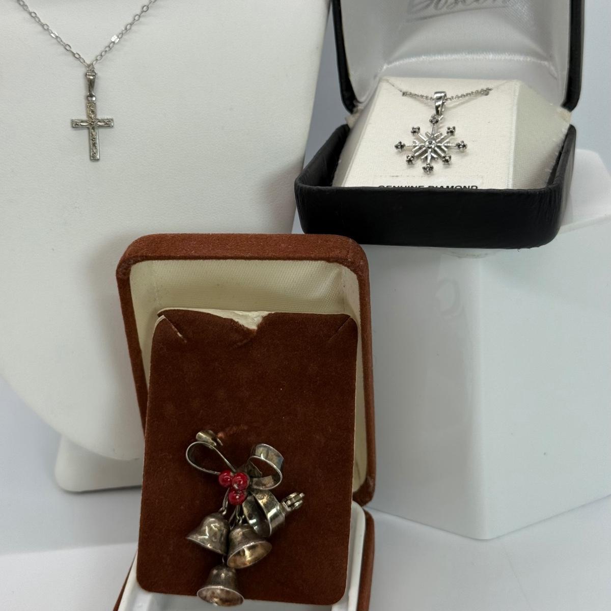 LOT 113 Sterling Cross & 15 1/2” Necklace 1.4g, Diamond Snowflake 925 Sterling 18” Necklace and Sterling Bell Pin 4.6 gtw