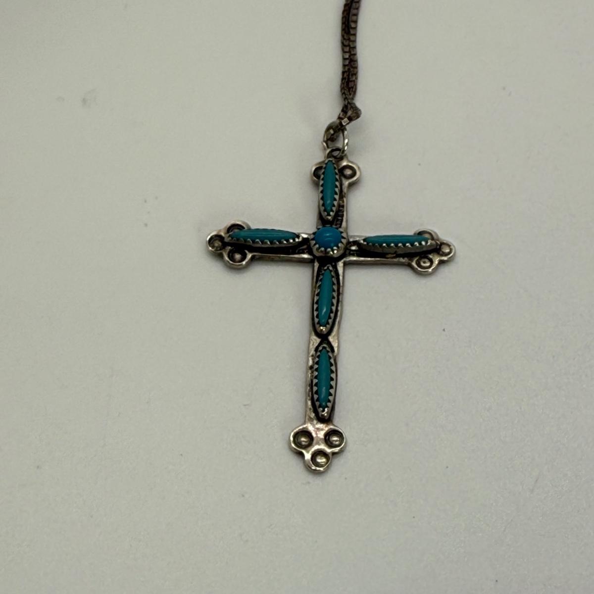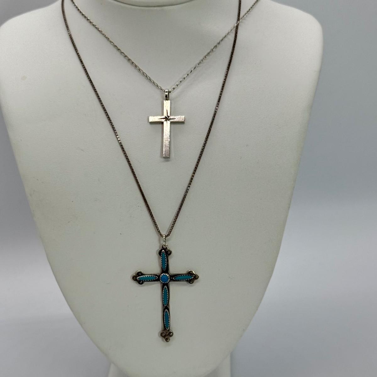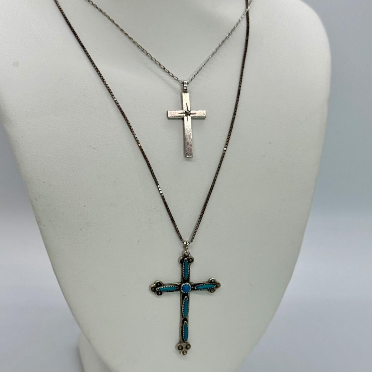 LOT 117: 925 Fine 20” Chain with Cross Pendant 2.4g and 925 Fine Box 24” Chain with Turquoise Cross 4.3 gtw