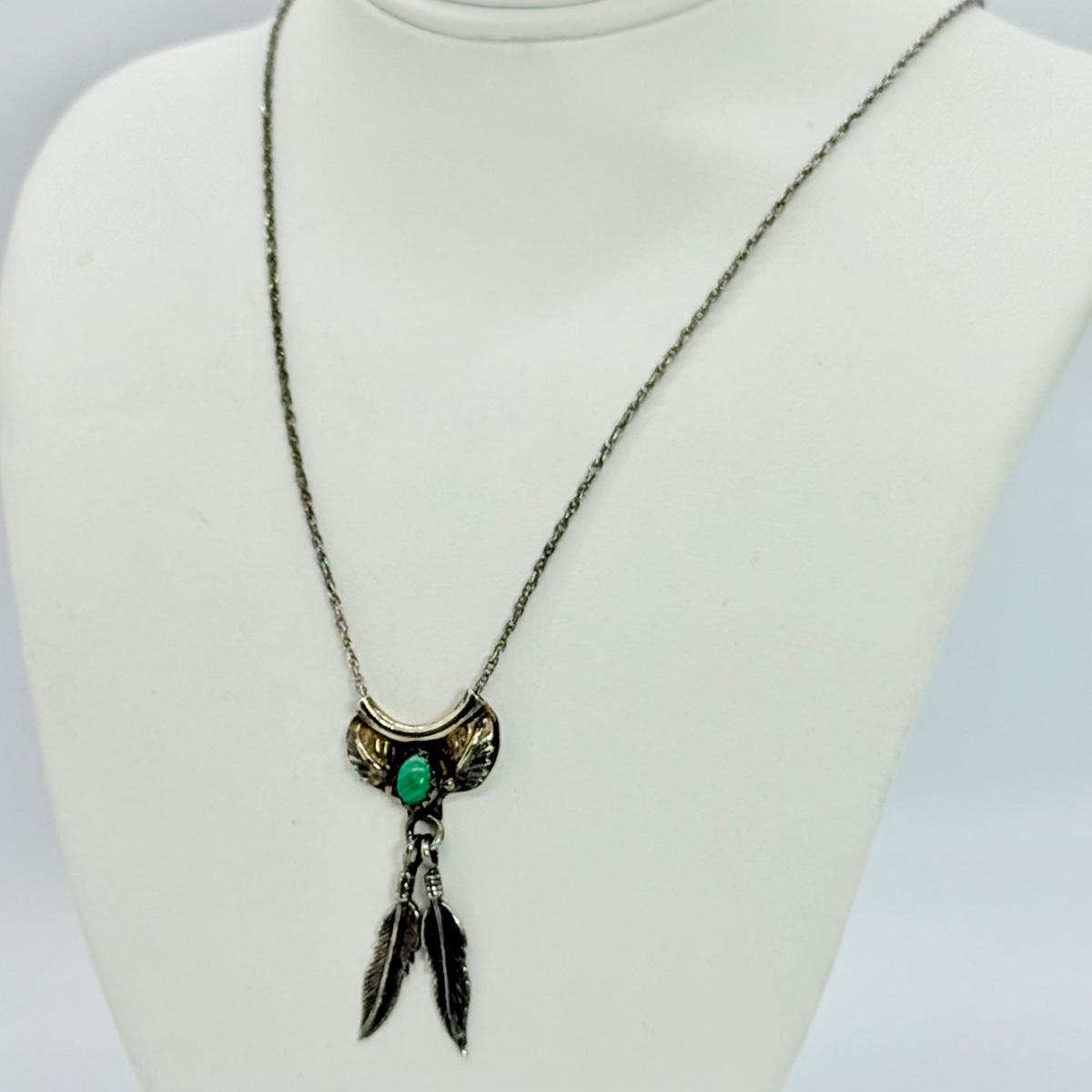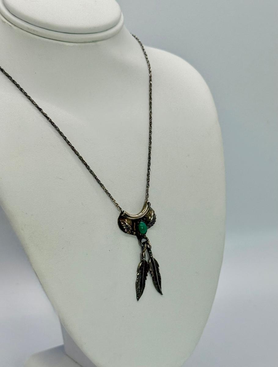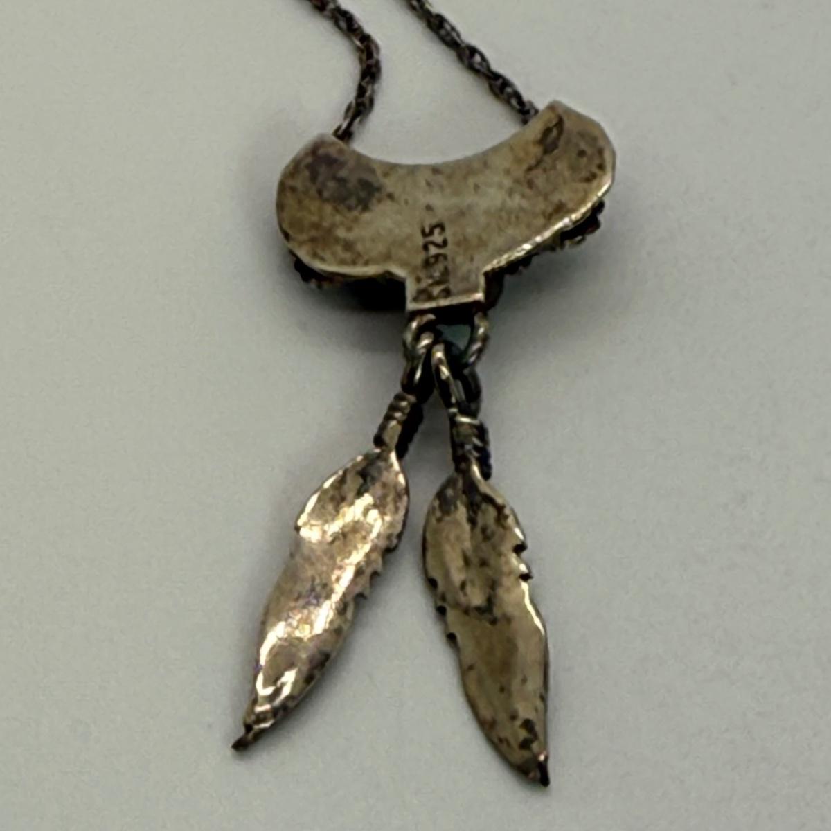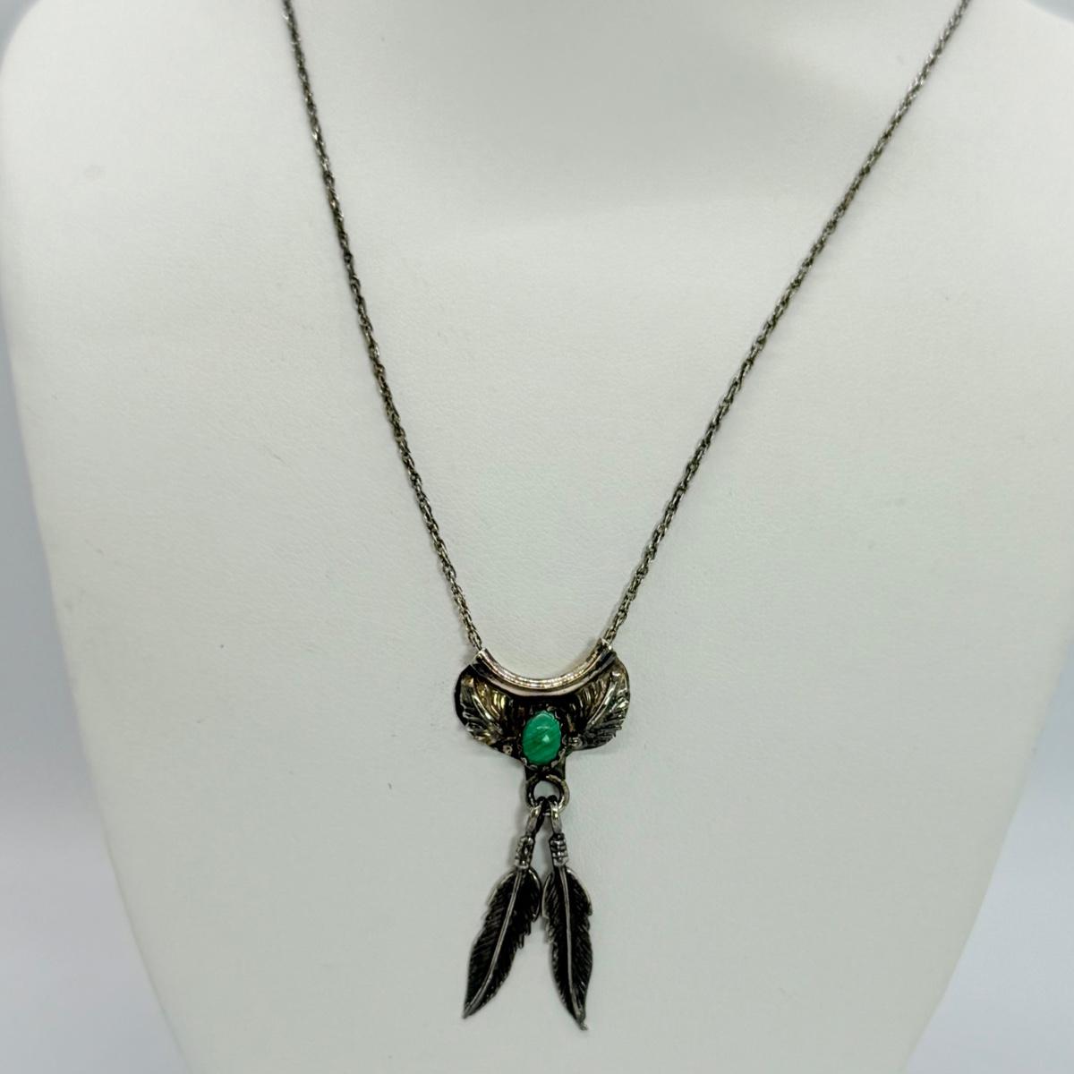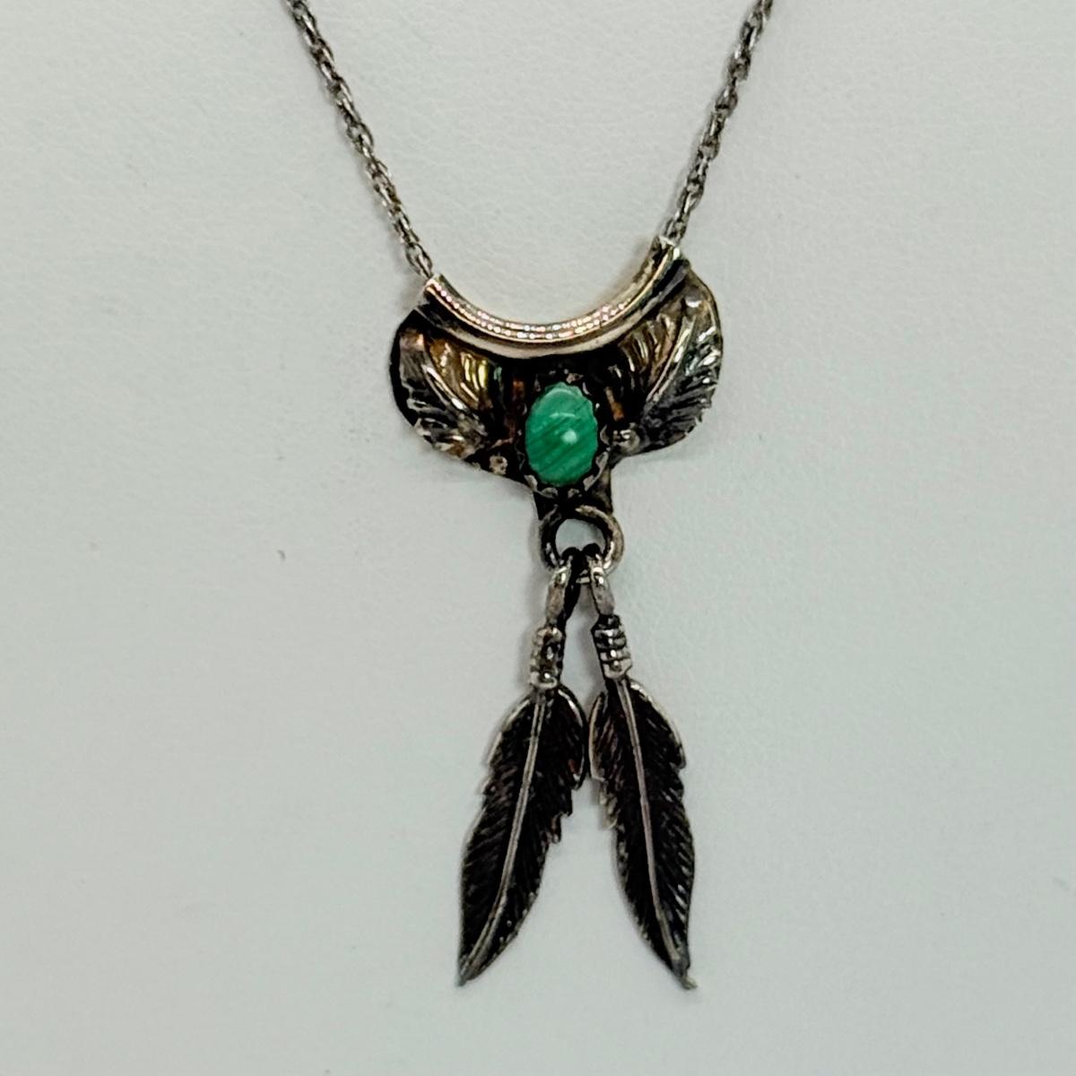LOT 118: 18” Fine 925 Chain w/ Native American Inspired Feather Motif Pendant with Malachite Stone 4.1gtw
