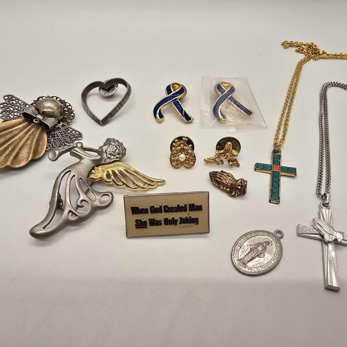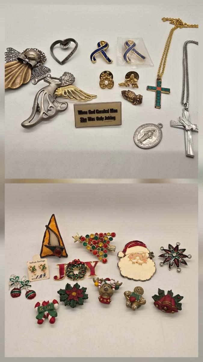 LOT 154jewelry: Religious Pendants, Pins and Holiday Themed Pins, Button Covers