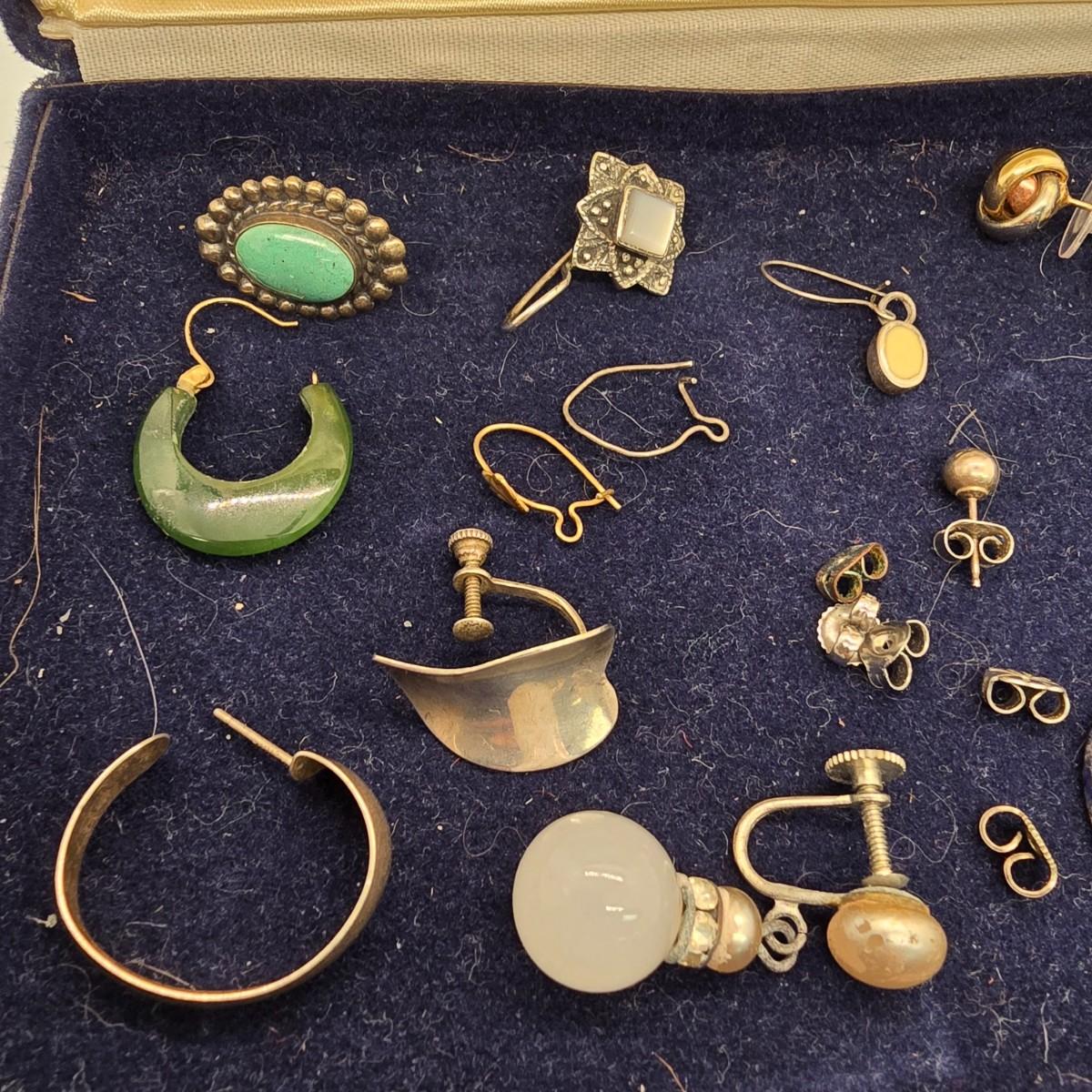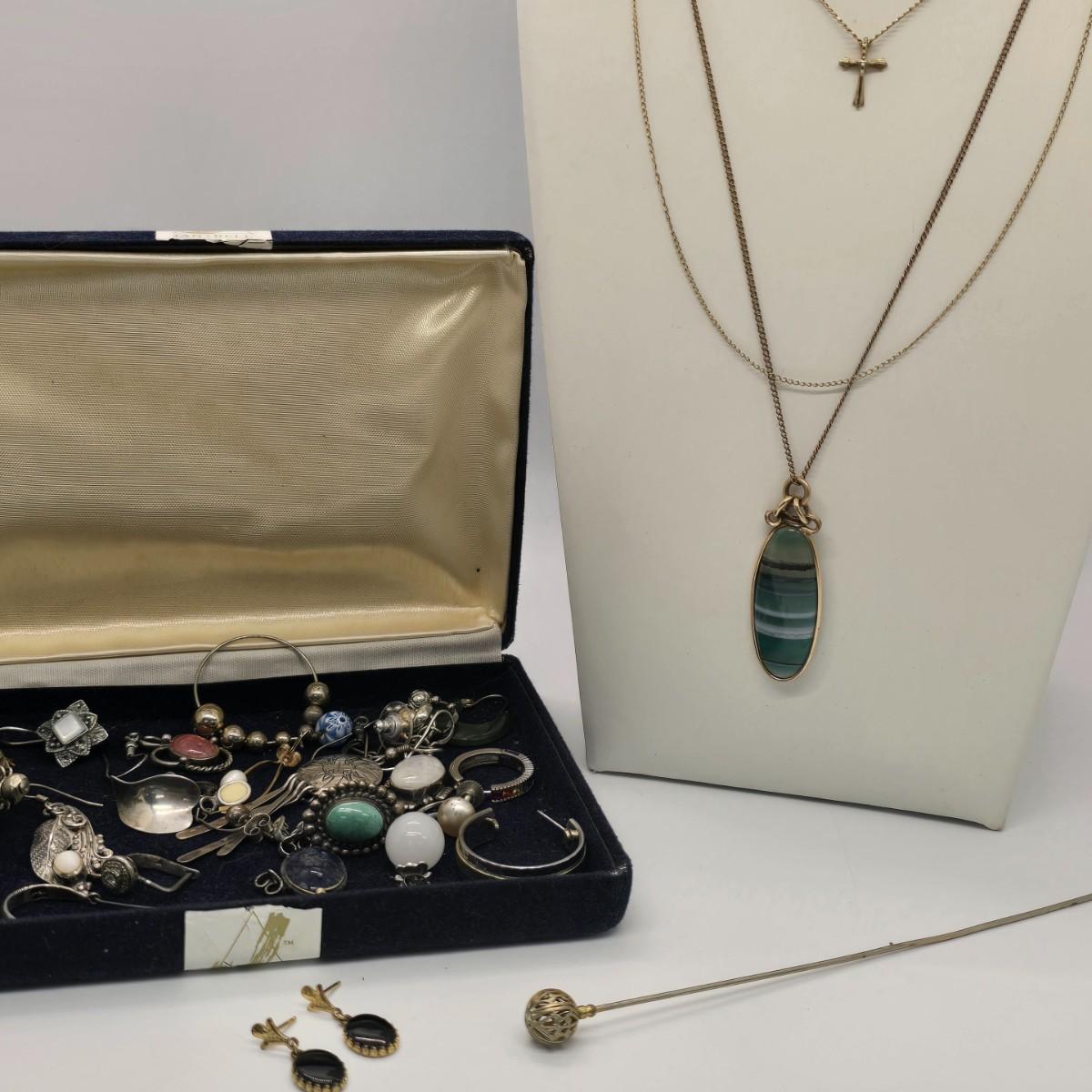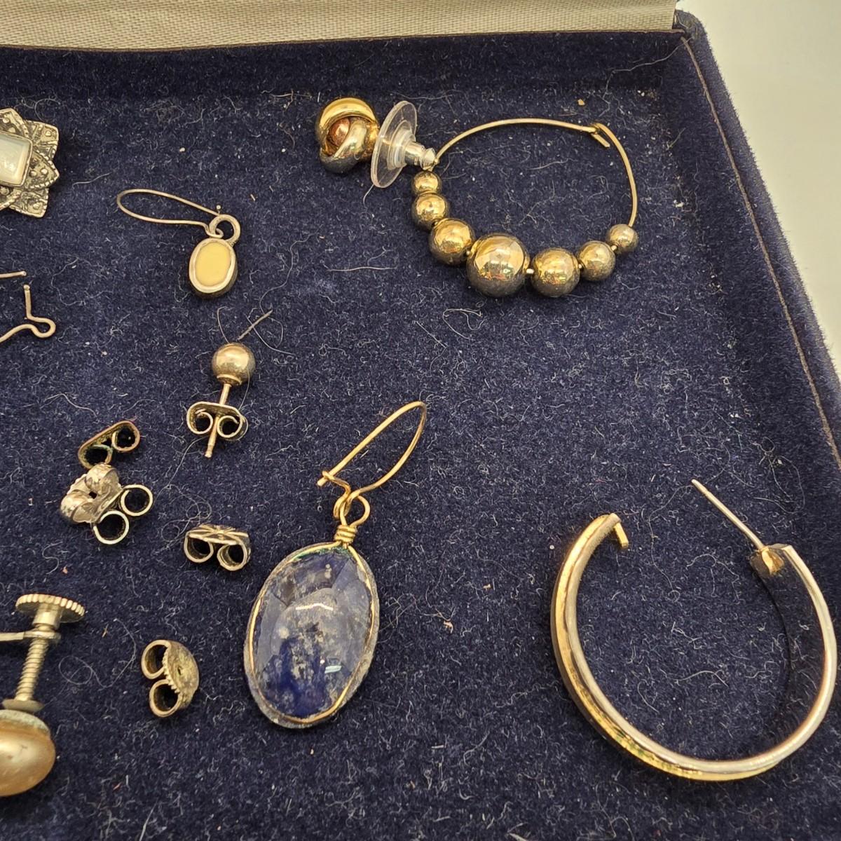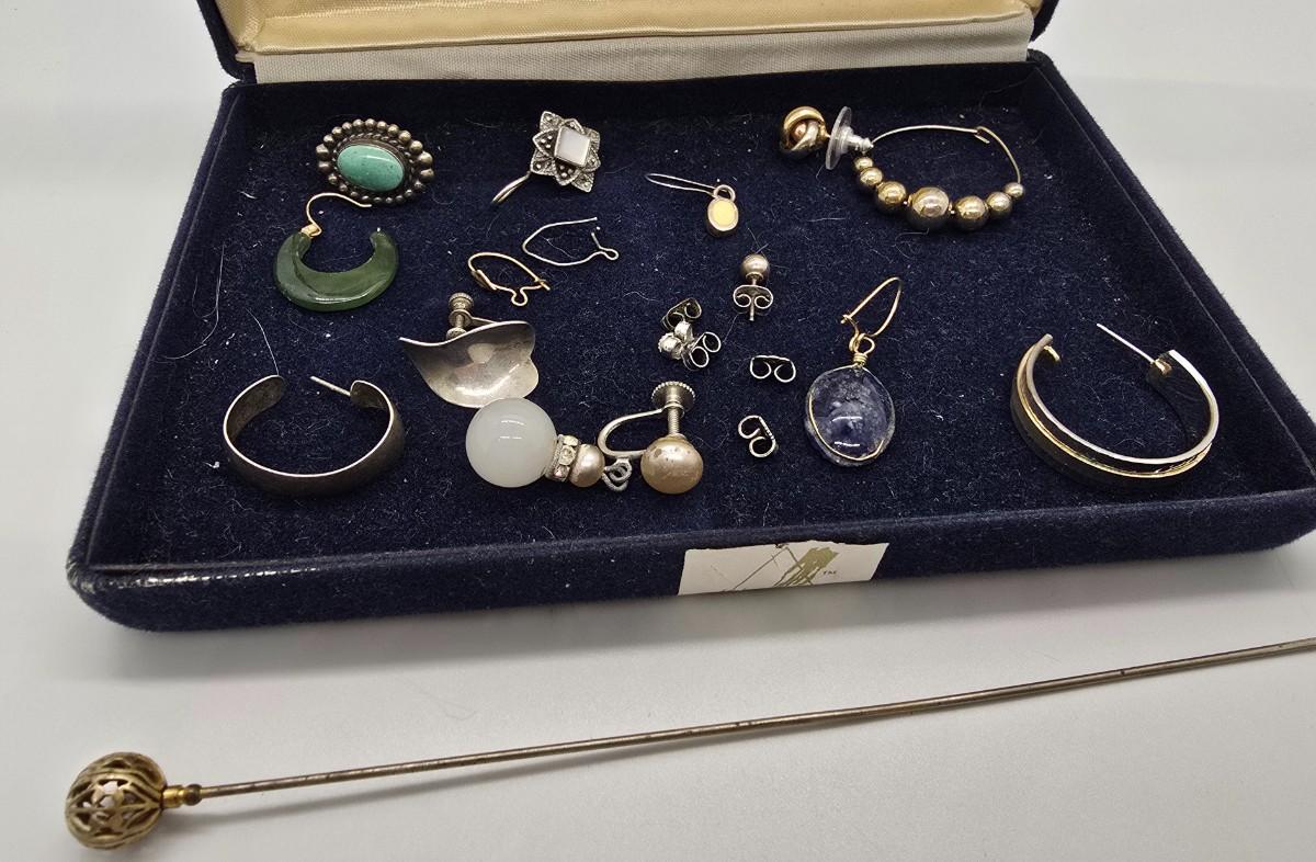 LOT 161jewelry: Gold Filled Cross and Stone Pendants with Odd Lot of Single Earrings, Hat Pin, and Earring Backs