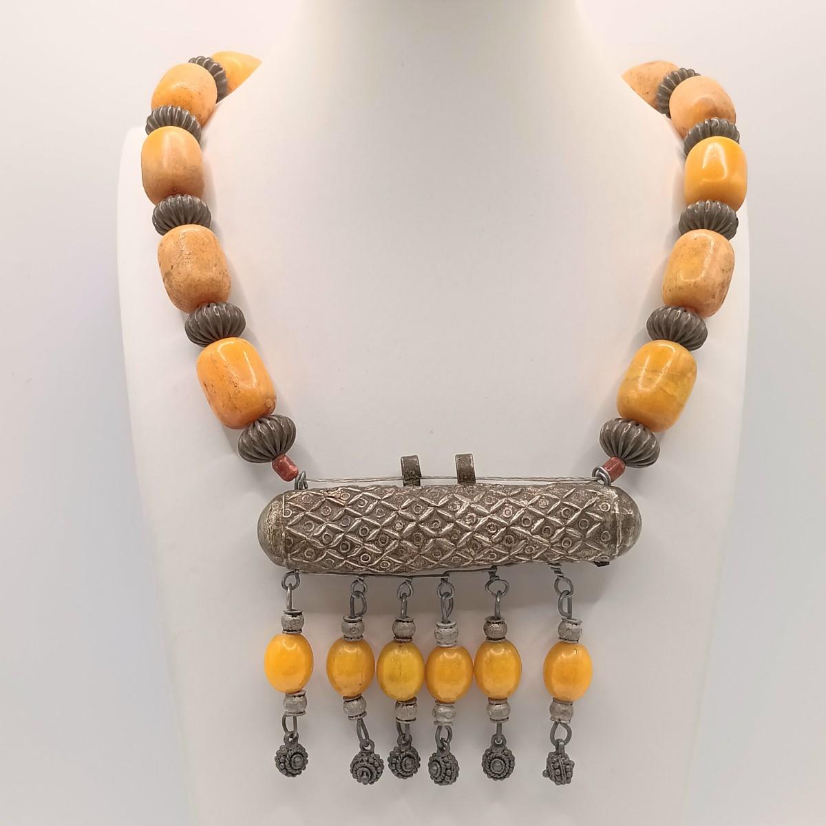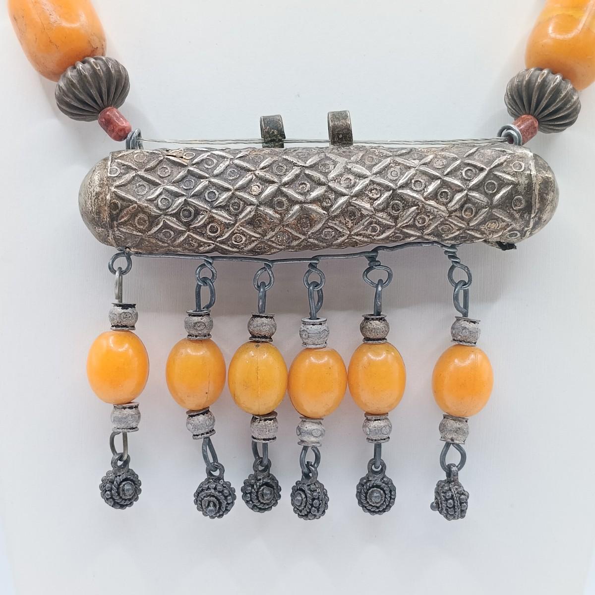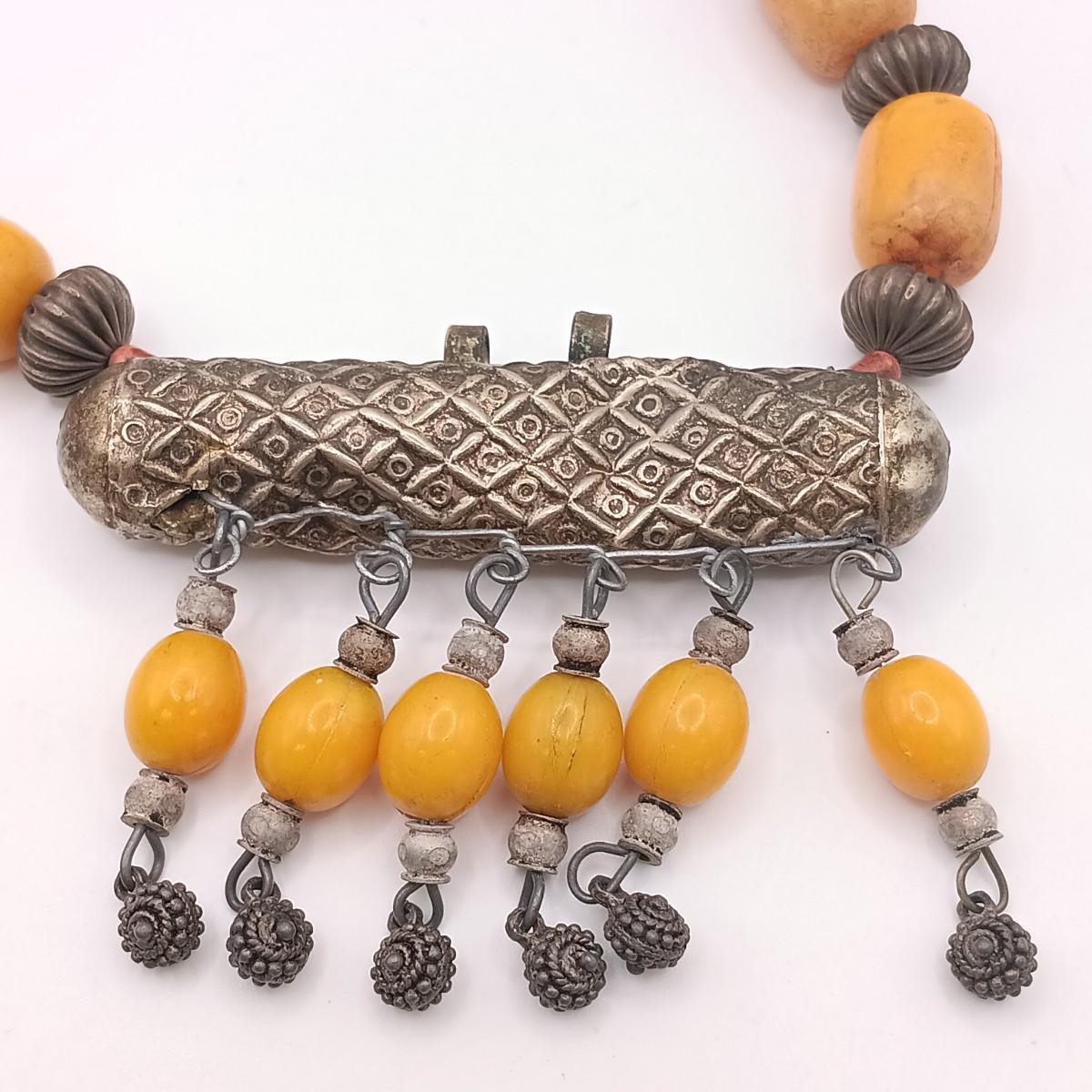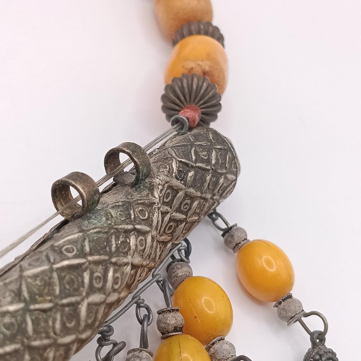 The large silver-tone pendant on the Yemeni necklace is dented on one side.