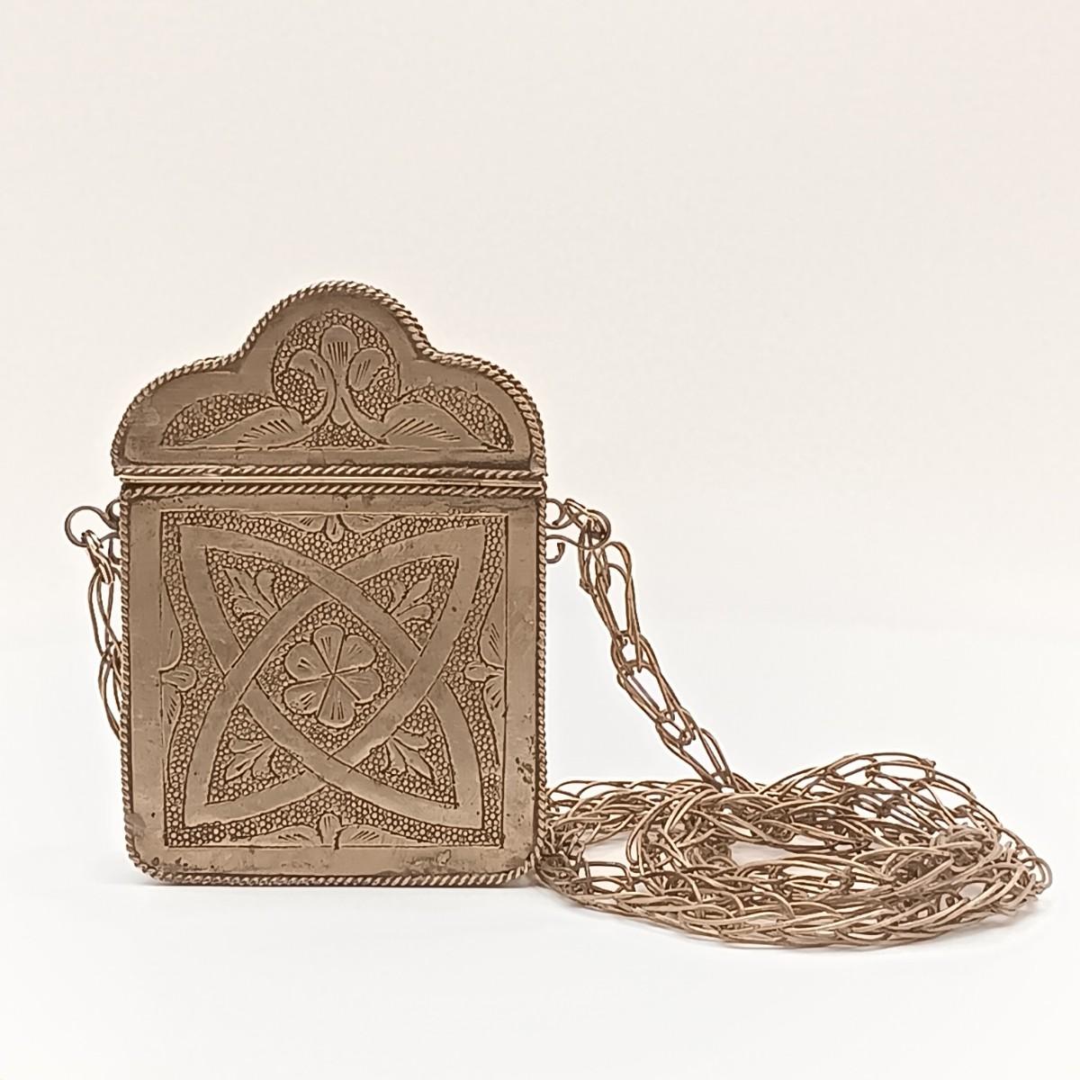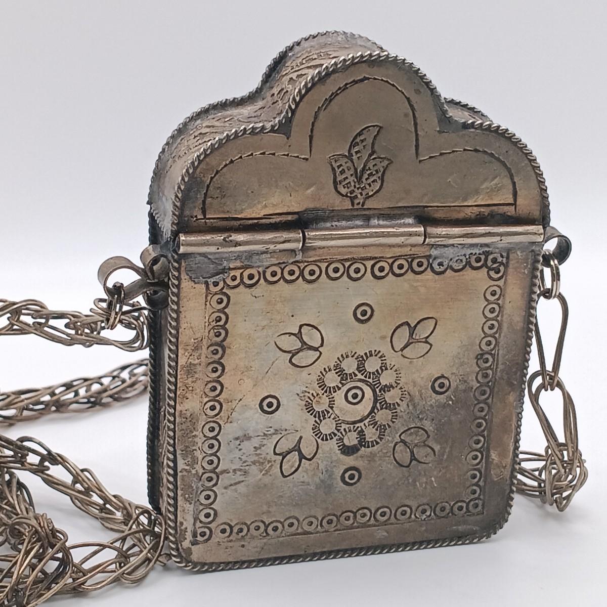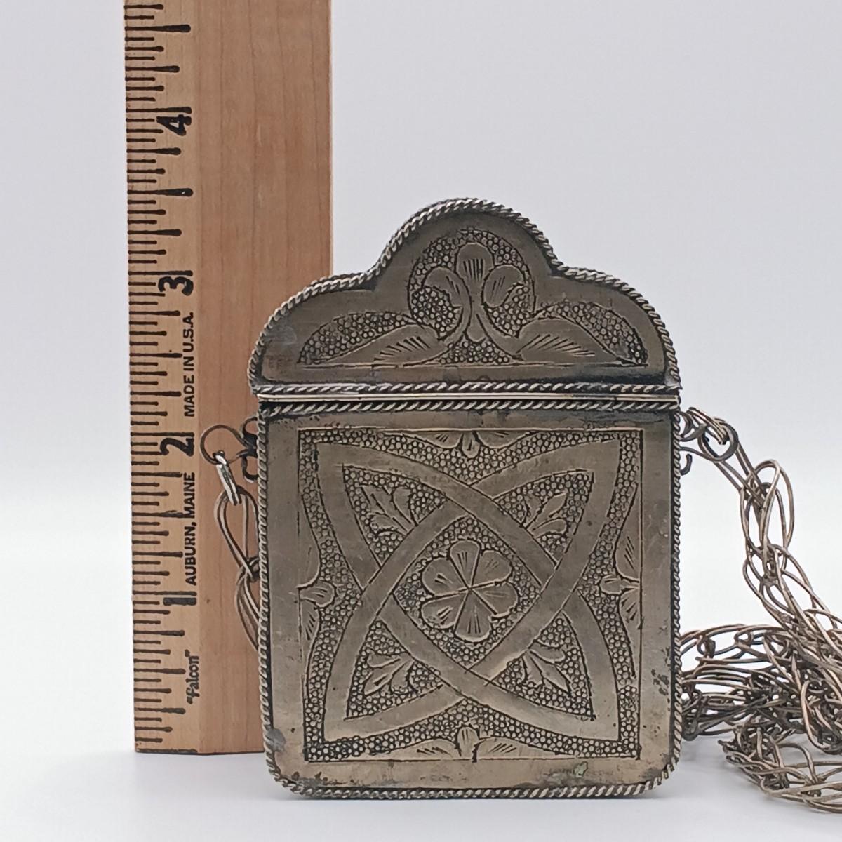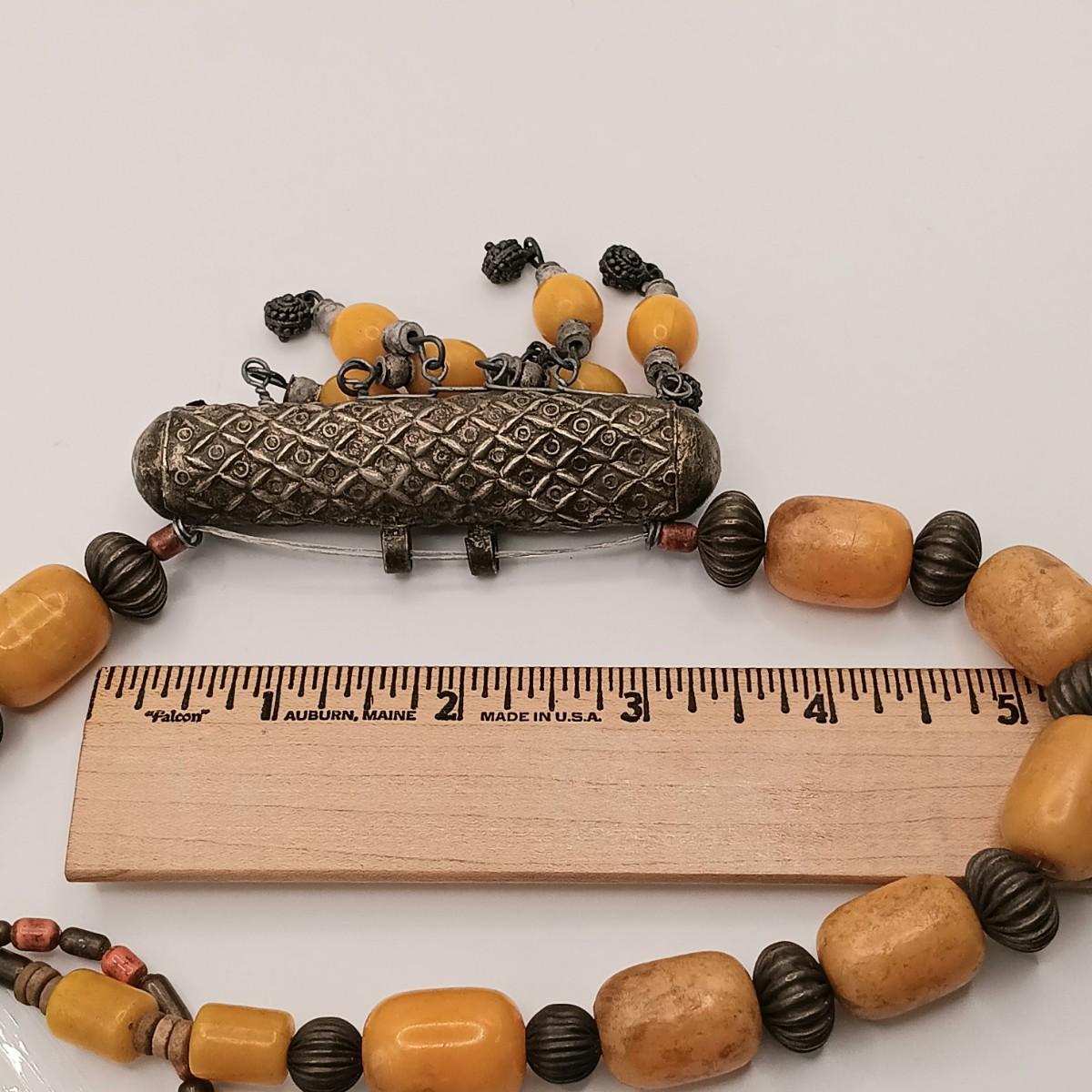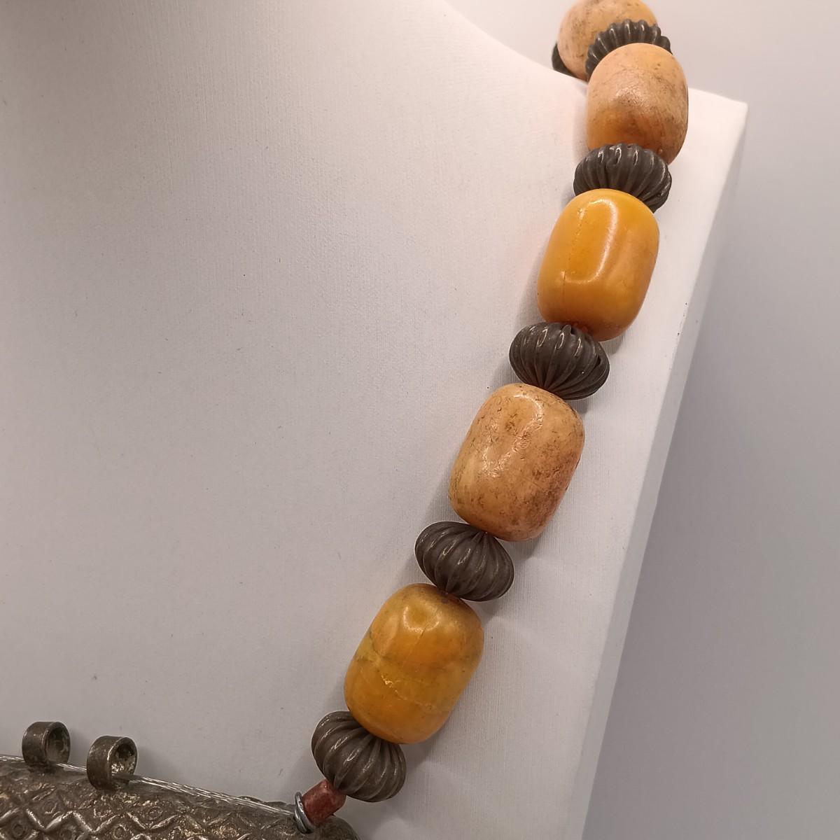 The large silver-tone pendant on the Yemeni necklace is dented on one side.